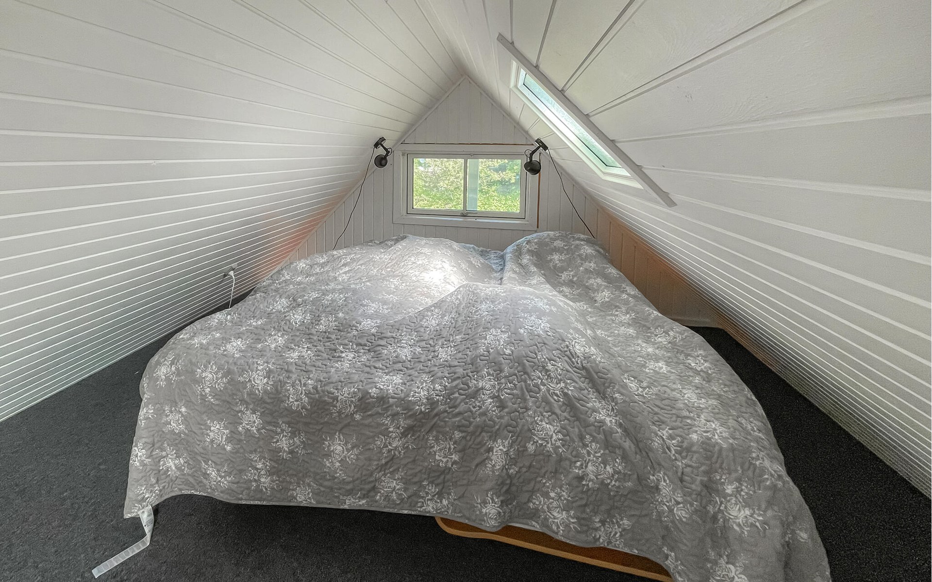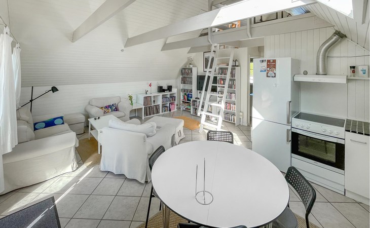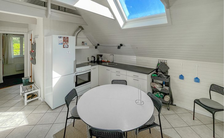 Doe alsof je thuis bent in de lichte woonkamer. Ontspan op de comfortabele banken en maak optimaal gebruik van het open ontwerp dat de woonkamer, keuken en eethoek met elkaar verbindt. Bereid je maaltijden in de praktische keuken en geniet ervan onder een groot dakraam dat veel natuurlijk licht binnenlaat. Ontdek de kleine slaapzolder, die toegankelijk is via een ladder, en gebruik de ruimte als een toevluchtsoord.