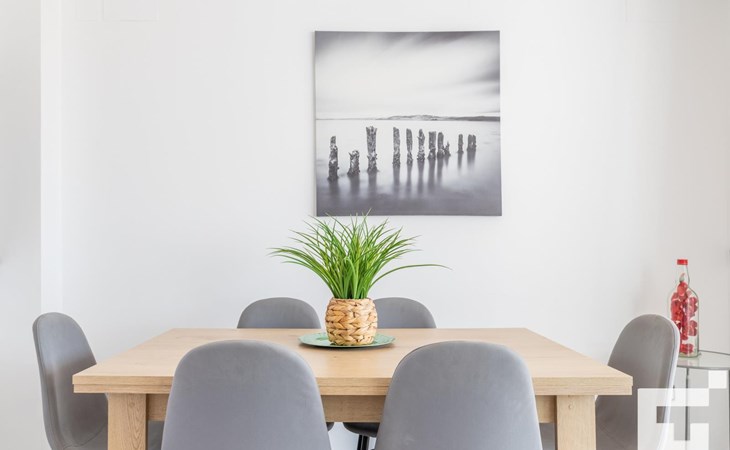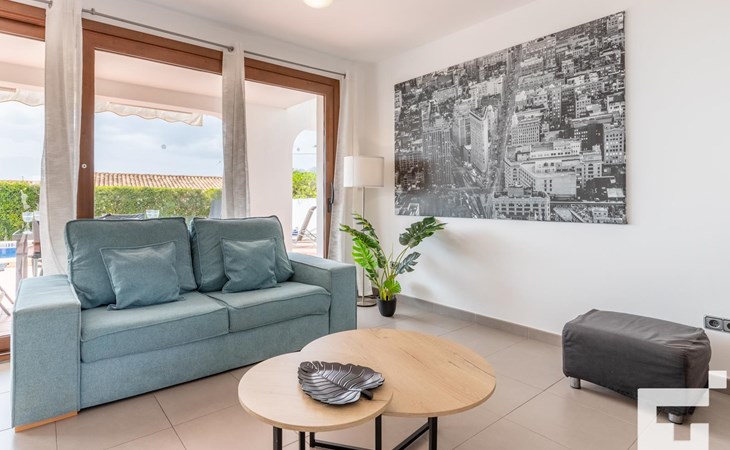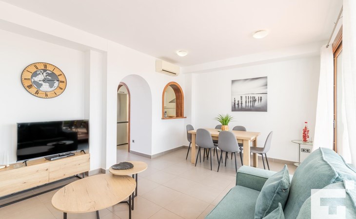 📺 Ruime en zeer lichte woon-eetkamer, uitgerust met tv en toegang tot het gemeubileerde terras.
