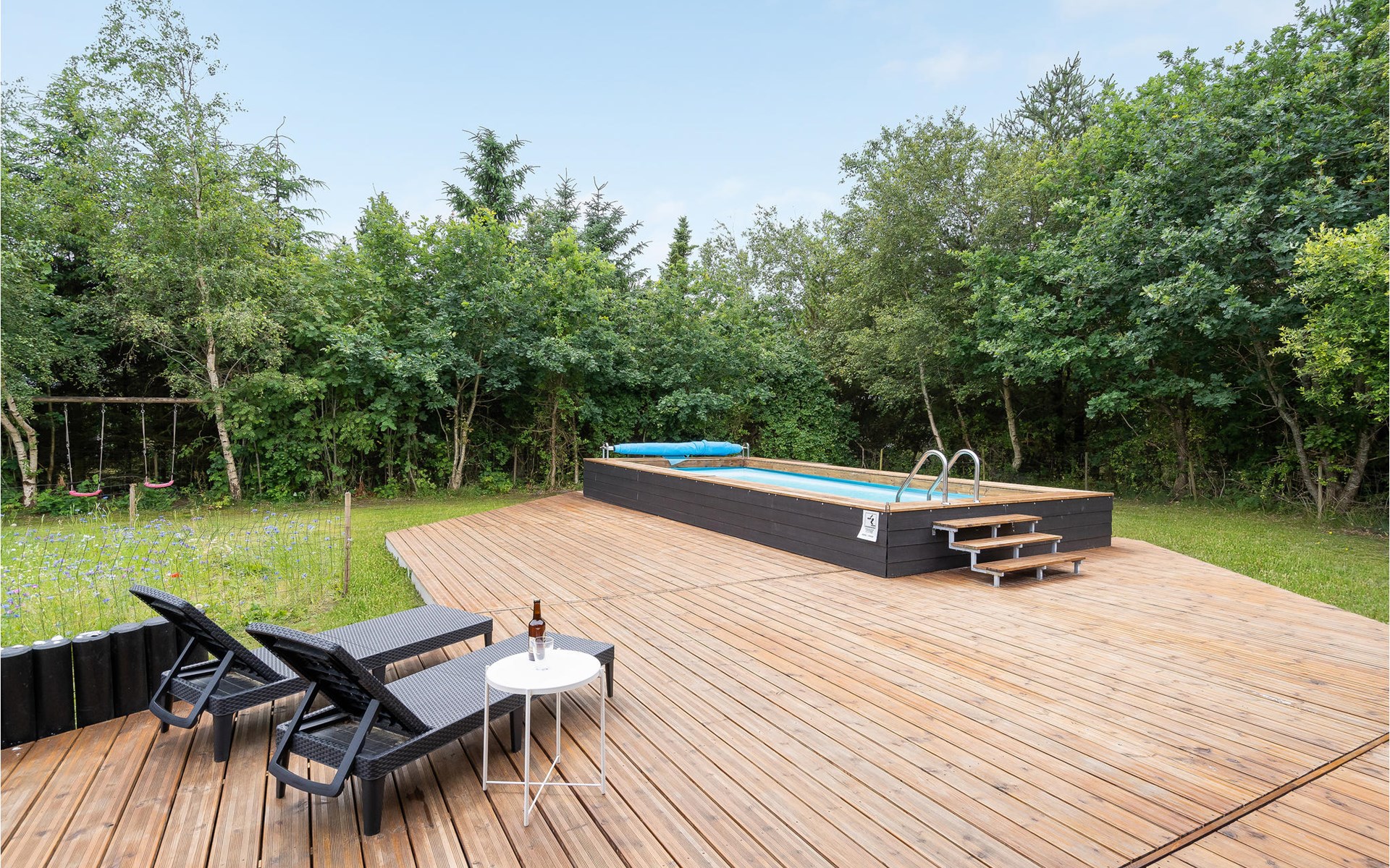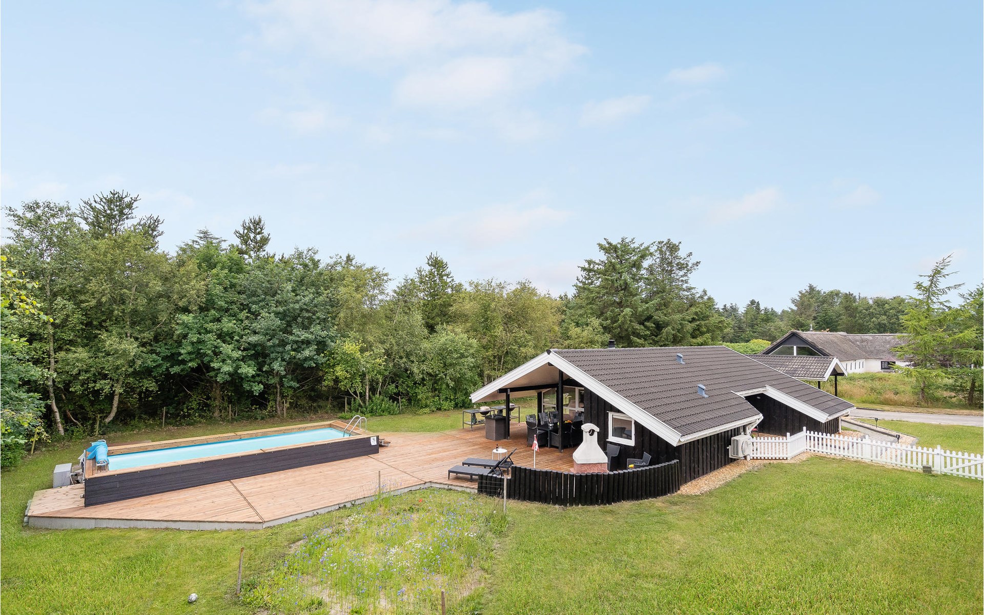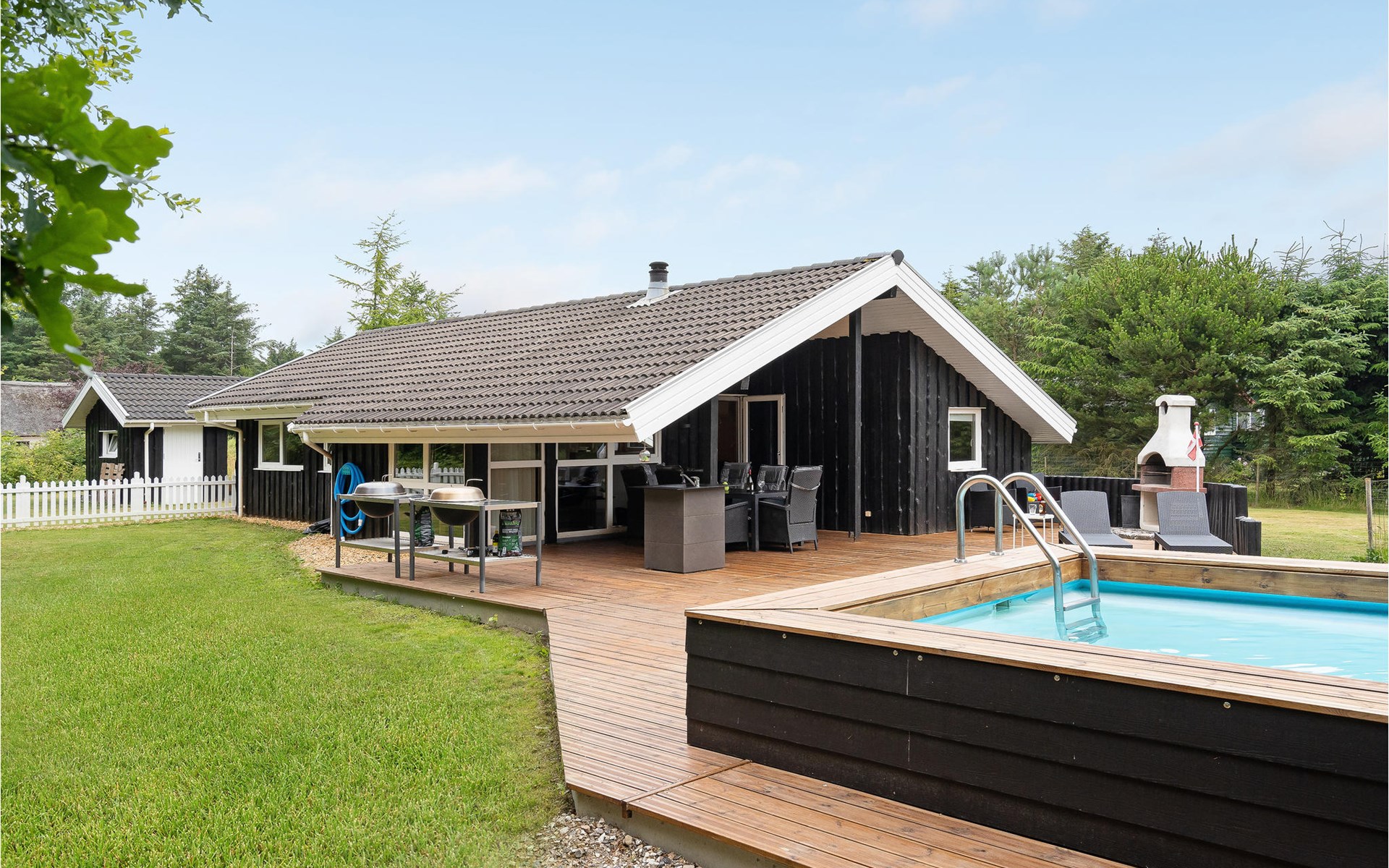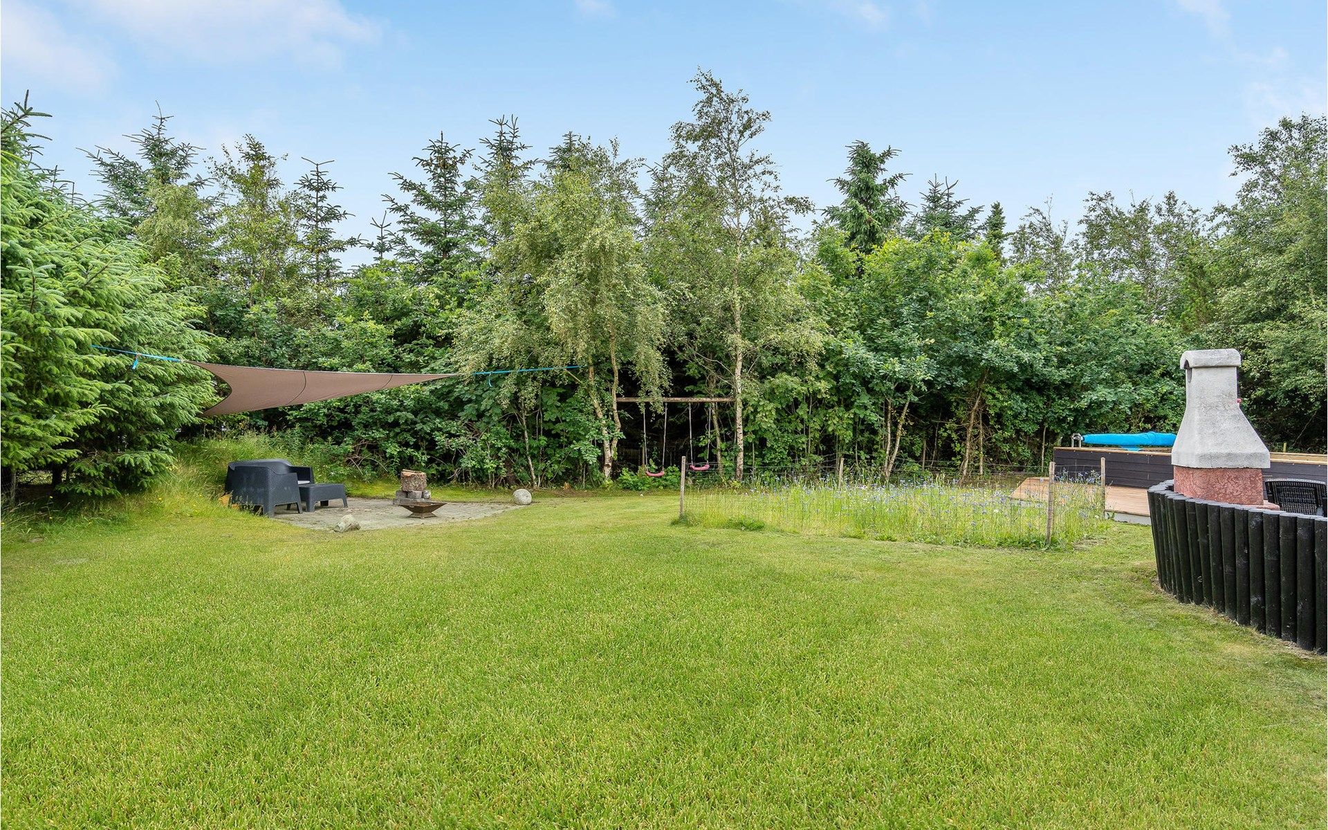 Vanuit de woonkamer heeft u toegang tot een groot terras waar zich het grote hoogtepunt van het huis bevindt - het buitenzwembad. Het zwembad is beschikbaar van week 21 tot week 38. Op het mooie terras kunt u genieten van het spel van de kinderen in het zwembad terwijl de verse aardappelen en groenten worden gewassen in de buitenkeuken. s Avonds, als het koeler wordt, kunt u onder het overdekte terras of in de gezellige gazebo kruipen.