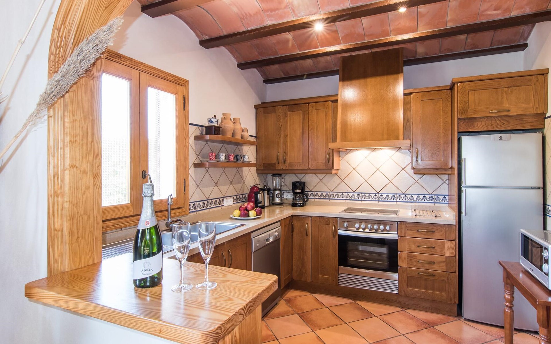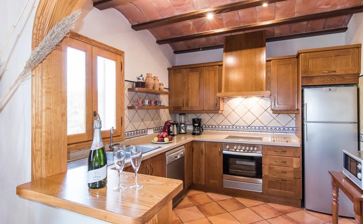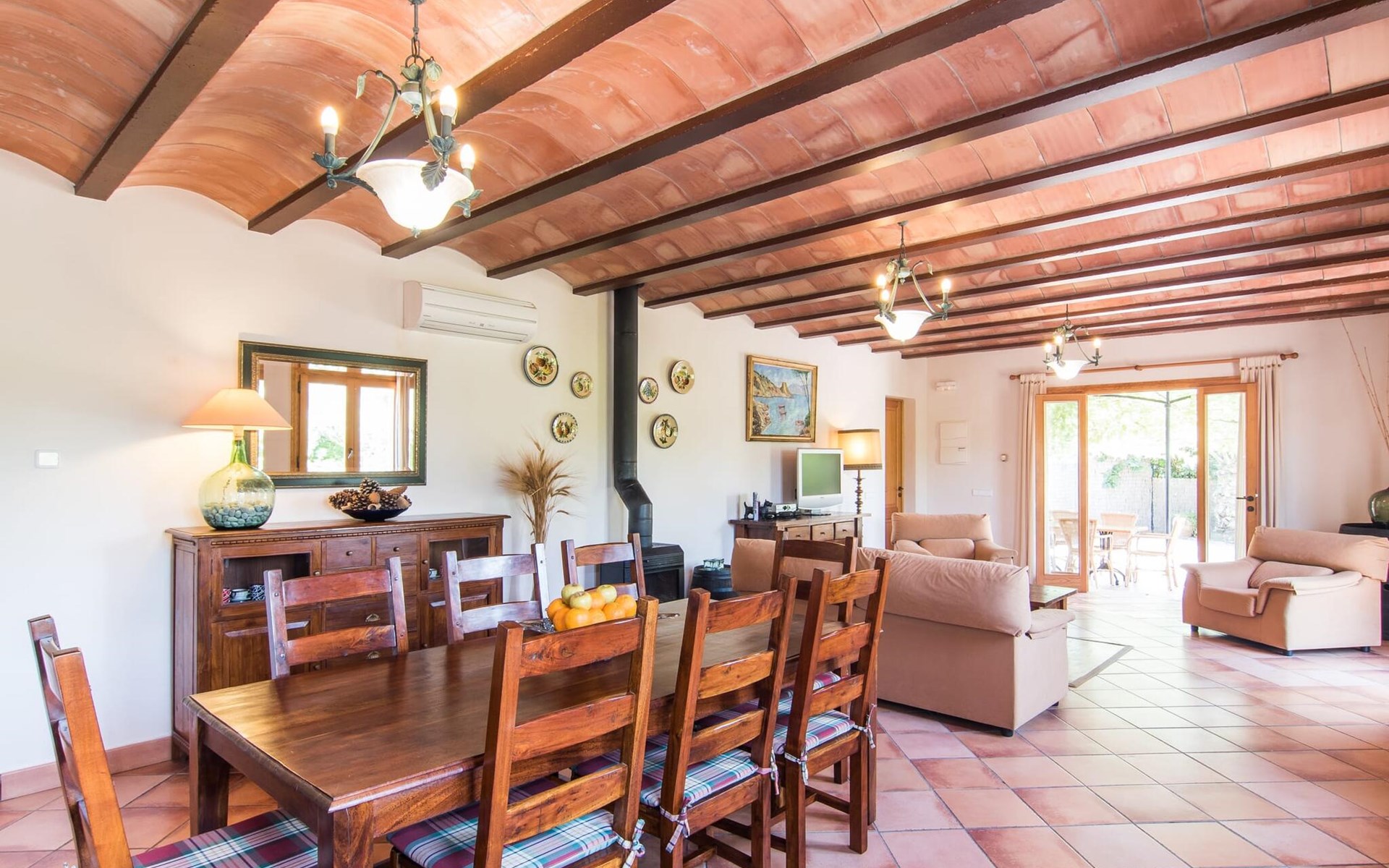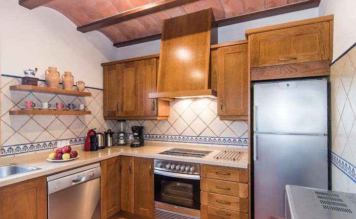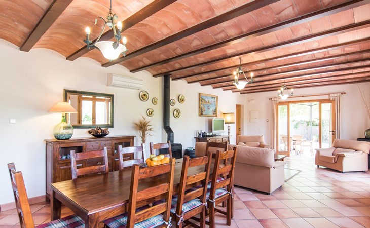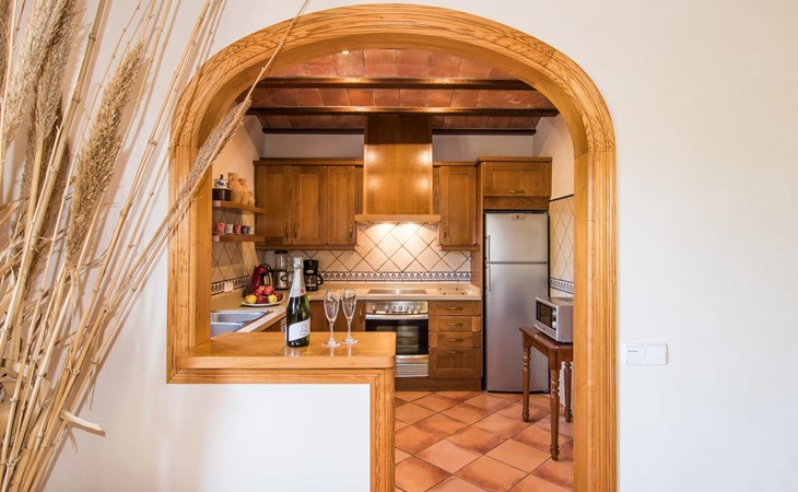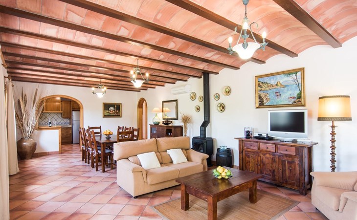 Een licht interieur, gekenmerkt door warme en harmonieuze kleuren, creëert een onmiddellijk gevoel van welzijn; je zult er meteen willen intrekken en je thuis voelen! De mediterrane tegelvloeren en balkenplafonds en bakstenen plafonds vormen een originele en traditionele achtergrond voor dit moderne, smaakvolle en verfijnde interieur. De ruime woon/eetkamer is ingericht met comfortabele fauteuils en een grote eettafel voor smaakvol dineren binnenshuis. Een houtkachel zorgt voor extra gezelligheid wanneer dat nodig is; een stereo-installatie, tv en dvd-speler zijn aanwezig, net als WLAN-internettoegang voor een breed scala aan media-entertainment. Naast de woonkamer ligt de hoogwaardige, volledig uitgeruste moderne keuken, waar je alles vindt wat je nodig hebt voor een onafhankelijke self-catering vakantie, inclusief een Nespresso- en filterkoffiezetapparaat voor je vroege ochtend warme drankje op het terras. Drie slaapkamers met airconditioning, ingericht in individuele en onderscheidende stijl, bieden de setting voor rustgevende nachten. Een badkamer met douche en een met bad en bidet maken het plaatje compleet.