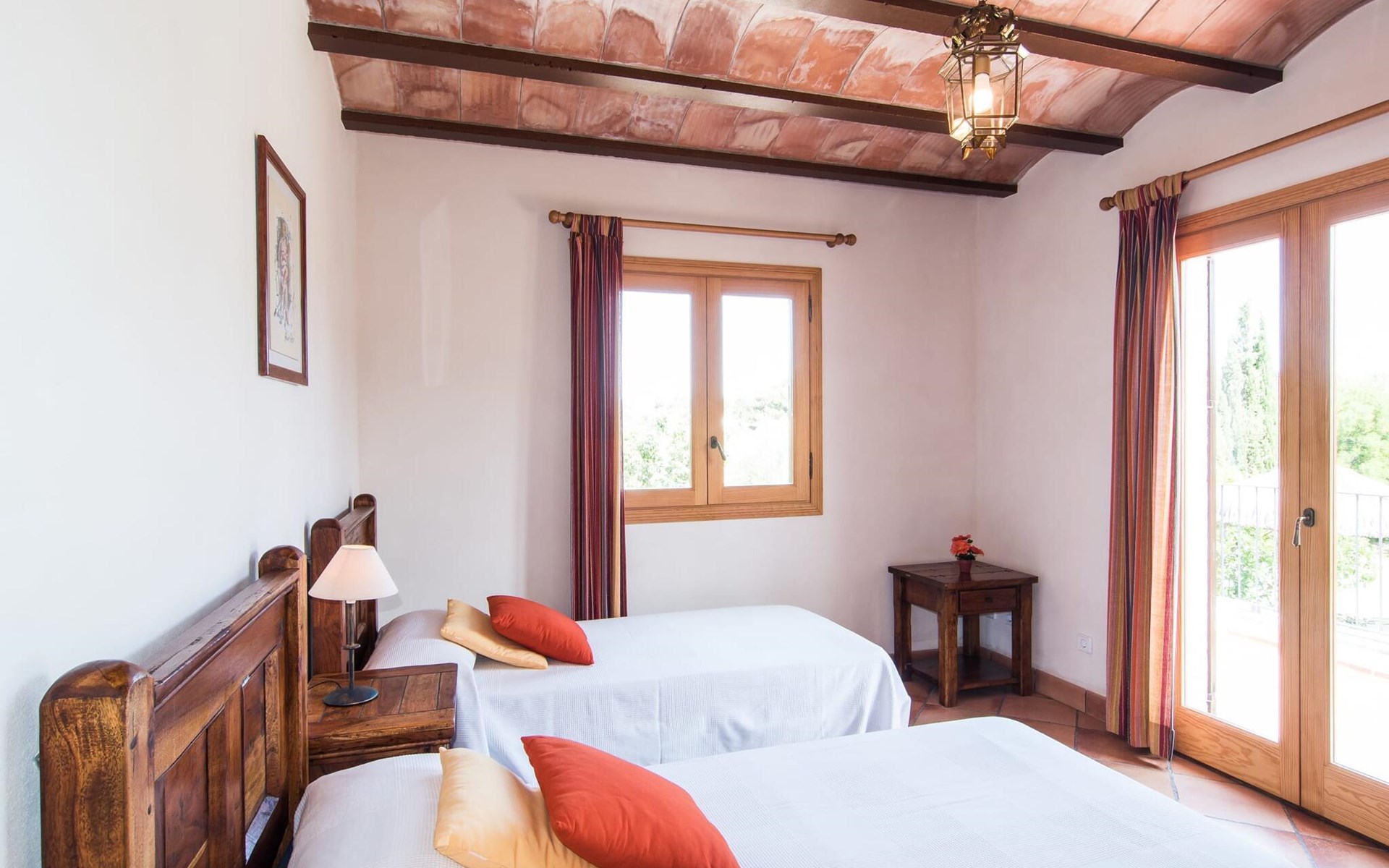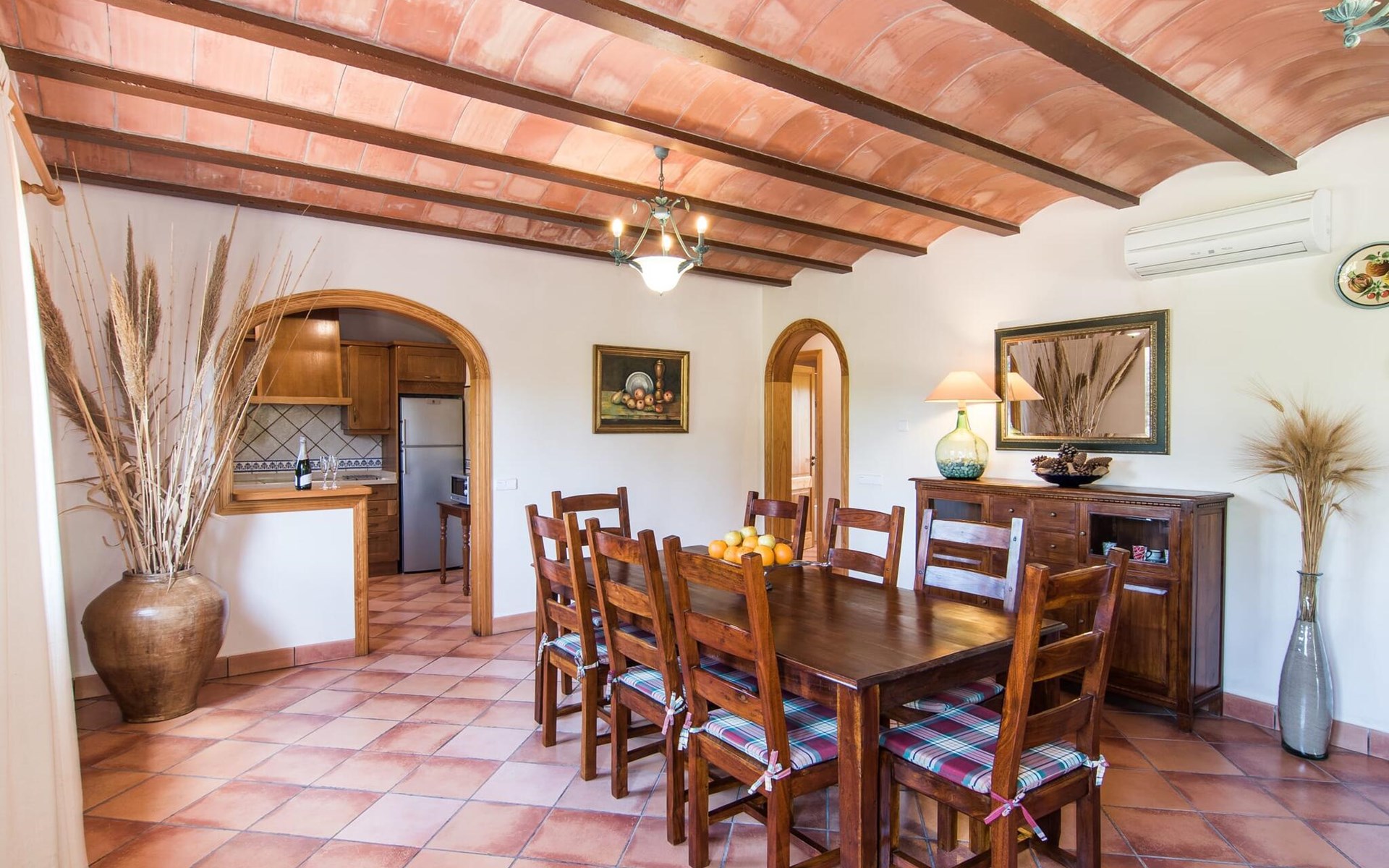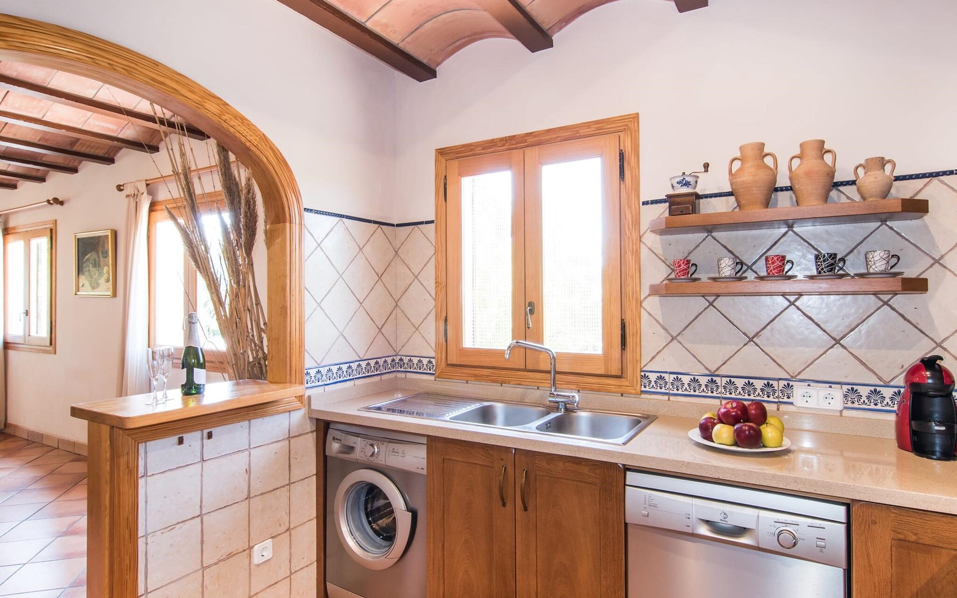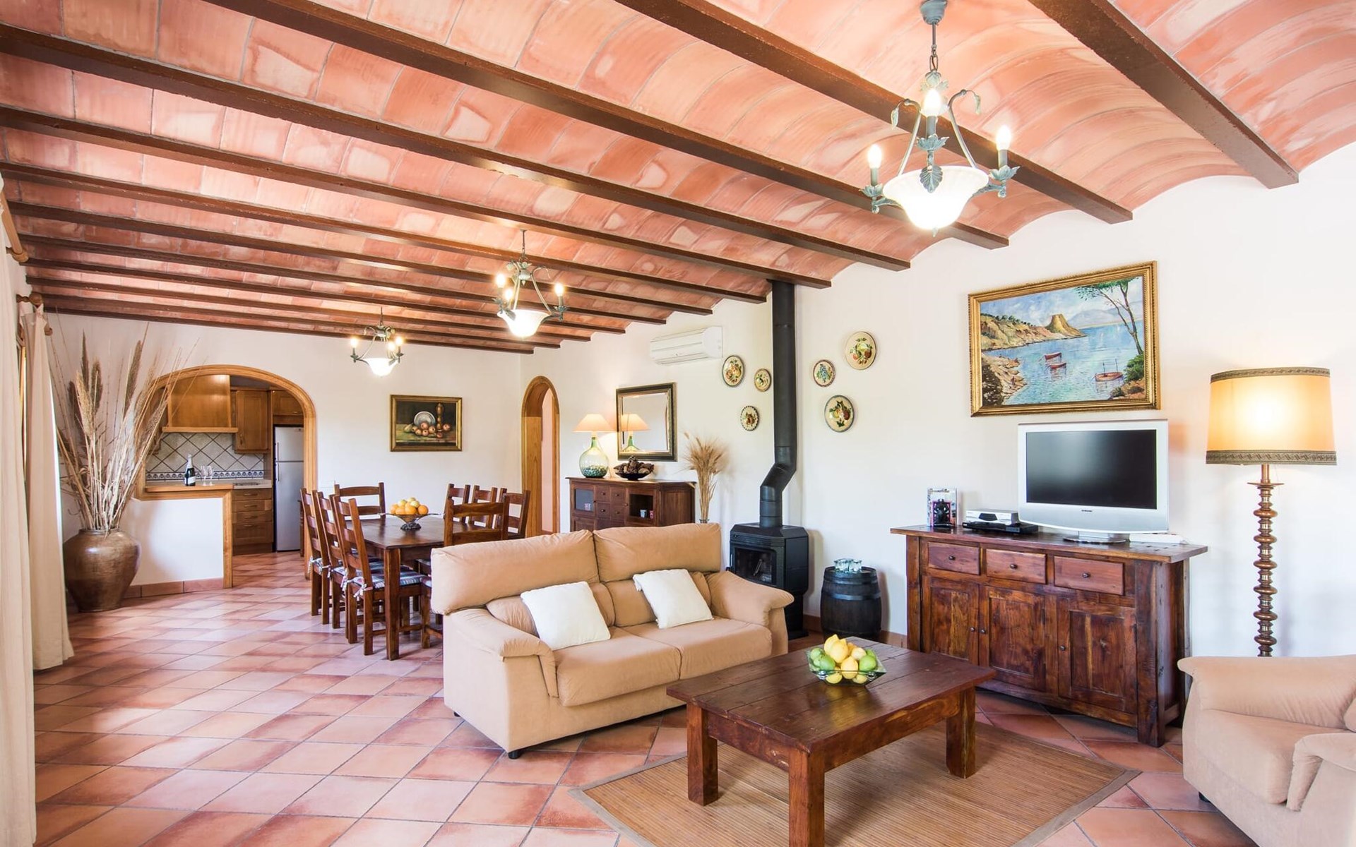 Een licht interieur, gekenmerkt door warme en harmonieuze kleuren, creëert een onmiddellijk gevoel van welzijn; je zult er meteen willen intrekken en je thuis voelen! De mediterrane tegelvloeren en balkenplafonds en bakstenen plafonds vormen een originele en traditionele achtergrond voor dit moderne, smaakvolle en verfijnde interieur. De ruime woon/eetkamer is ingericht met comfortabele fauteuils en een grote eettafel voor smaakvol dineren binnenshuis. Een houtkachel zorgt voor extra gezelligheid wanneer dat nodig is; een stereo-installatie, tv en dvd-speler zijn aanwezig, net als WLAN-internettoegang voor een breed scala aan media-entertainment. Naast de woonkamer ligt de hoogwaardige, volledig uitgeruste moderne keuken, waar je alles vindt wat je nodig hebt voor een onafhankelijke self-catering vakantie, inclusief een Nespresso- en filterkoffiezetapparaat voor je vroege ochtend warme drankje op het terras. Drie slaapkamers met airconditioning, ingericht in individuele en onderscheidende stijl, bieden de setting voor rustgevende nachten. Een badkamer met douche en een met bad en bidet maken het plaatje compleet.