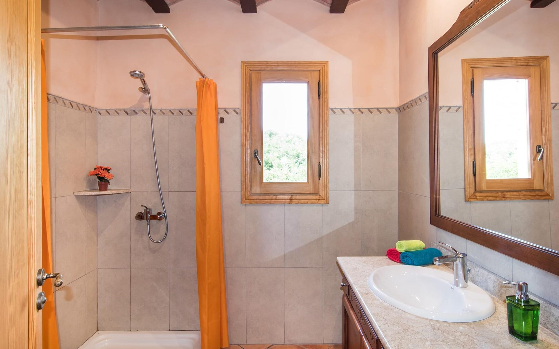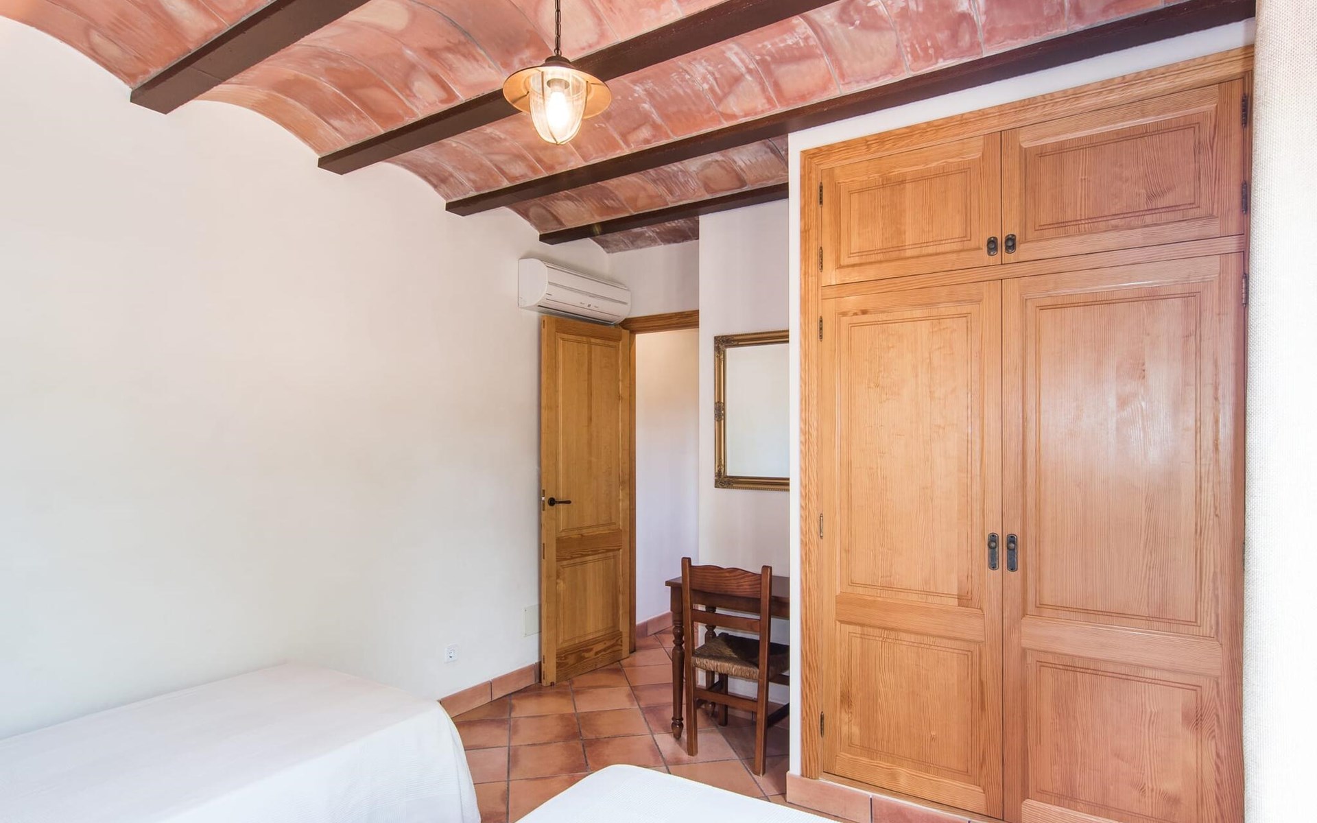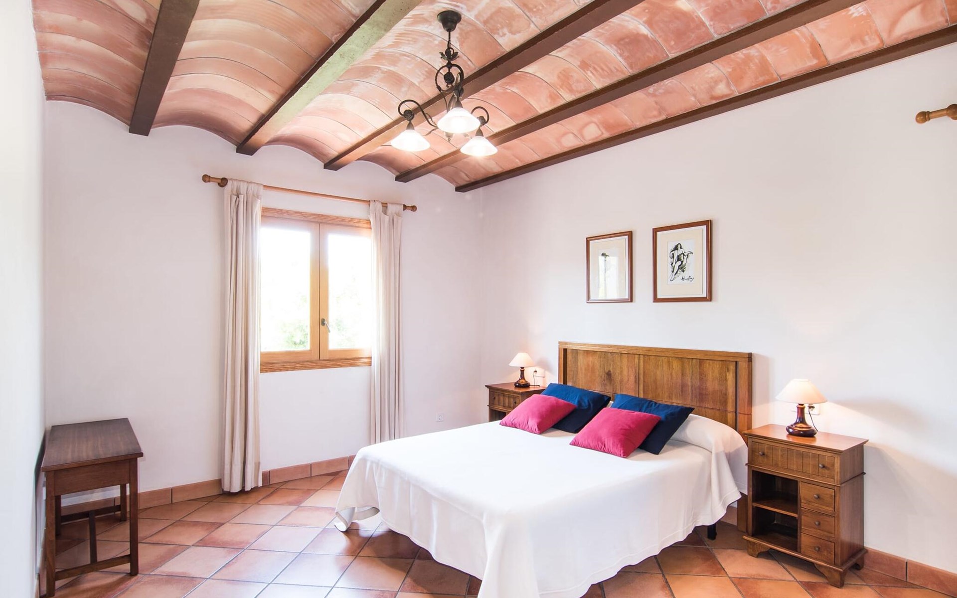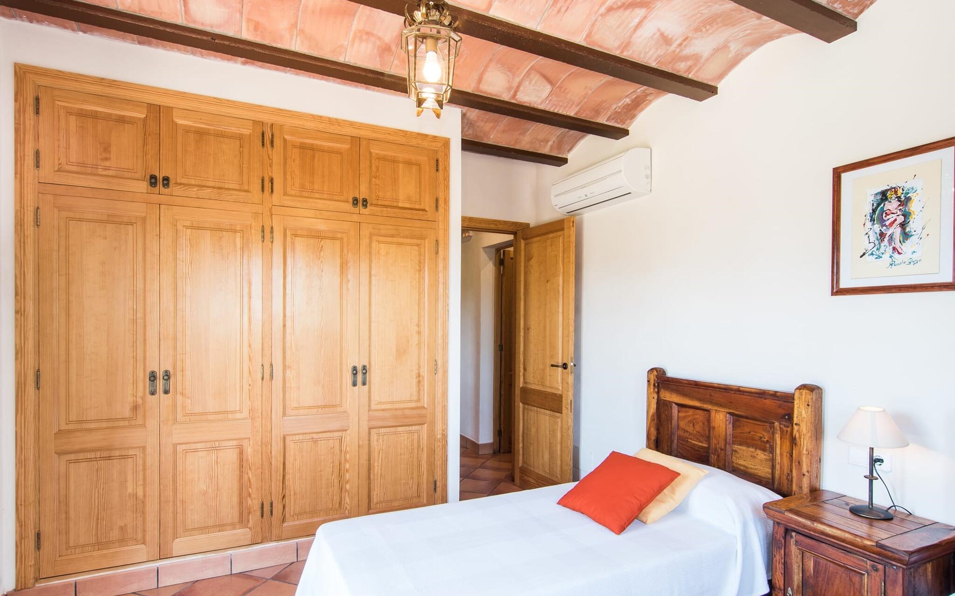 Een licht interieur, gekenmerkt door warme en harmonieuze kleuren, creëert een onmiddellijk gevoel van welzijn; je zult er meteen willen intrekken en je thuis voelen! De mediterrane tegelvloeren en balkenplafonds en bakstenen plafonds vormen een originele en traditionele achtergrond voor dit moderne, smaakvolle en verfijnde interieur. De ruime woon/eetkamer is ingericht met comfortabele fauteuils en een grote eettafel voor smaakvol dineren binnenshuis. Een houtkachel zorgt voor extra gezelligheid wanneer dat nodig is; een stereo-installatie, tv en dvd-speler zijn aanwezig, net als WLAN-internettoegang voor een breed scala aan media-entertainment. Naast de woonkamer ligt de hoogwaardige, volledig uitgeruste moderne keuken, waar je alles vindt wat je nodig hebt voor een onafhankelijke self-catering vakantie, inclusief een Nespresso- en filterkoffiezetapparaat voor je vroege ochtend warme drankje op het terras. Drie slaapkamers met airconditioning, ingericht in individuele en onderscheidende stijl, bieden de setting voor rustgevende nachten. Een badkamer met douche en een met bad en bidet maken het plaatje compleet.