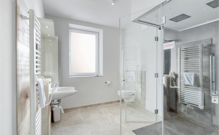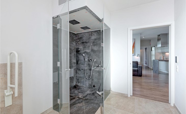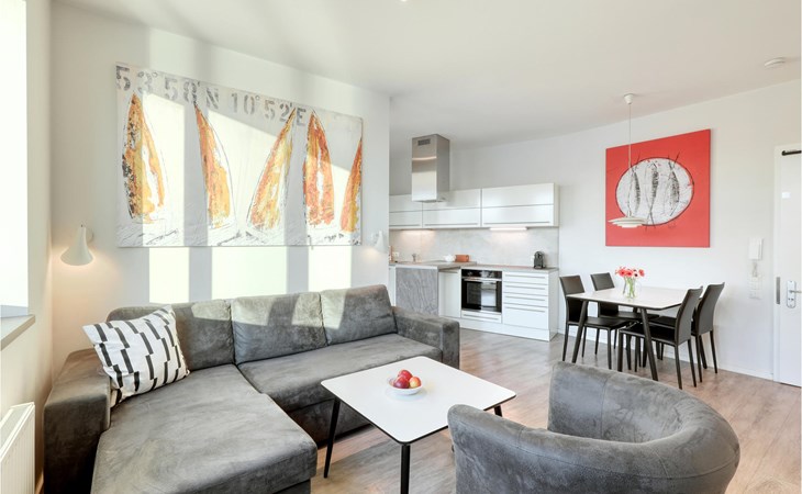 Een klein hoogtepunt is de badkamer, je persoonlijke kleine wellnessruimte met stoombad en geïntegreerde regendouche, die ook toegankelijk is met een rolstoel. Het feelgoodprogramma wordt voortgezet in de woonkamer, waar de flakkerende vlammen van de bio-ethanolhaard de kamer in een bijzonder gezellig licht zetten. In de keuken vinden koffieliefhebbers een Nespresso-apparaat (neem je eigen capsules mee), evenals een thermoskan en een handfilter om je eigen koffie te zetten als je de voorkeur geeft aan klassieke filterkoffie.