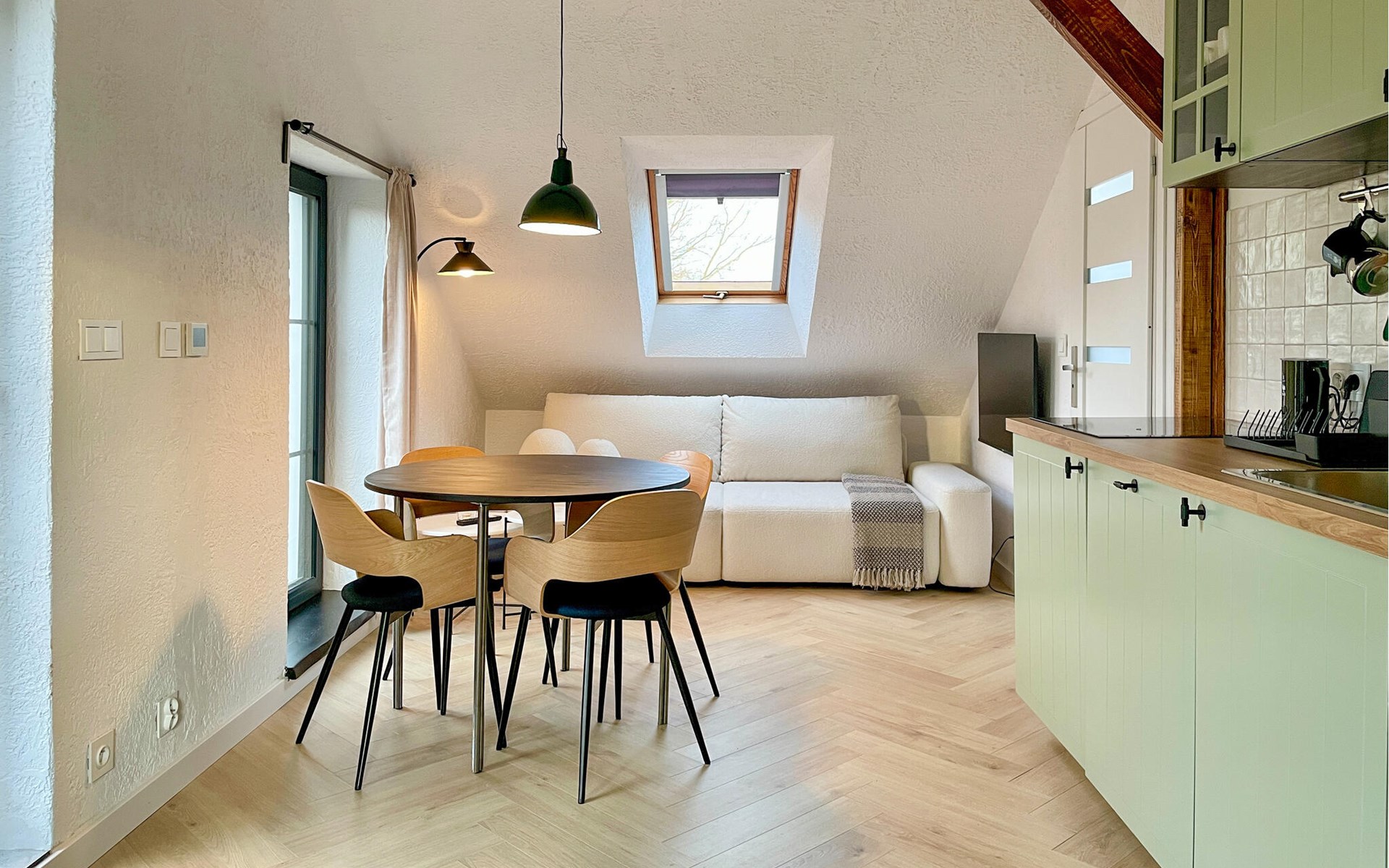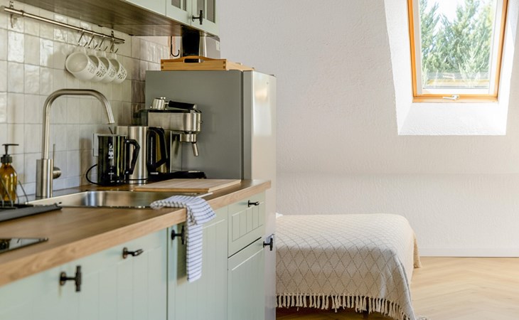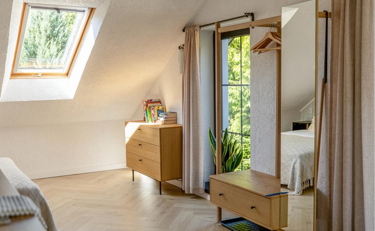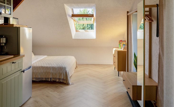 Ervaar rust, natuur en landelijke charme in deze liefdevol ontworpen vakantiewoning. In de woonkamer zorgt de combinatie van warm hout, zachte kleuren en rustieke balken voor een harmonieuze sfeer. Ontspan op de comfortabele bank, geniet van een maaltijd aan de ronde eettafel of bereid je favoriete gerechten in de praktische keuken.