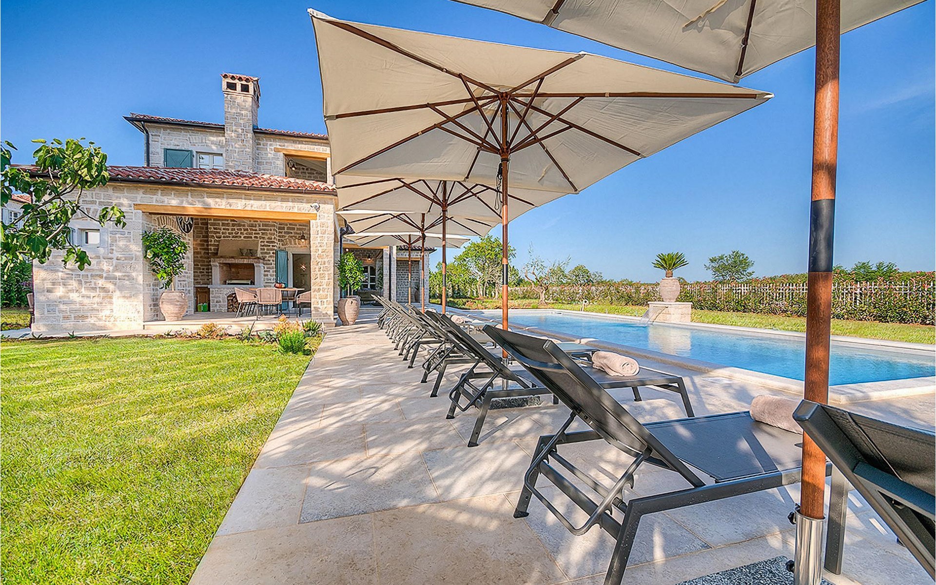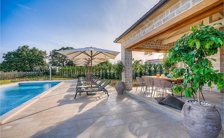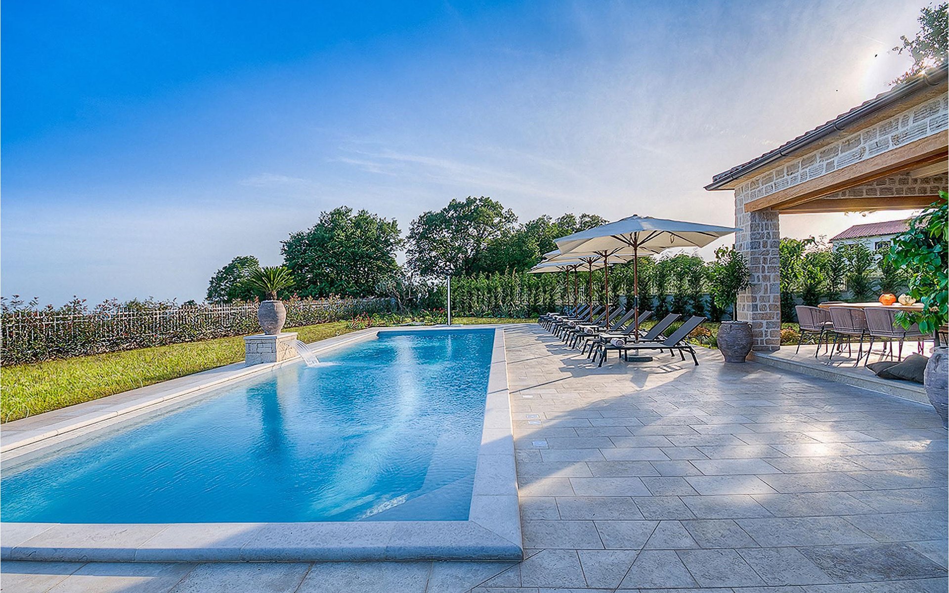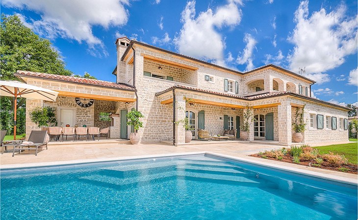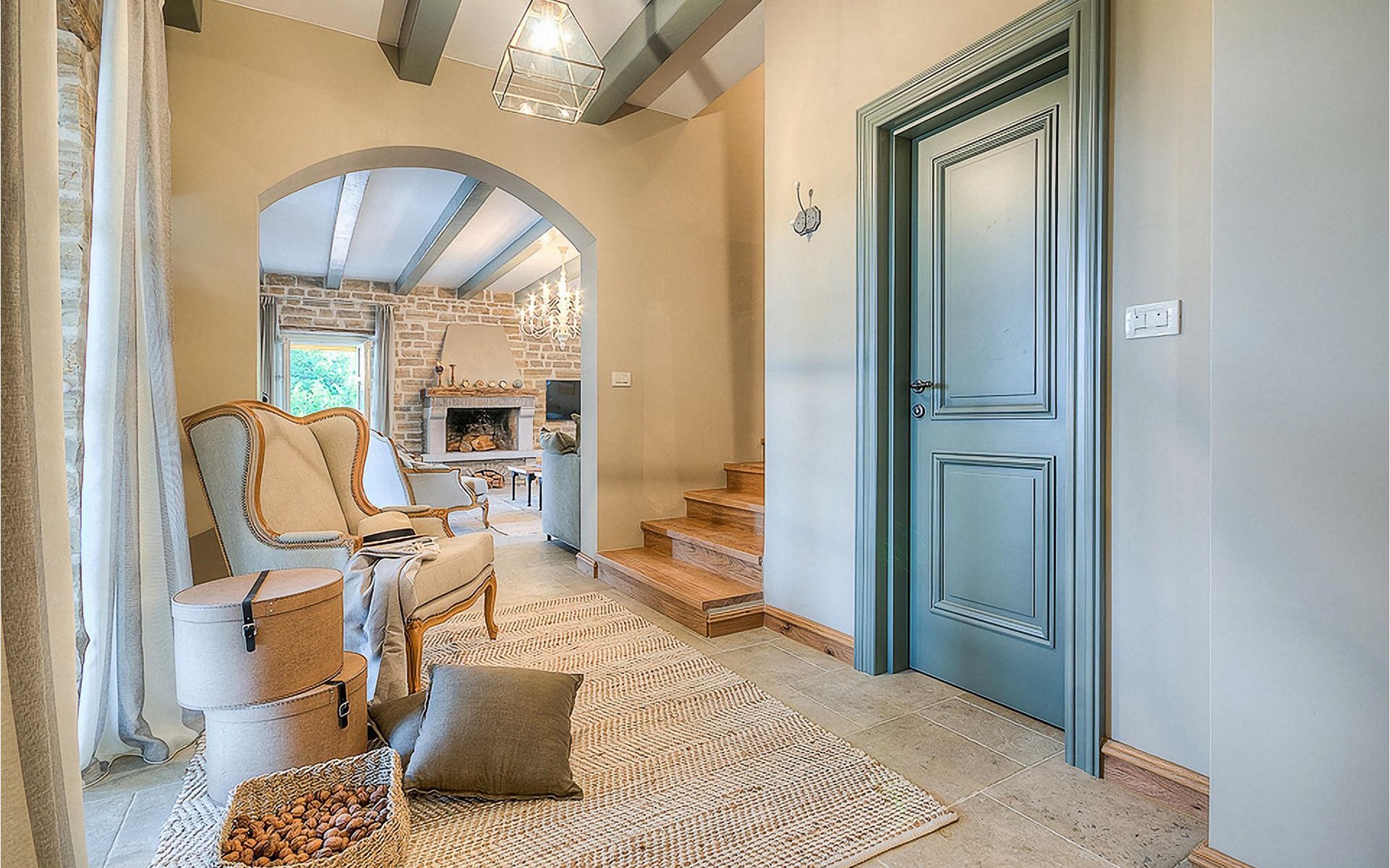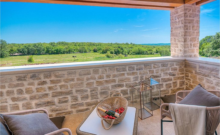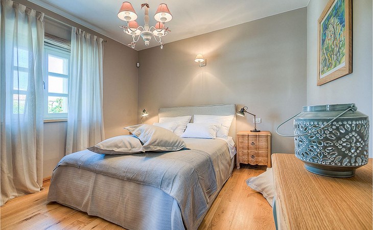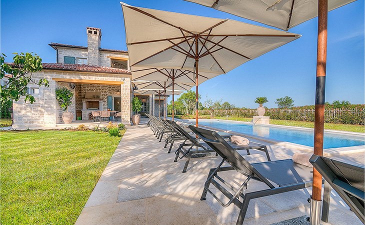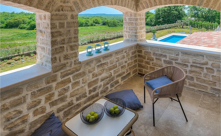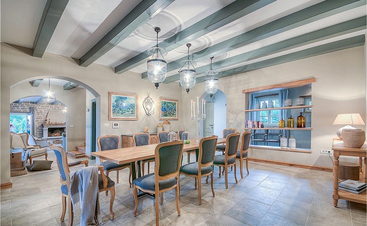Elegant, stijlvol en prachtig gelegen te midden van het schilderachtige Istrische platteland, maar toch dicht bij zonnige stranden en levendige kustplaatsen, biedt Villa Nevia luxe accommodatie waar u kunt ontspannen en genieten van elke minuut van uw vakantie. De begane grond is volledig gewijd aan uitbundig entertainment. De heerlijk ruime kamer is verdeeld door een stenen boog in een woon-, eet- en kookgedeelte, met grote openslaande deuren die een overvloed aan warm Istrisch licht binnenbrengen. Natuurstenen muren, plafonds met houten balken en de prachtige open haard creëren een warme, gezellige sfeer, terwijl de mix van modern en vintage meubilair en een uitstekende inrichting u voorzien van eersteklas comfort. Drie slaapkamers zijn verdeeld over de bovenverdieping, terwijl de andere twee op de begane grond direct uitkomen op het verleidelijke privézwembad, een heerlijke plek om te ontspannen en tot rust te komen. De mooie, overdekte veranda met authentieke ingebouwde barbecue en grote eettafel is een aantrekkelijk toevluchtsoord voor de zomerhitte, maar ook de perfecte plek om gezellig buiten te eten.