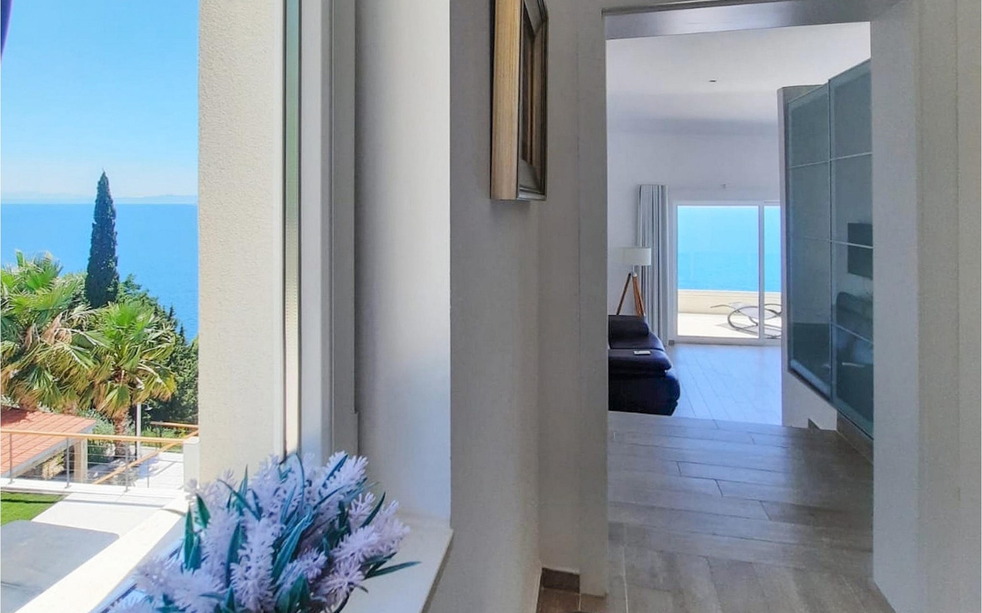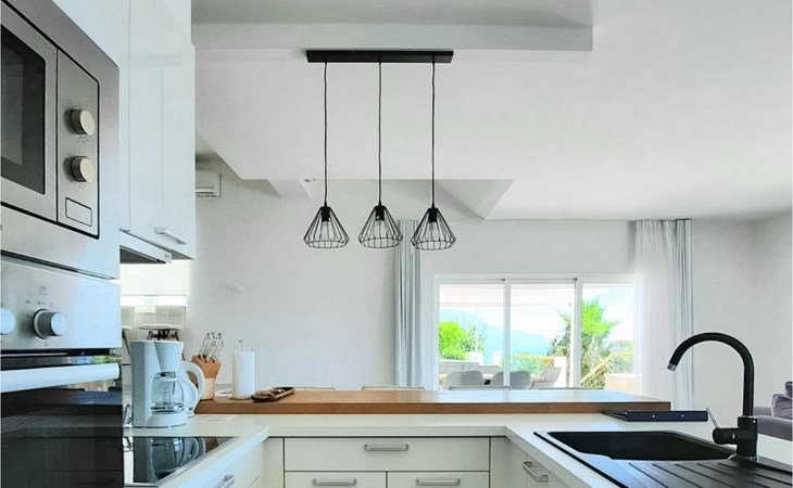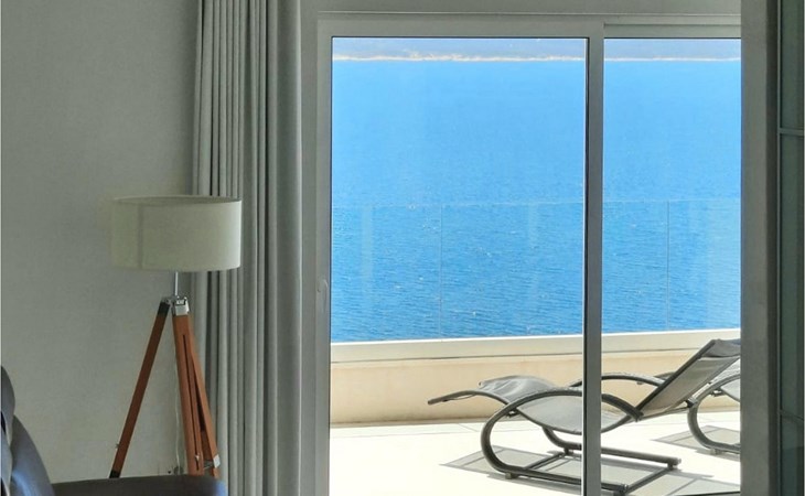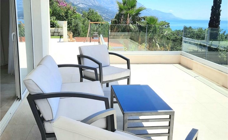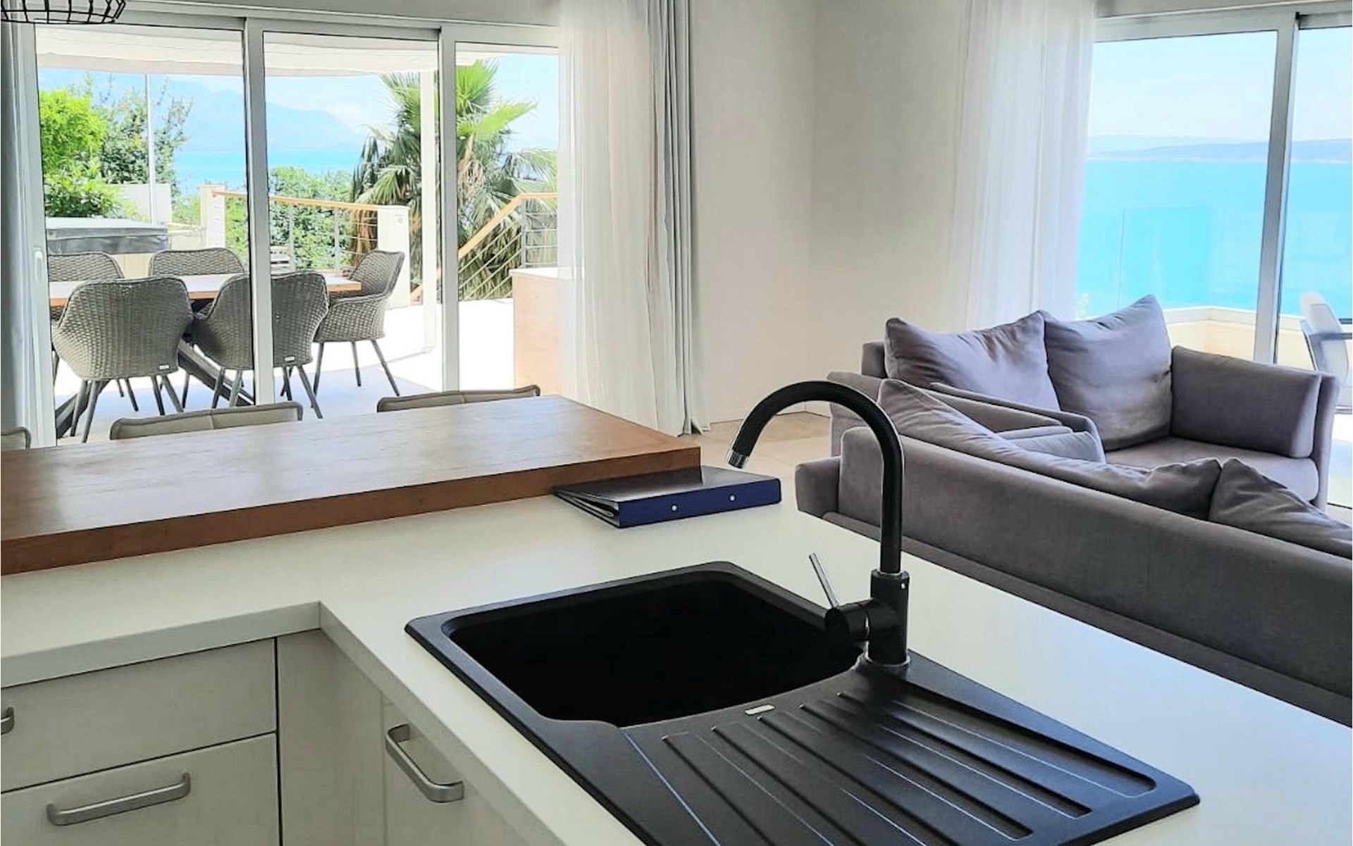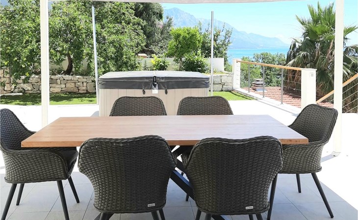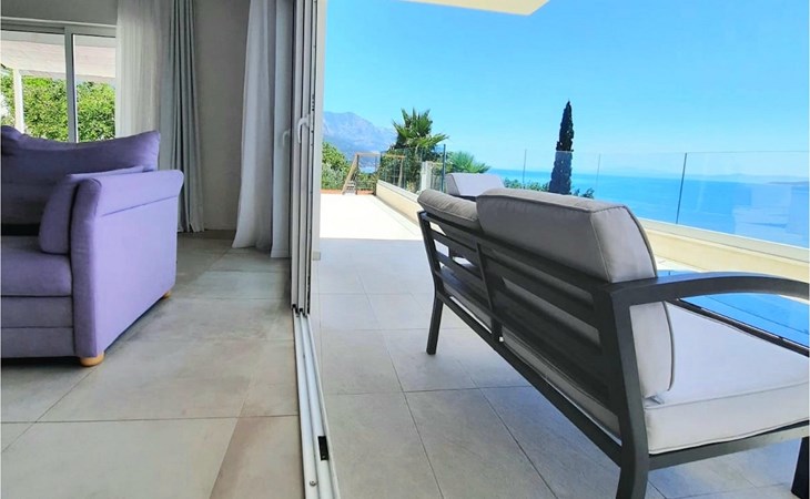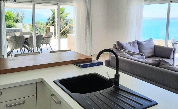 De villa heeft twee terrassen die beide een fenomenaal panoramisch uitzicht op zee bieden. Op het onderste terras is er een privézwembad en ligstoelen eromheen, voor maximale ontspanning in of naast het zwembad. Het overdekte deel van het terras bij het zwembad is uitgerust met een hoge tafel en stoelen, evenals een barbecue, voor die momenten dat je bescherming tegen de zon nodig hebt. Palmbomen, olijfbomen en andere planten rondom beide terrassen zorgen voor een nog completere mediterrane sfeer. Als je de trap naar het bovenste terras beklimt, wacht je nog een verrassing - een buiten bubbelbad! Aan het eind van de dag kun je dus vanuit het bubbelbad genieten van de zonsondergang met een glas van je favoriete drankje. Er is een eettafel aan de ene kant voor gemeenschappelijke maaltijden en een lounge met direct uitzicht op zee aan de andere kant, de perfecte plek voor een kopje koffie 's ochtends. Glazen deuren in deze gebieden van het bovenste terras geven direct toegang tot de woonkamer op de begane grond van de villa. Met veel lichtbronnen voelt de open indeling van de woonkamer, eetkamer en volledig uitgeruste keuken nog ruimer en luchtiger aan. De neutrale inrichting van het exterieur en interieur van de villa vullen elkaar perfect aan en zorgen voor continuïteit in de hele ruimte.