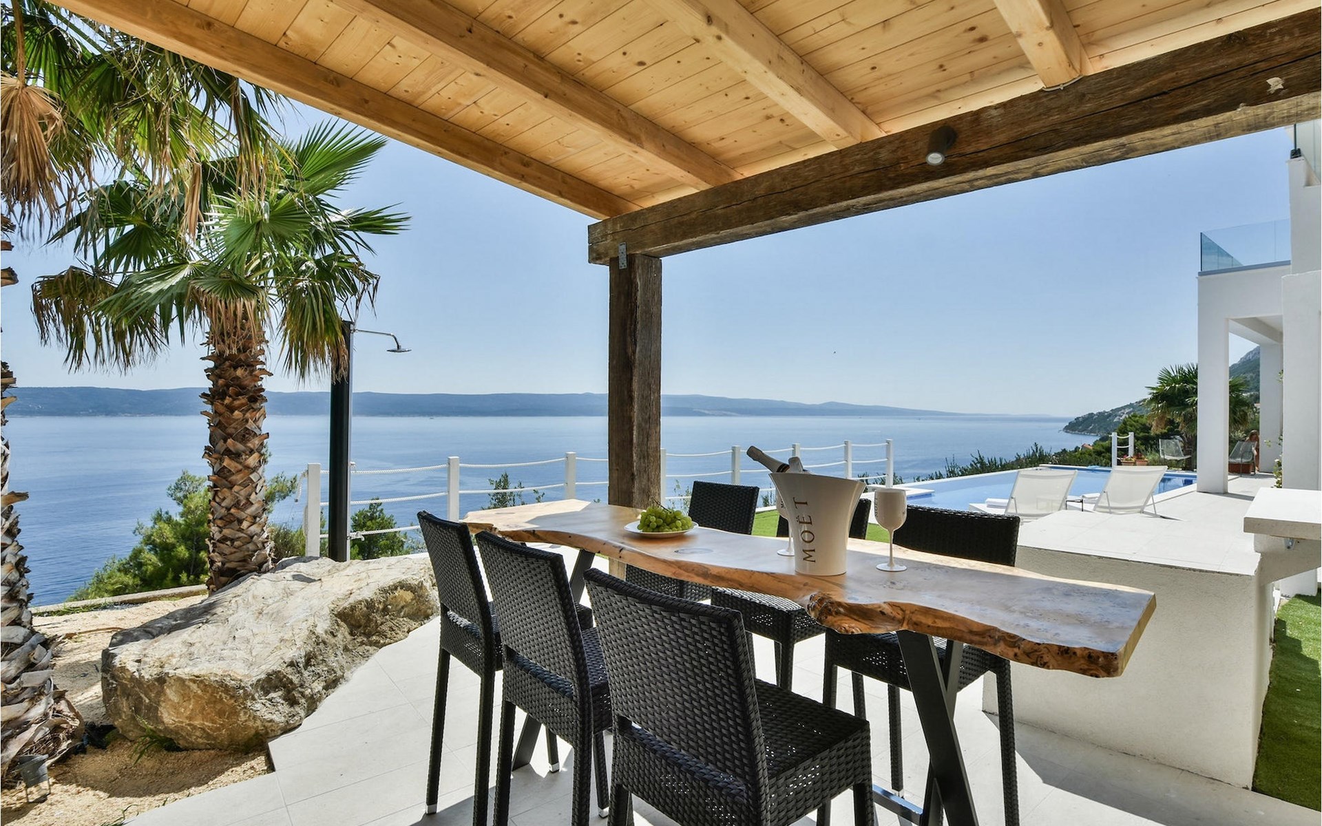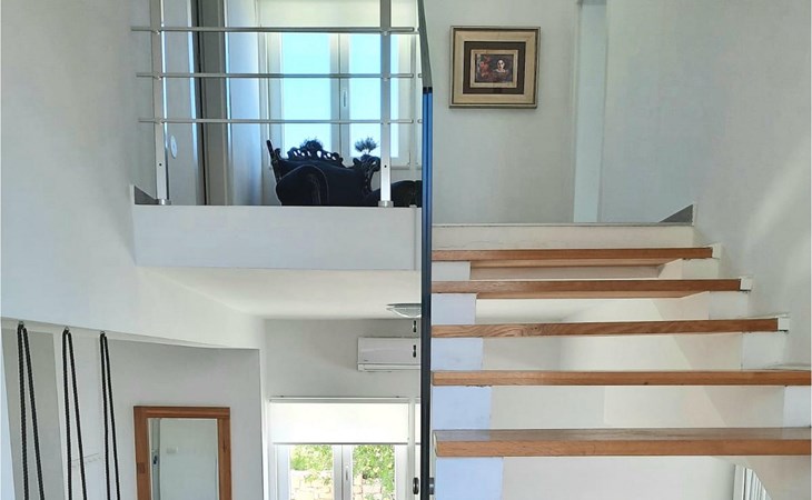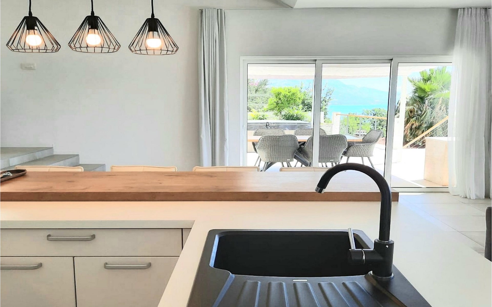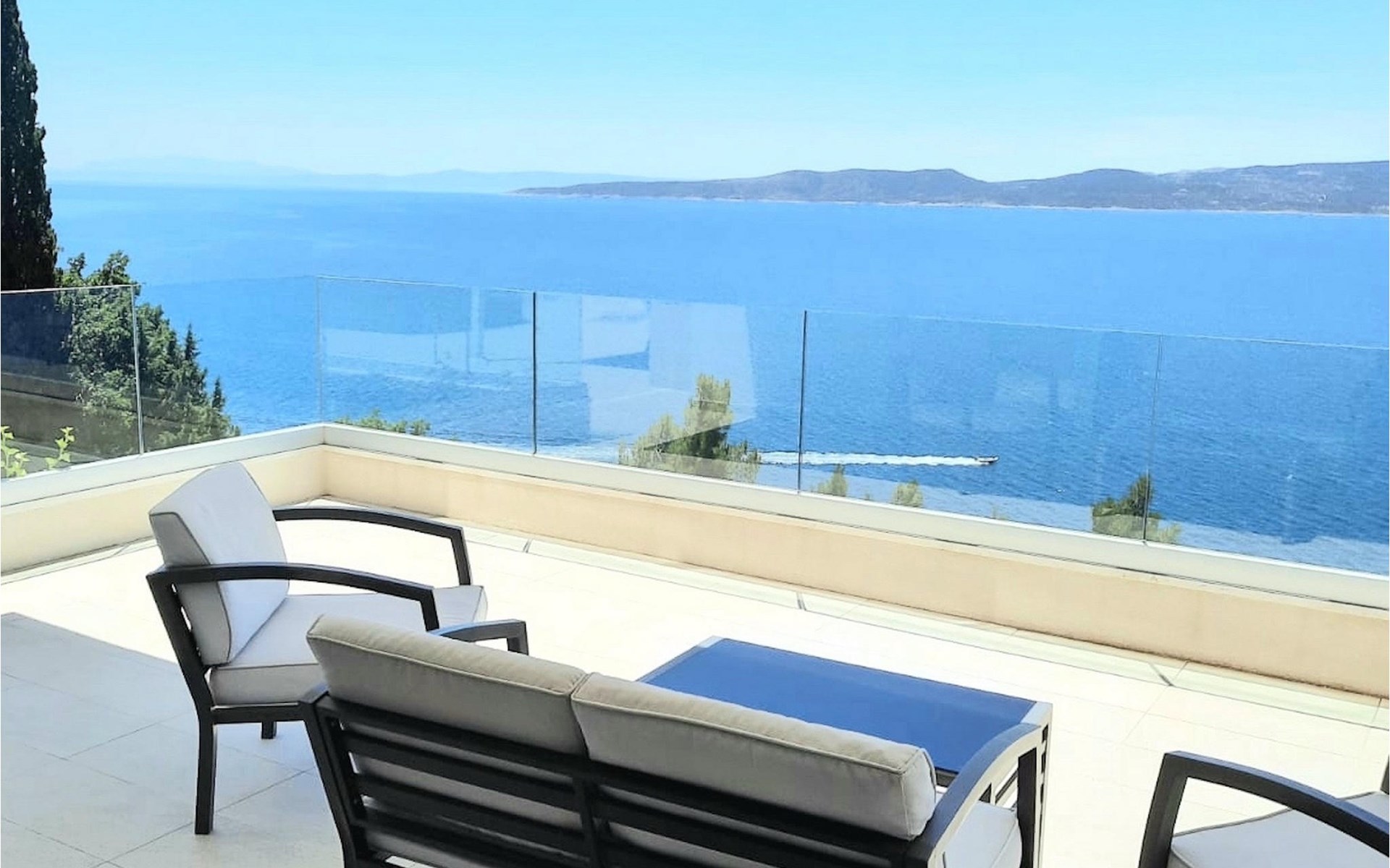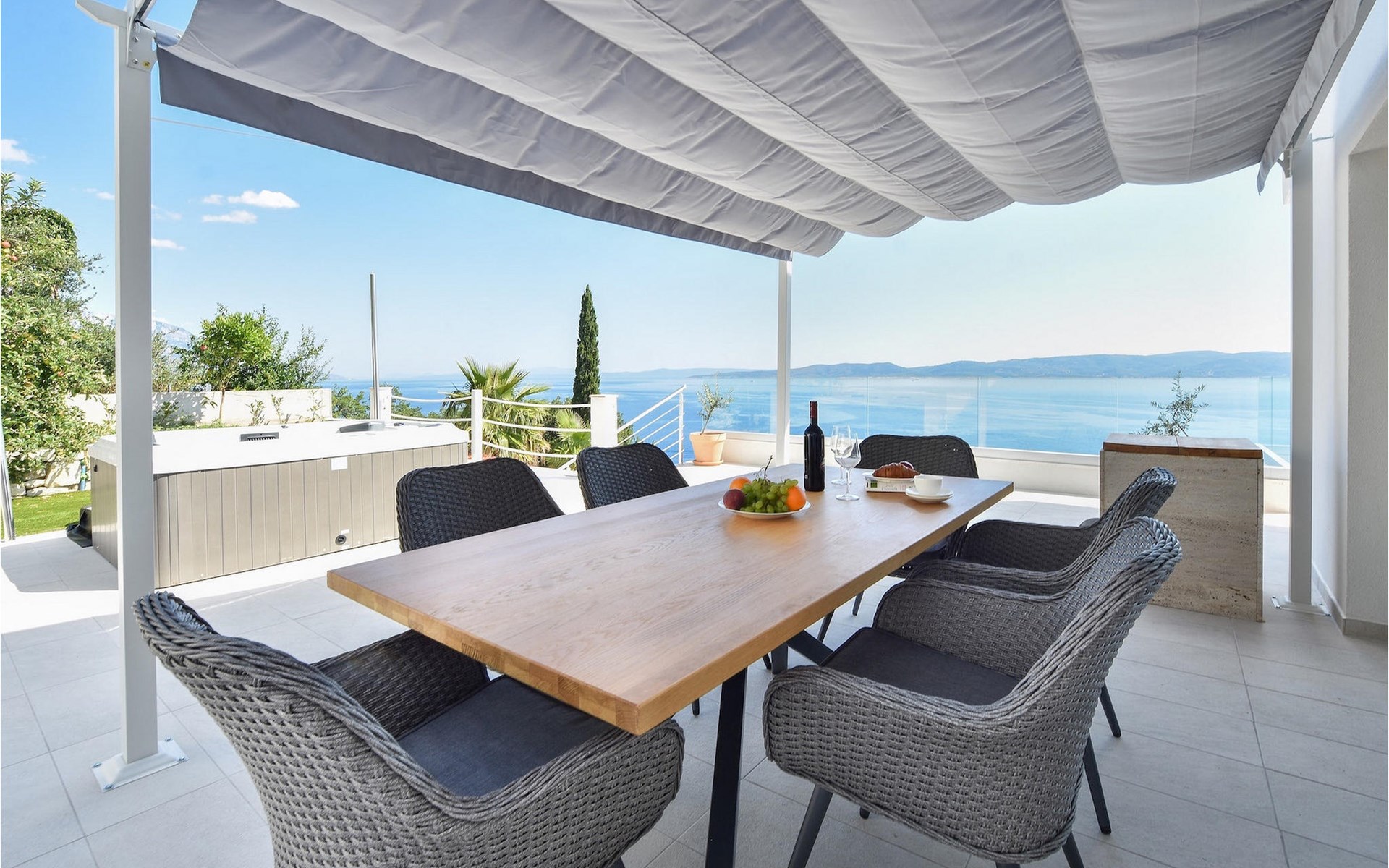 De villa heeft twee terrassen die beide een fenomenaal panoramisch uitzicht op zee bieden. Op het onderste terras is er een privézwembad en ligstoelen eromheen, voor maximale ontspanning in of naast het zwembad. Het overdekte deel van het terras bij het zwembad is uitgerust met een hoge tafel en stoelen, evenals een barbecue, voor die momenten dat je bescherming tegen de zon nodig hebt. Palmbomen, olijfbomen en andere planten rondom beide terrassen zorgen voor een nog completere mediterrane sfeer. Als je de trap naar het bovenste terras beklimt, wacht je nog een verrassing - een buiten bubbelbad! Aan het eind van de dag kun je dus vanuit het bubbelbad genieten van de zonsondergang met een glas van je favoriete drankje. Er is een eettafel aan de ene kant voor gemeenschappelijke maaltijden en een lounge met direct uitzicht op zee aan de andere kant, de perfecte plek voor een kopje koffie 's ochtends. Glazen deuren in deze gebieden van het bovenste terras geven direct toegang tot de woonkamer op de begane grond van de villa. Met veel lichtbronnen voelt de open indeling van de woonkamer, eetkamer en volledig uitgeruste keuken nog ruimer en luchtiger aan. De neutrale inrichting van het exterieur en interieur van de villa vullen elkaar perfect aan en zorgen voor continuïteit in de hele ruimte.