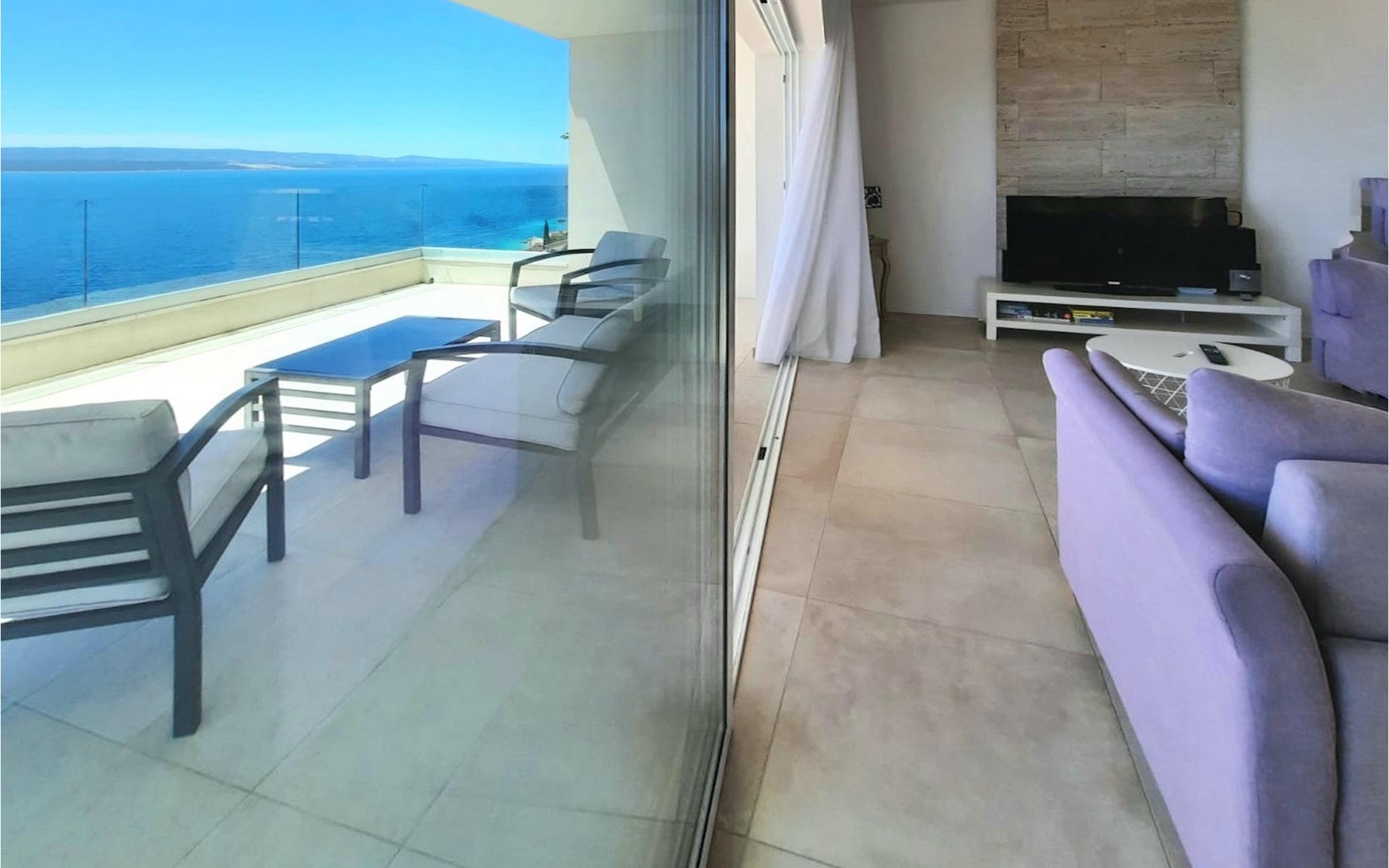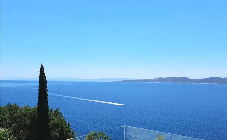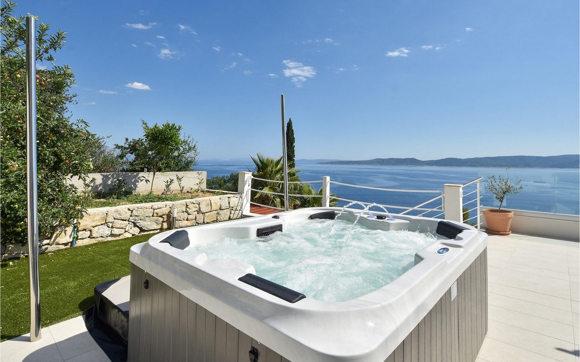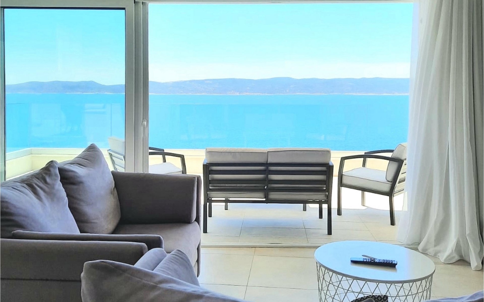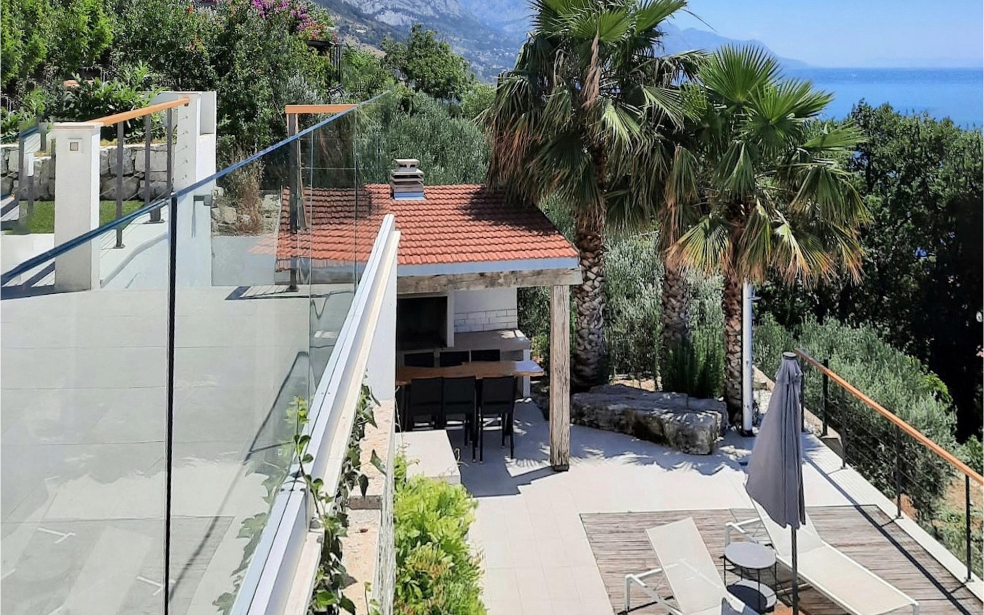 De villa heeft twee terrassen die beide een fenomenaal panoramisch uitzicht op zee bieden. Op het onderste terras is er een privézwembad en ligstoelen eromheen, voor maximale ontspanning in of naast het zwembad. Het overdekte deel van het terras bij het zwembad is uitgerust met een hoge tafel en stoelen, evenals een barbecue, voor die momenten dat je bescherming tegen de zon nodig hebt. Palmbomen, olijfbomen en andere planten rondom beide terrassen zorgen voor een nog completere mediterrane sfeer. Als je de trap naar het bovenste terras beklimt, wacht je nog een verrassing - een buiten bubbelbad! Aan het eind van de dag kun je dus vanuit het bubbelbad genieten van de zonsondergang met een glas van je favoriete drankje. Er is een eettafel aan de ene kant voor gemeenschappelijke maaltijden en een lounge met direct uitzicht op zee aan de andere kant, de perfecte plek voor een kopje koffie 's ochtends. Glazen deuren in deze gebieden van het bovenste terras geven direct toegang tot de woonkamer op de begane grond van de villa. Met veel lichtbronnen voelt de open indeling van de woonkamer, eetkamer en volledig uitgeruste keuken nog ruimer en luchtiger aan. De neutrale inrichting van het exterieur en interieur van de villa vullen elkaar perfect aan en zorgen voor continuïteit in de hele ruimte.