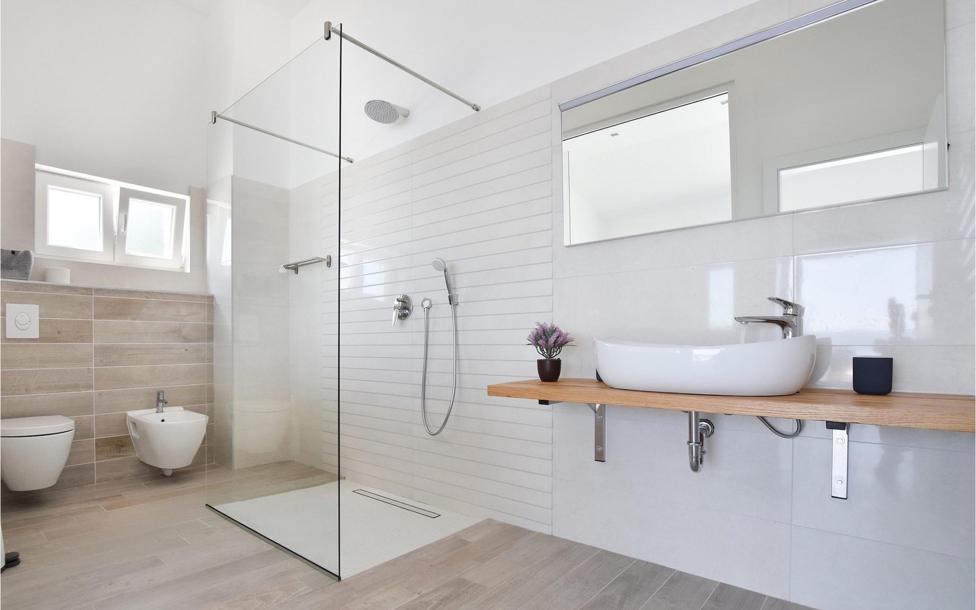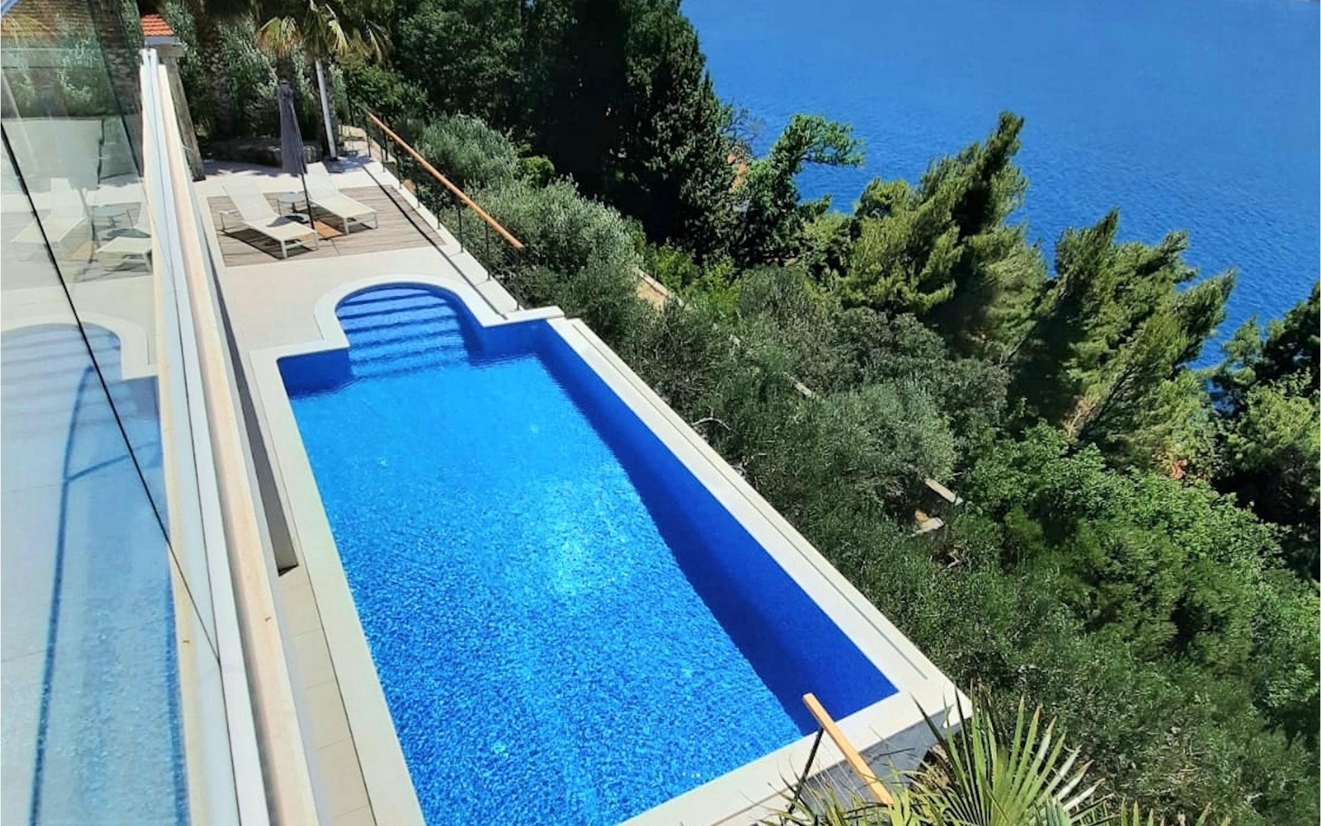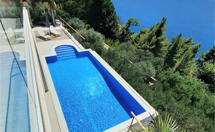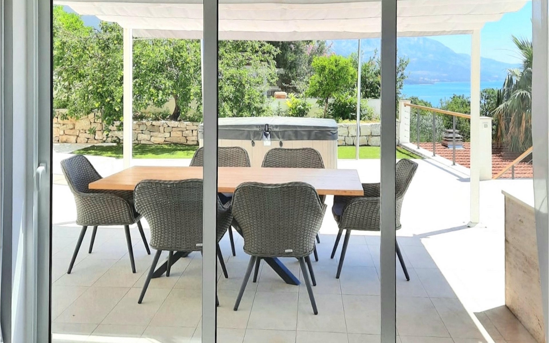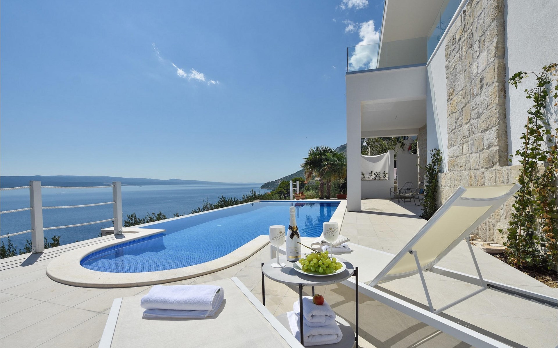 De villa heeft twee terrassen die beide een fenomenaal panoramisch uitzicht op zee bieden. Op het onderste terras is er een privézwembad en ligstoelen eromheen, voor maximale ontspanning in of naast het zwembad. Het overdekte deel van het terras bij het zwembad is uitgerust met een hoge tafel en stoelen, evenals een barbecue, voor die momenten dat je bescherming tegen de zon nodig hebt. Palmbomen, olijfbomen en andere planten rondom beide terrassen zorgen voor een nog completere mediterrane sfeer. Als je de trap naar het bovenste terras beklimt, wacht je nog een verrassing - een buiten bubbelbad! Aan het eind van de dag kun je dus vanuit het bubbelbad genieten van de zonsondergang met een glas van je favoriete drankje. Er is een eettafel aan de ene kant voor gemeenschappelijke maaltijden en een lounge met direct uitzicht op zee aan de andere kant, de perfecte plek voor een kopje koffie 's ochtends. Glazen deuren in deze gebieden van het bovenste terras geven direct toegang tot de woonkamer op de begane grond van de villa. Met veel lichtbronnen voelt de open indeling van de woonkamer, eetkamer en volledig uitgeruste keuken nog ruimer en luchtiger aan. De neutrale inrichting van het exterieur en interieur van de villa vullen elkaar perfect aan en zorgen voor continuïteit in de hele ruimte.