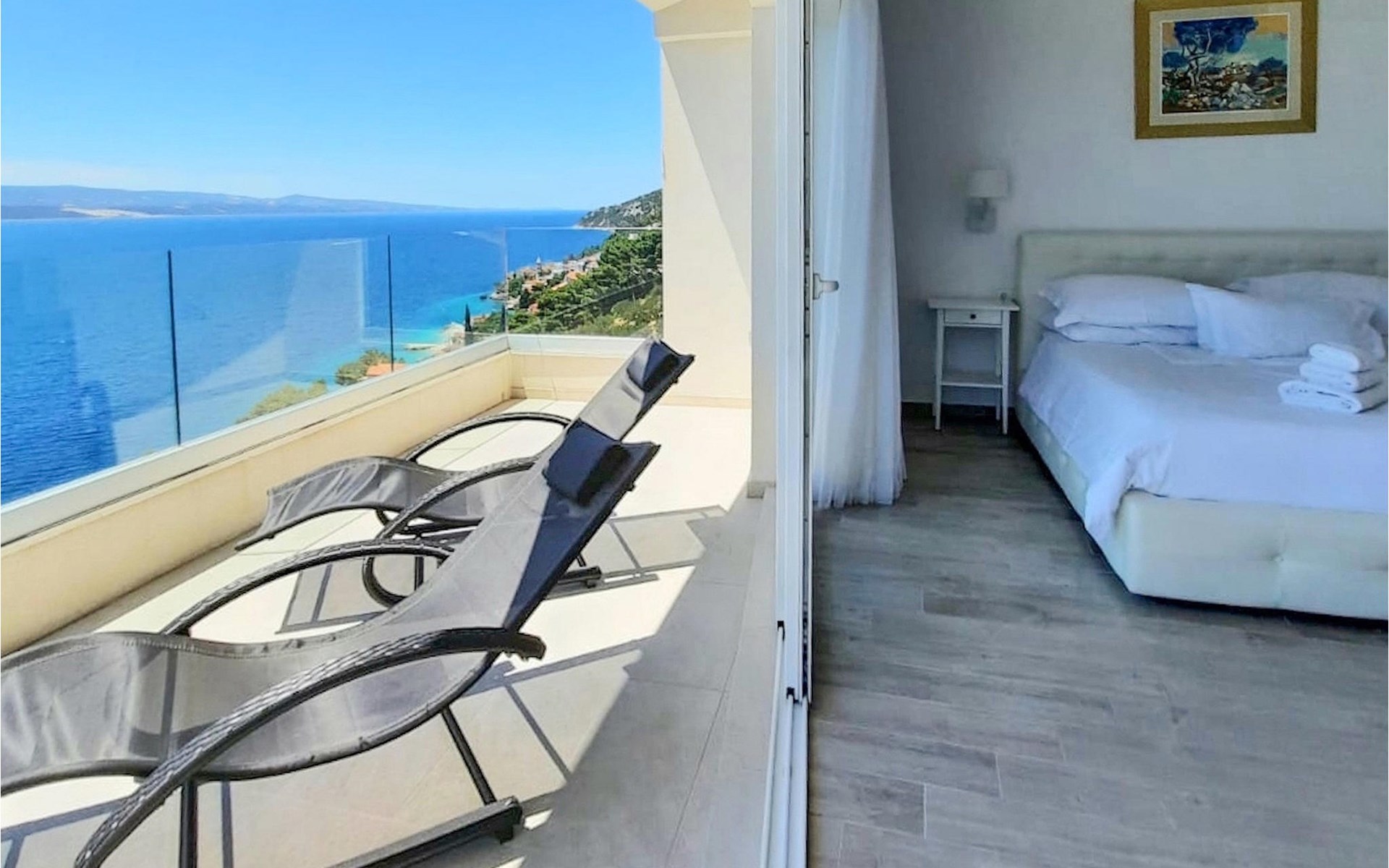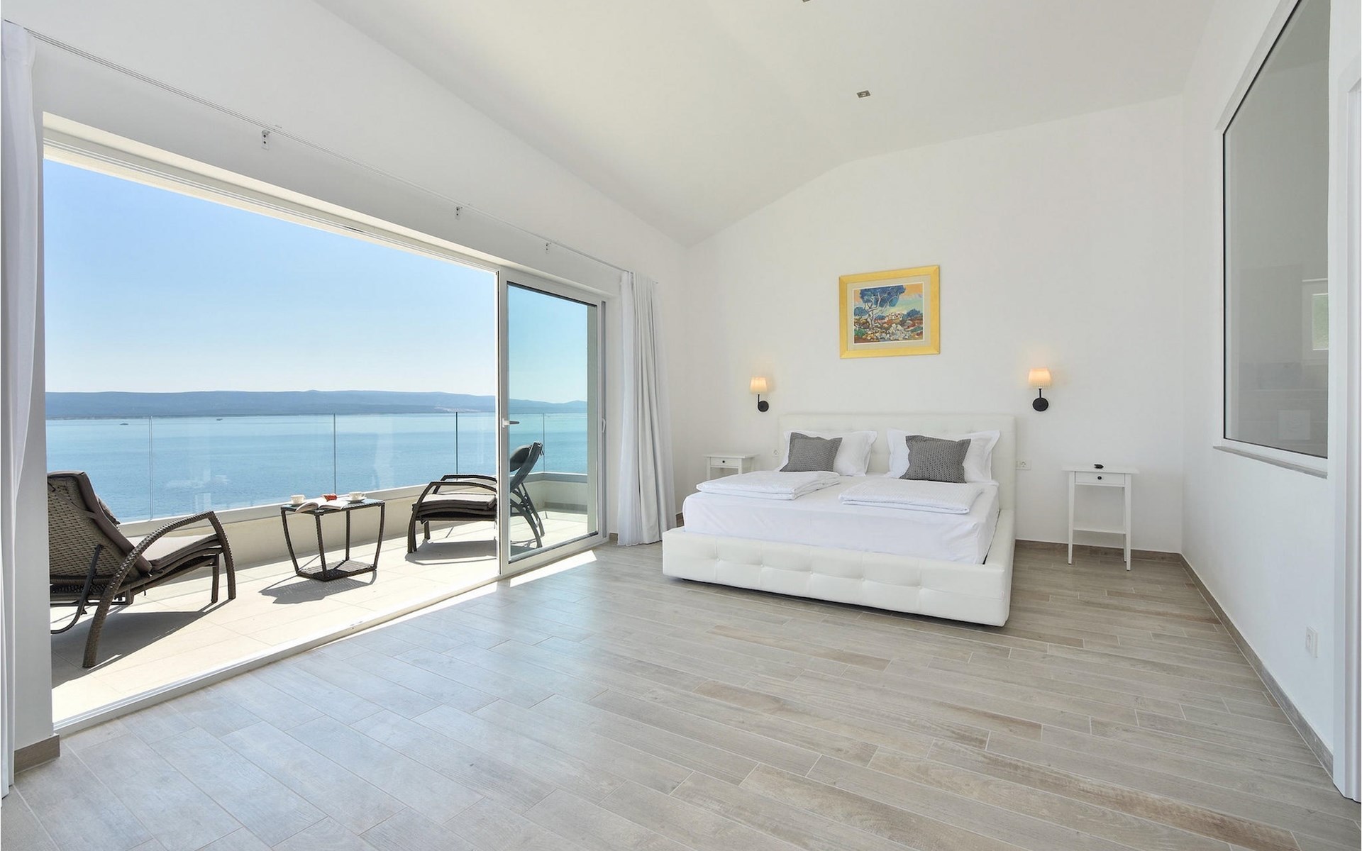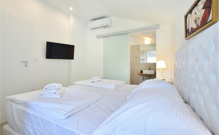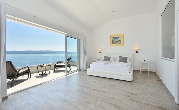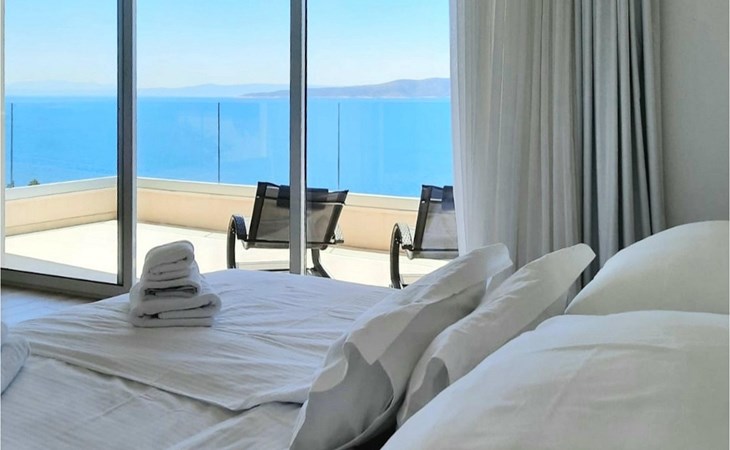 Op de bovenverdieping van de villa vind je twee slaapkamers, ook modern en neutraal ingericht, beide met een eigen badkamer. Een van de slaapkamers heeft zelfs een eigen balkon met loungemeubels en direct uitzicht op zee. Begroet rustige ochtenden met koffie op je eigen balkon met de eerste zonnestralen en een onovertroffen uitzicht.