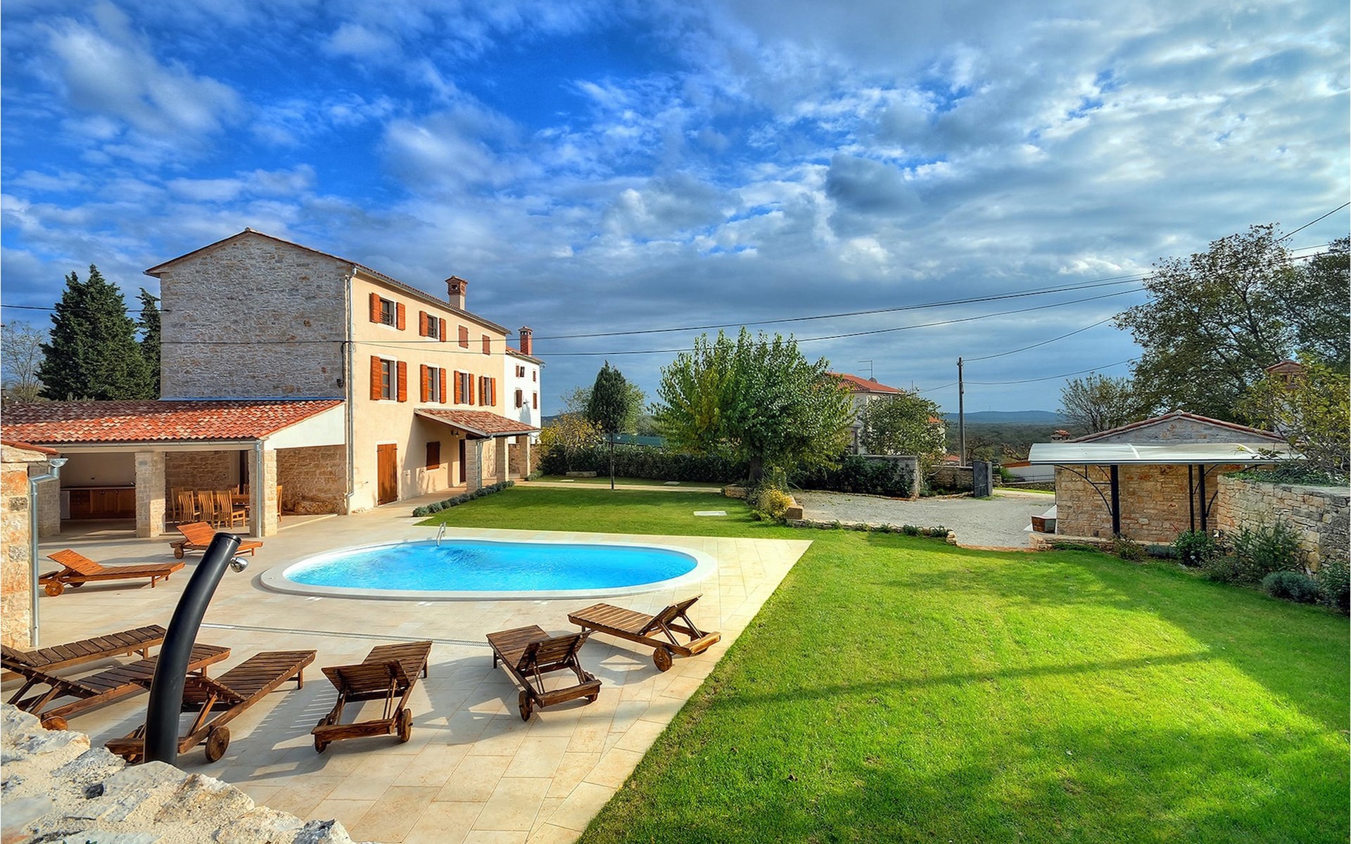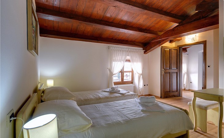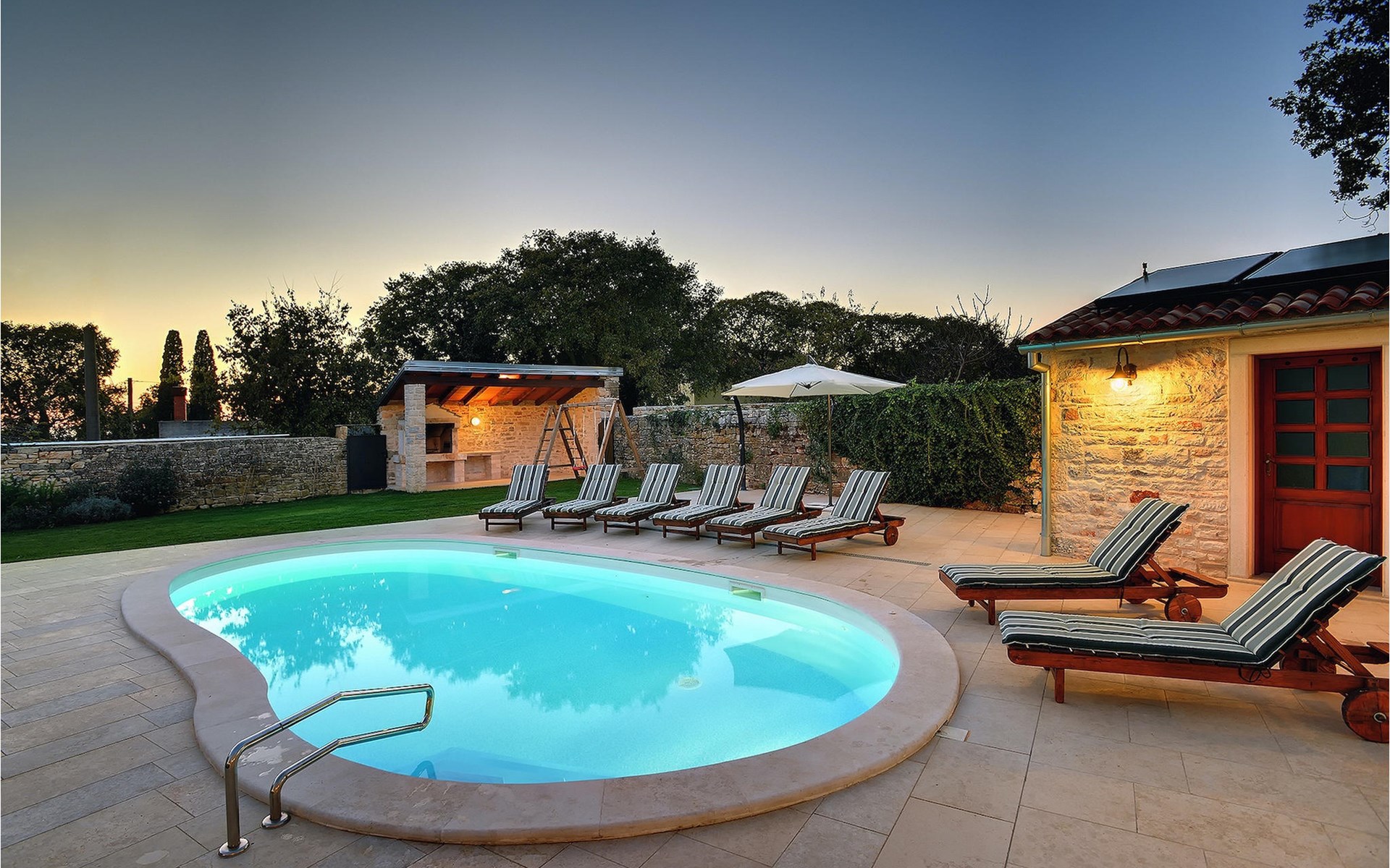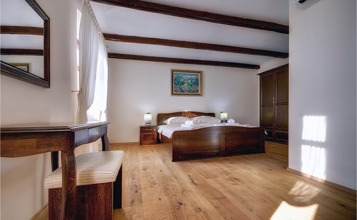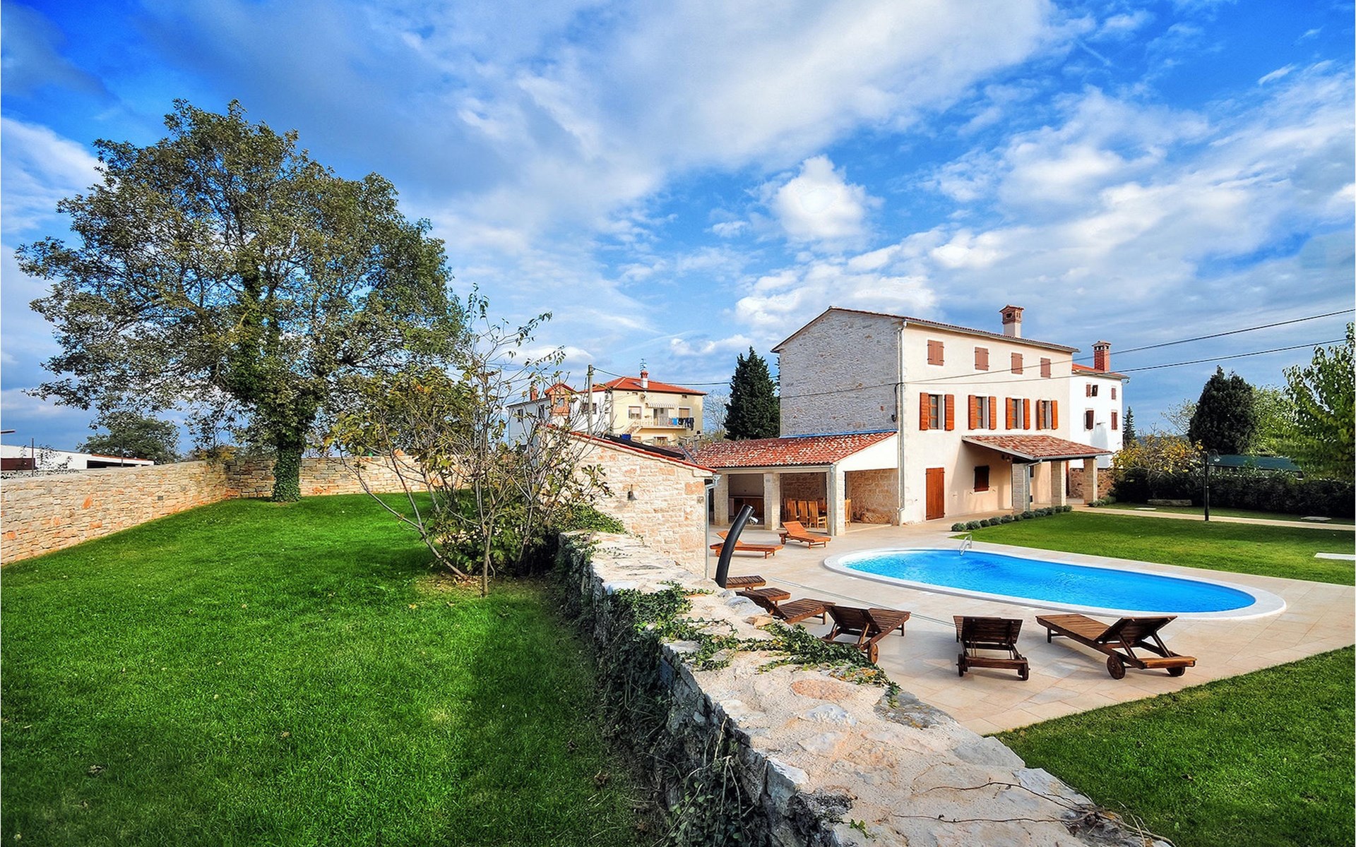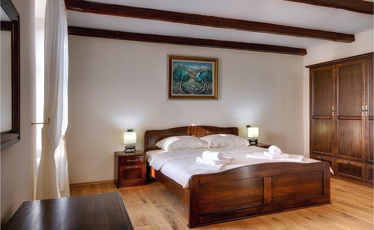 Dit prachtige, onlangs gerenoveerde pand ligt in een rustig dorpje in Istrië, op slechts een klein eindje rijden van de kust van Rovinj. Het pand is liefdevol gerenoveerd en biedt alle voordelen van het moderne leven: 6 en-suite badkamers, airconditioning en WiFi internet. De tuin is volledig omheind en biedt privacy rond het zwembad. Buiten is er ook een grote overdekte eet- en woonruimte met een buitenkeuken. De natuurstenen barbecue heeft ook een broodoven en pizzaoven. De woning bestaat uit twee gebouwen in dezelfde tuin. In het ene bevindt zich een tweepersoonsslaapkamer, een badkamer, een keuken en een woongedeelte - ideaal als een stel meer privacy nodig heeft. Het grote gebouw heeft 4 slaapkamers, een keuken en een grote woonkamer met open haard. Alle kamers hebben een eigen badkamer en airconditioning. De tuin heeft een irrigatiesysteem zodat het gras altijd mooi groen is. Het strand in Lim Fjord is maar een klein stukje rijden (5 km) en een goed restaurant is in de directe omgeving.