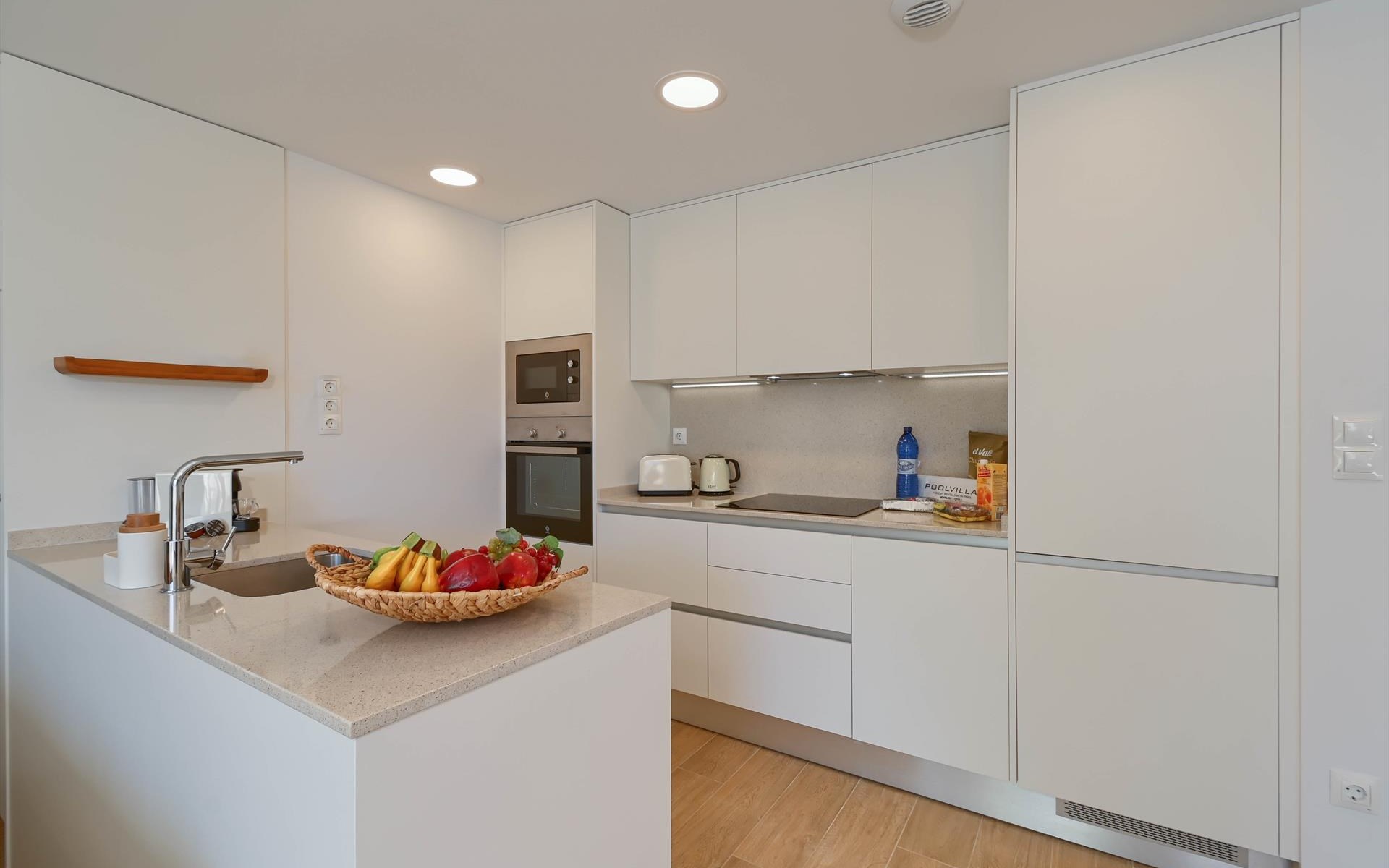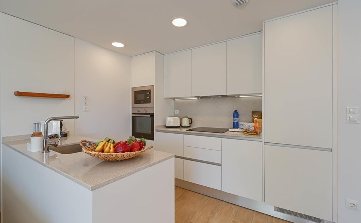 - open keuken met elektrische kookplaat, elektrische oven, magnetron, vaatwasser, koel-vriescombinatie, koffiezetapparaat, elektrische waterkoker, mixer, broodrooster en sapcentrifuge