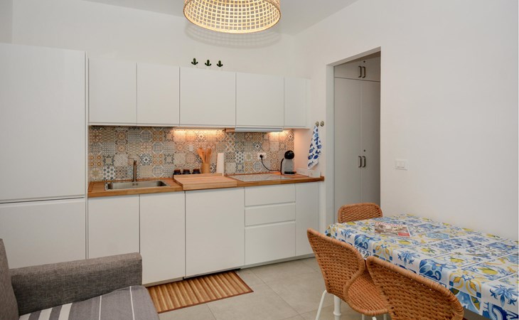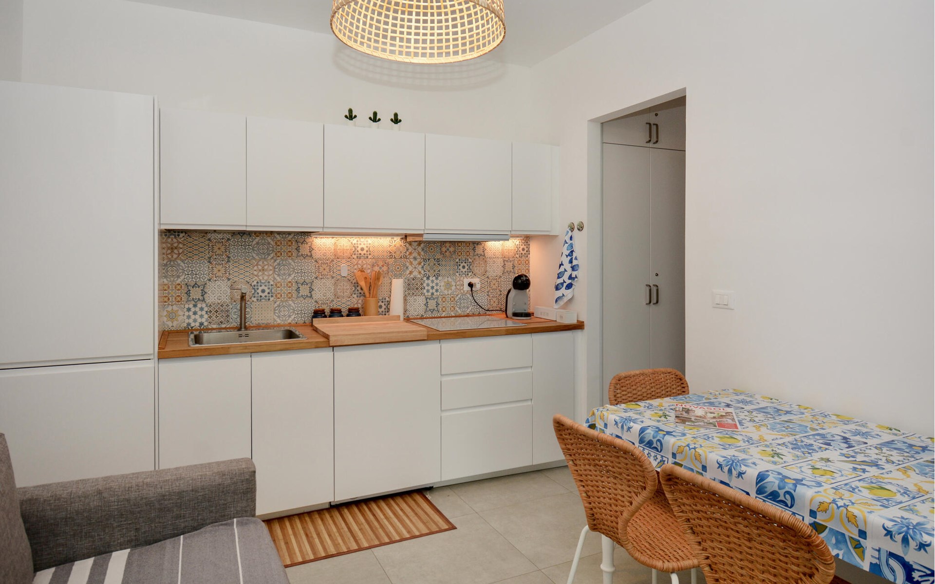 Maak gebruik van de moderne keuken met eettafel, die ideaal is uitgerust om samen maaltijden te bereiden. Ontdek de vriendelijke sfeer, die wordt benadrukt door mediterrane tegelaccenten, en voel je meteen thuis. Deel je dagen in zoals jij dat wilt en geniet van de aangename combinatie van functionaliteit en stijlvolle inrichting.