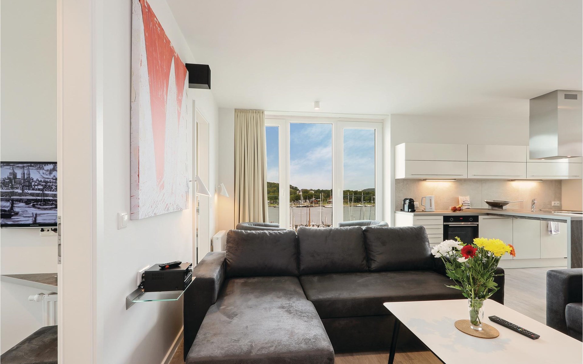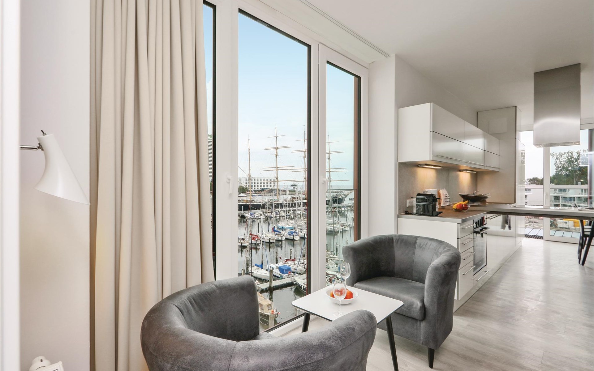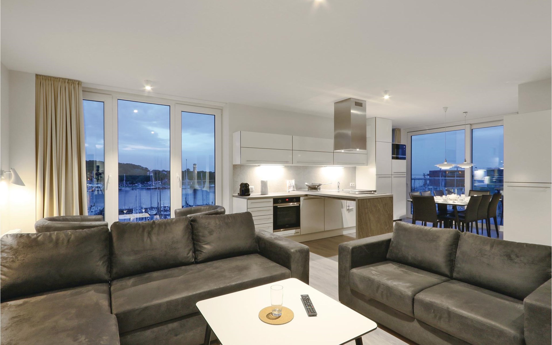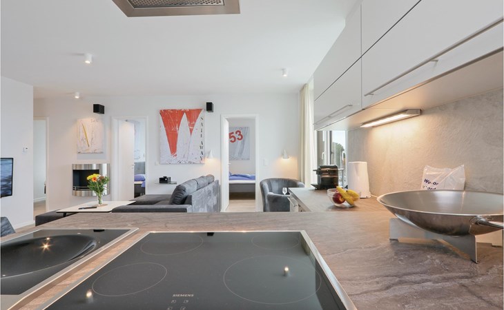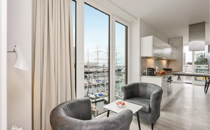 Je vakantieappartement heeft ook een modern entertainmentsysteem met Blu-Ray-speler, muziekinstallatie en een extra flatscreentelevisie in de woonkamer. Klassiek vermaak is er ook, want bij de receptie kun je tegen een kleine borg een verrekijker lenen waarmee je het reilen en zeilen op het water en aan de andere kant van de Trave kunt volgen. s Avonds zorgt het licht van de bio-ethanol open haard voor een gezellige sfeer. Koffieliefhebbers vinden een Nespresso-apparaat in de goed uitgeruste keuken (breng je eigen capsules mee), evenals een thermoskan en een handfilter om je eigen koffie te zetten als je de voorkeur geeft aan klassieke filterkoffie.