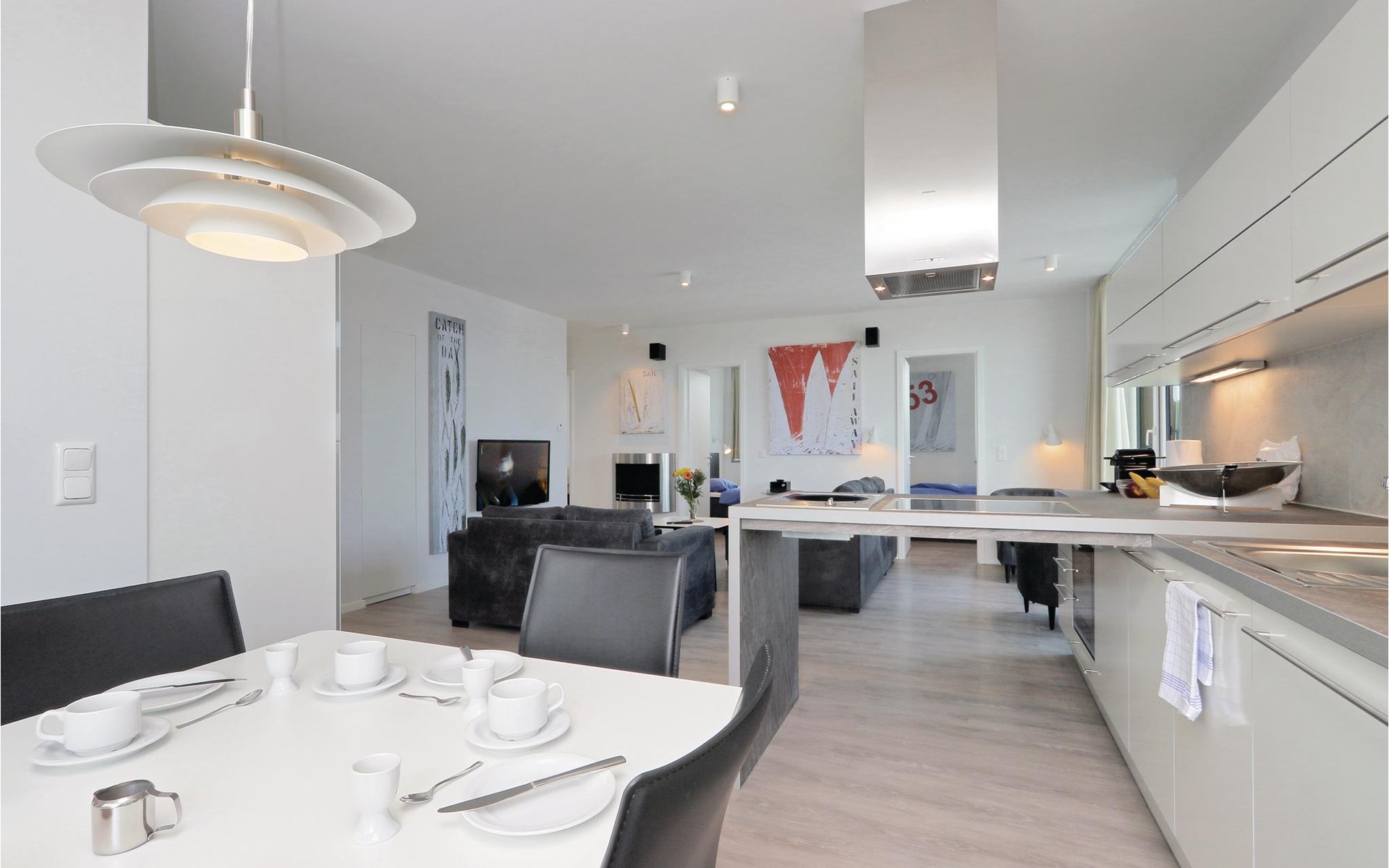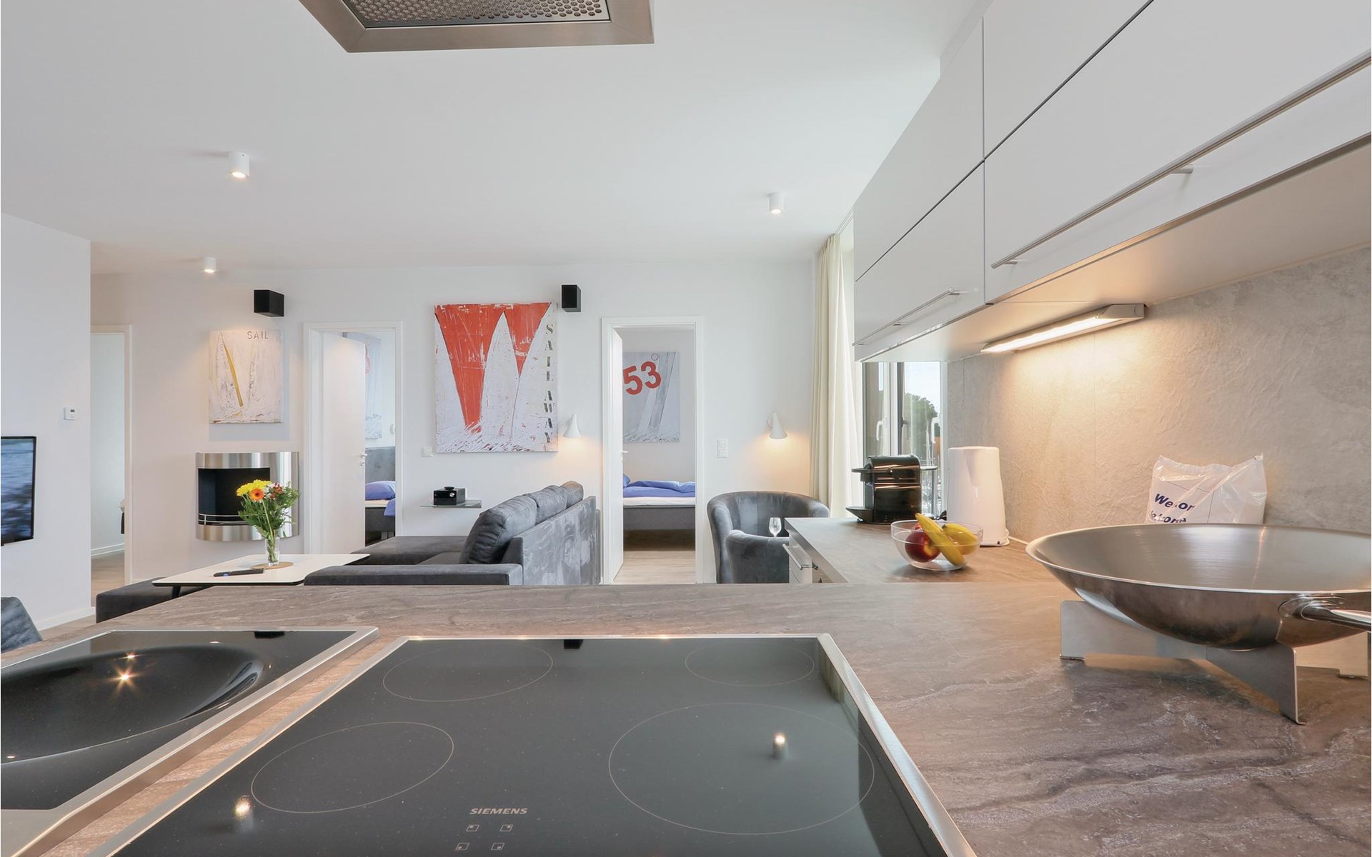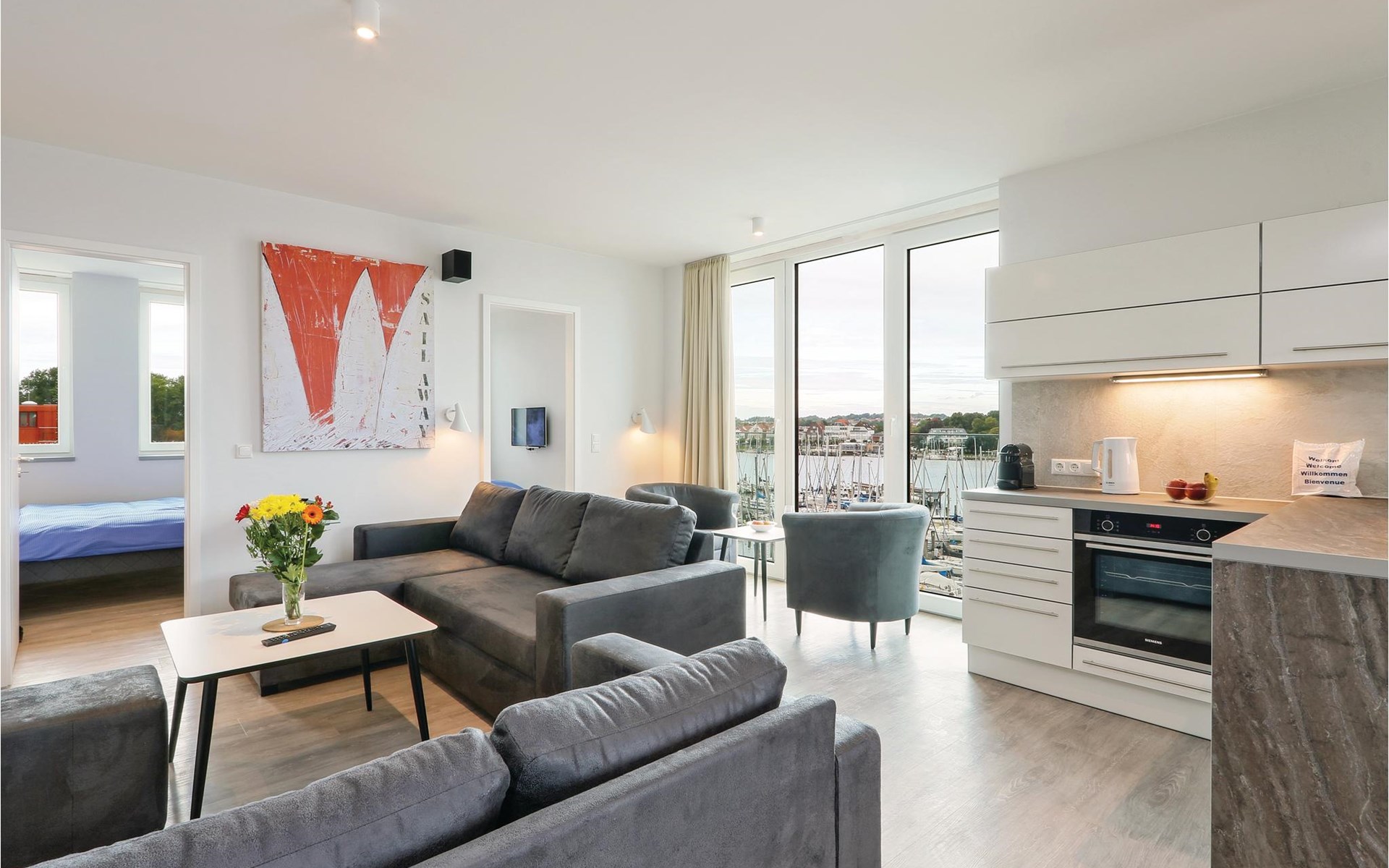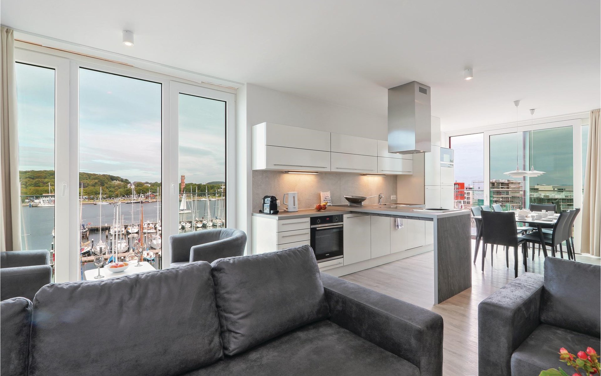 Je vakantieappartement heeft ook een modern entertainmentsysteem met Blu-Ray-speler, muziekinstallatie en een extra flatscreentelevisie in de woonkamer. Klassiek vermaak is er ook, want bij de receptie kun je tegen een kleine borg een verrekijker lenen waarmee je het reilen en zeilen op het water en aan de andere kant van de Trave kunt volgen. s Avonds zorgt het licht van de bio-ethanol open haard voor een gezellige sfeer. Koffieliefhebbers vinden een Nespresso-apparaat in de goed uitgeruste keuken (breng je eigen capsules mee), evenals een thermoskan en een handfilter om je eigen koffie te zetten als je de voorkeur geeft aan klassieke filterkoffie.