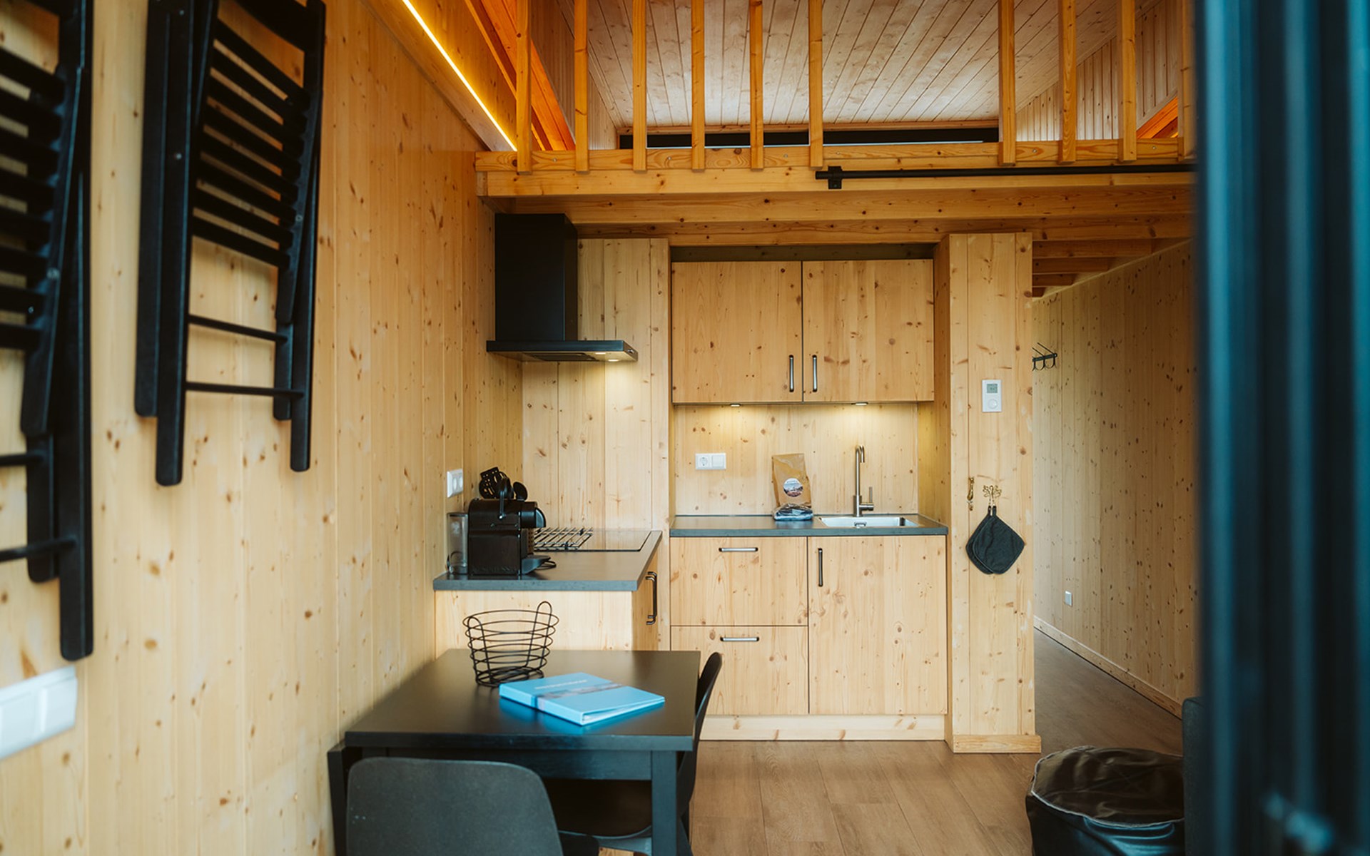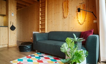 De knusse woonkamer is voorzien van een groot raamoppervlak en een handige keukenhoek met onder meer een koel/vriescombinatie en een elektrische kookplaat. De gehele voorzijde van de woning is open te schuiven, zodat je binnen en buiten naadloos met elkaar verbindt – ideaal op zonnige dagen. De (ouder)slaapkamer heeft een eigen schuifpui naar een privéterras, waardoor je letterlijk wakker wordt met de eerste zonnestralen. De slaapvide, bereikbaar via een steile trap, is geschikt voor oudere kinderen en voegt een speels element toe aan het compacte ontwerp.