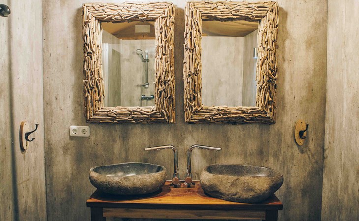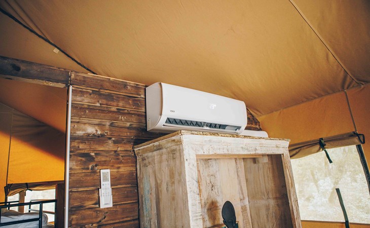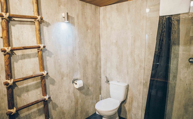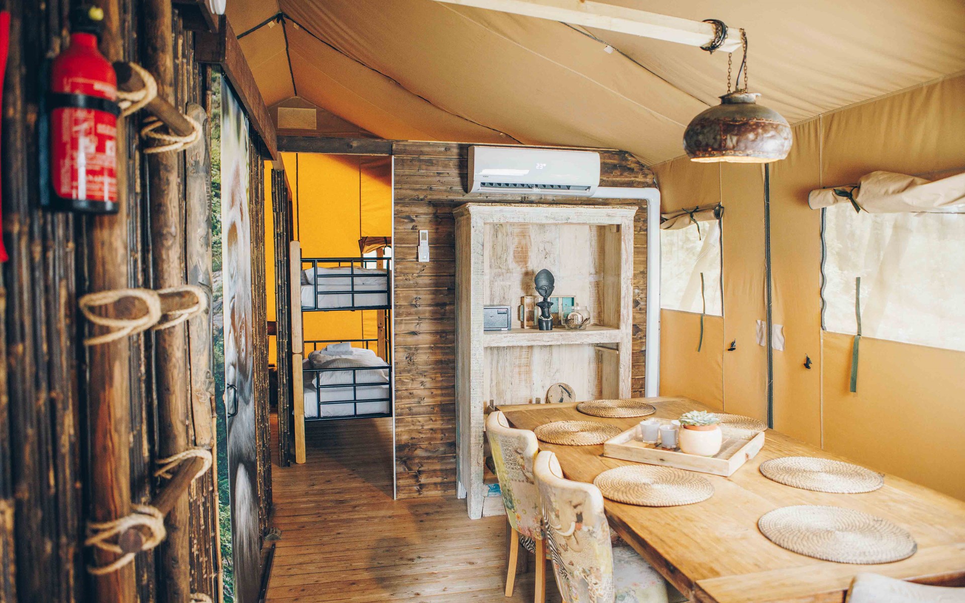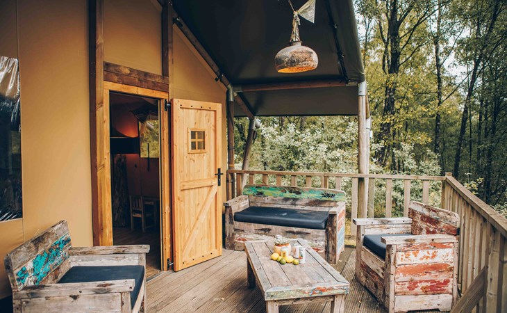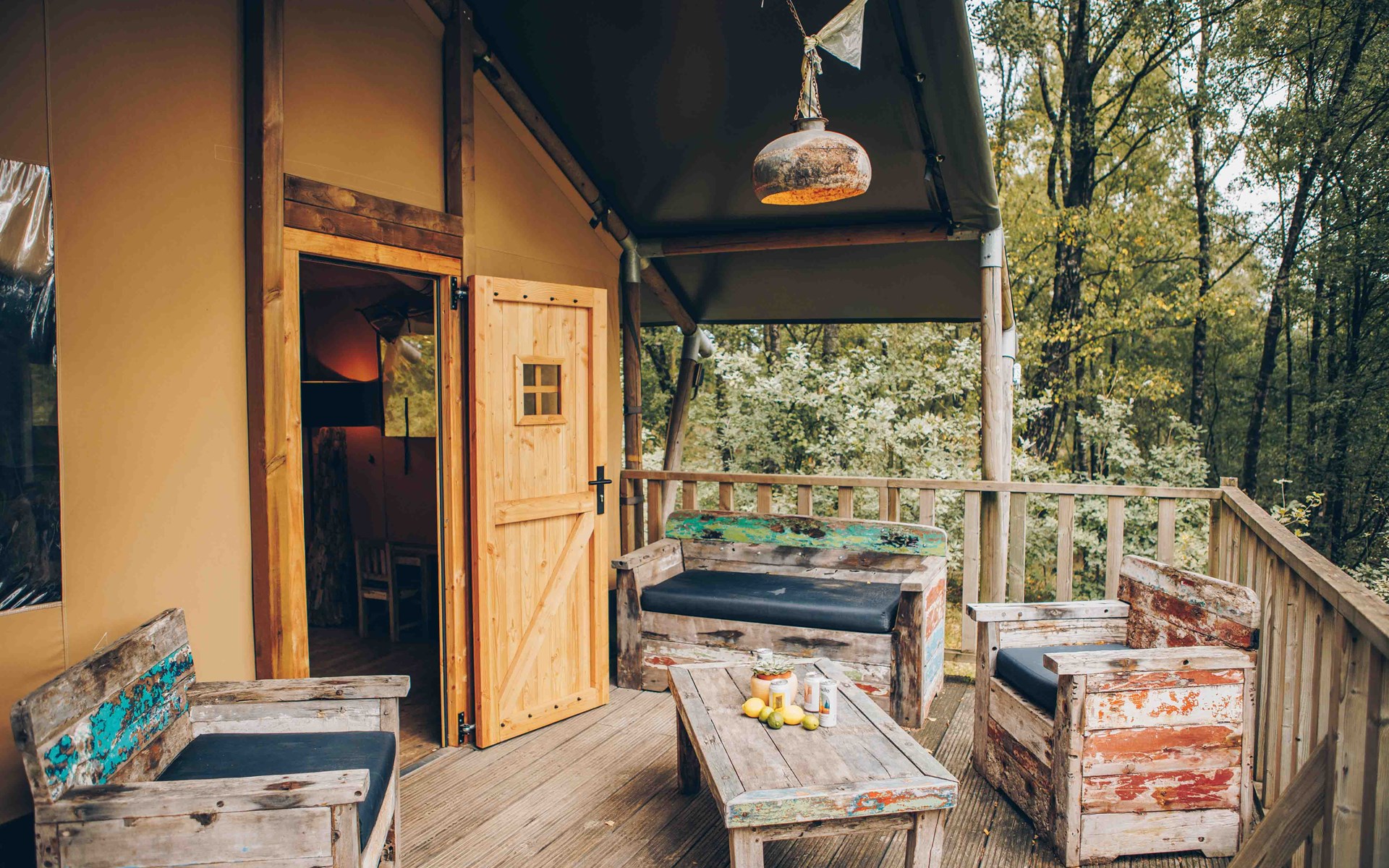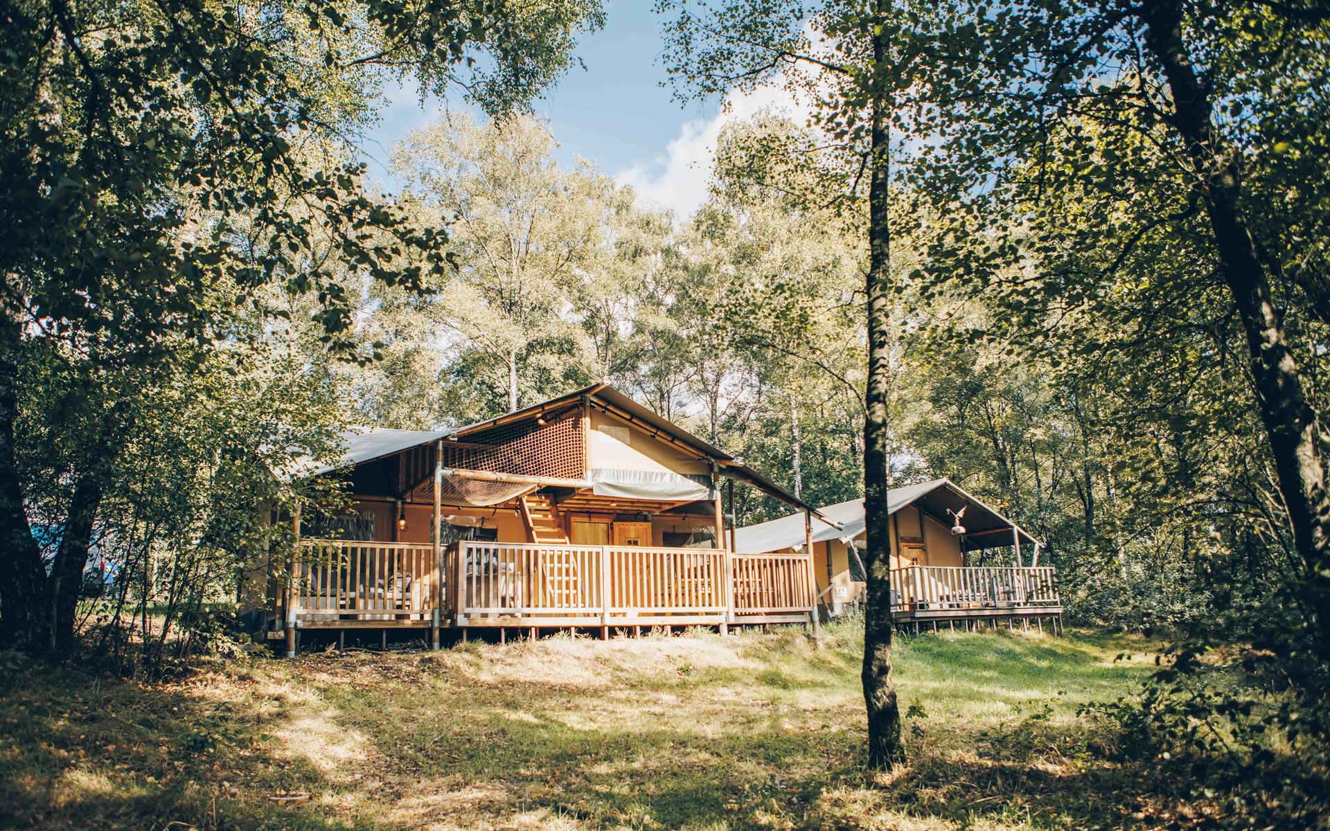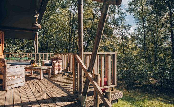 De glampingtenten bieden alles wat u nodig heeft voor een ontspannen verblijf. Zo beschikt u over een eigen badkamer met douche, toilet en wastafel, een compleet ingerichte keuken met Nespresso-apparaat en voldoende servies, en een gezellige eethoek. Buiten geniet u op de houten veranda van lange zomeravonden in de loungeset met zachte kussens. Met een woonoppervlakte van 50 tot 60 m² is er genoeg ruimte om samen te koken, spelen en relaxen. Dankzij gratis Wi-Fi en airconditioning (koelen en verwarmen) wordt uw verblijf nog aangenamer.