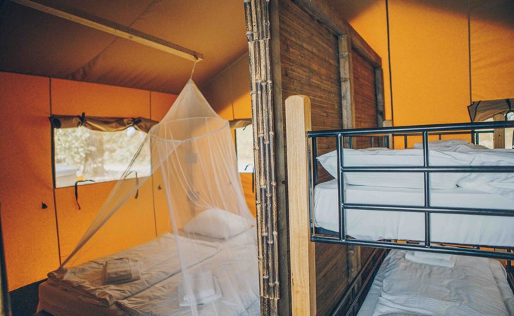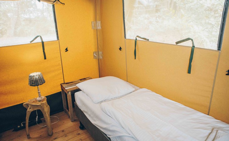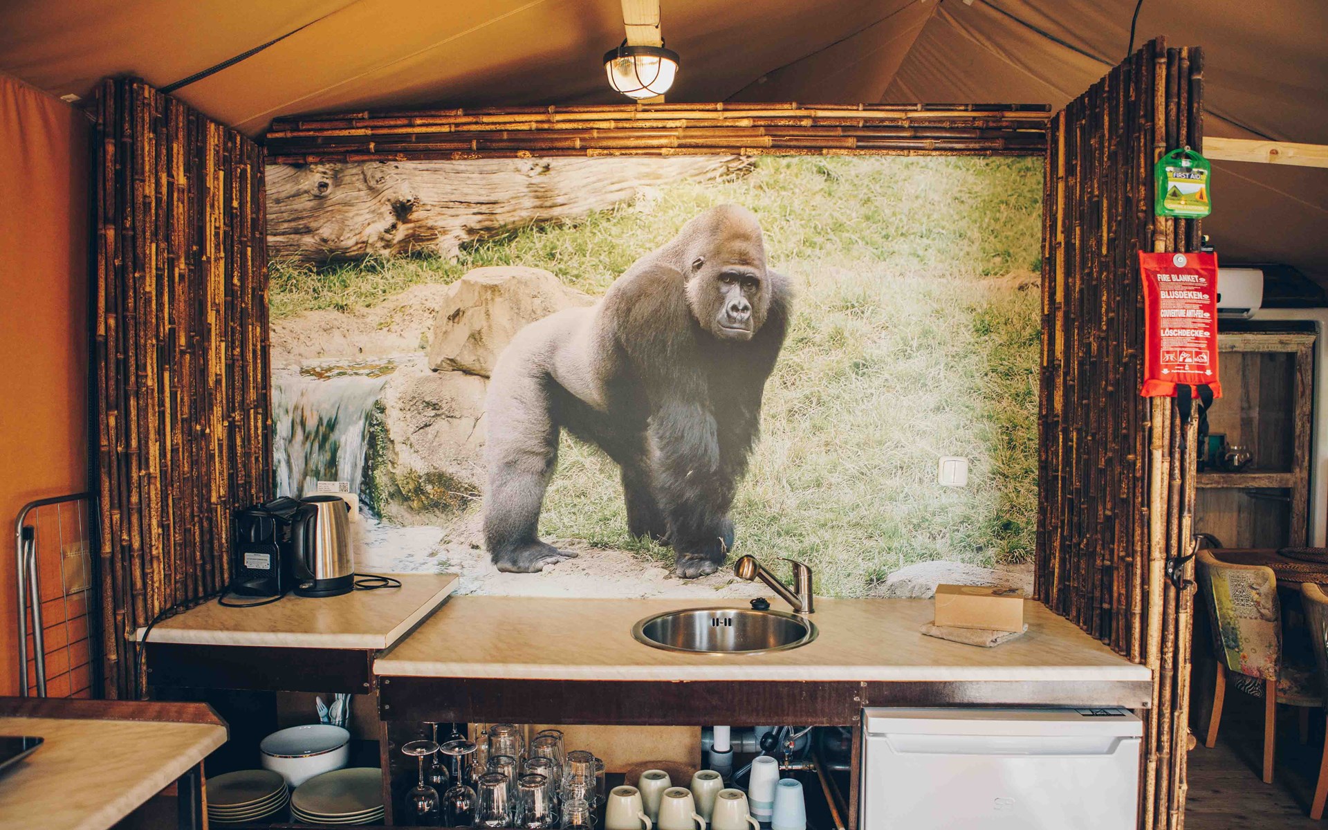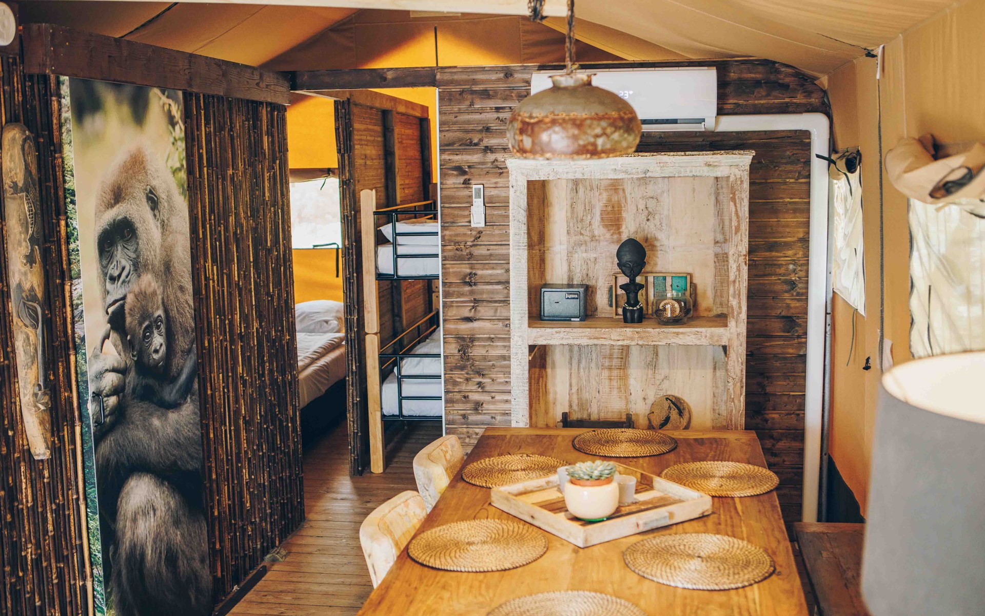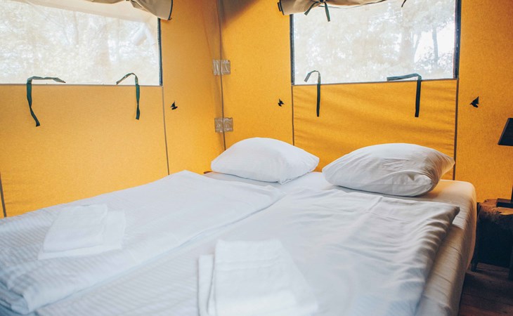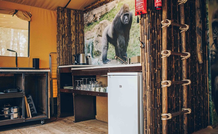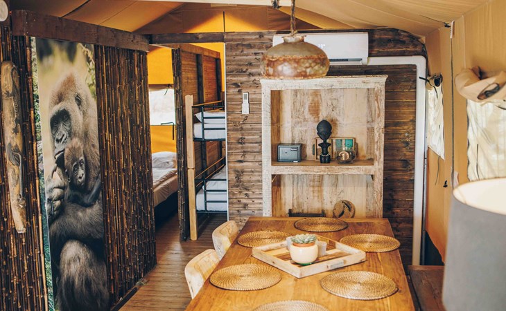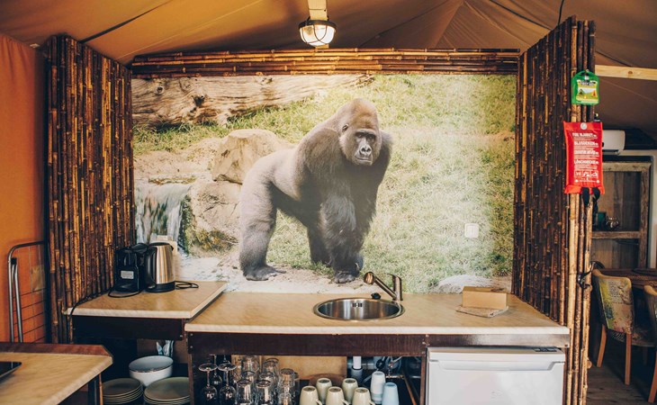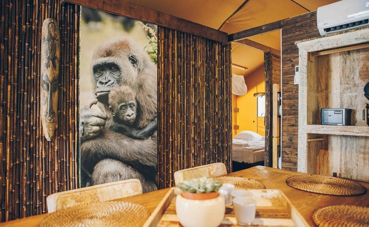 Stap binnen in een wereld vol safari-gevoel, midden in het groen. Onze sfeervolle glampingtenten voor 5 personen zijn ingericht in Afrikaanse stijl en elk voorzien van een uniek thema: kies bijvoorbeeld voor een verblijf tussen de Neushoorns, Gorilla’s, Nijlpaarden of Giraffen. Met twee slaapkamers, waaronder een ouderslaapkamer met tweepersoonsbed en een kinderkamer met eenpersoons- én stapelbed, is de tent perfect voor maximaal vijf personen. De houten ondervloer en ruime veranda zorgen daarbij voor extra comfort en een warme uitstraling.