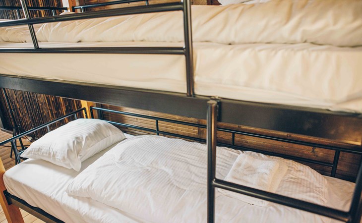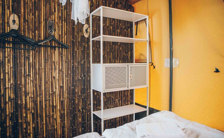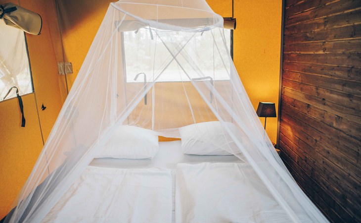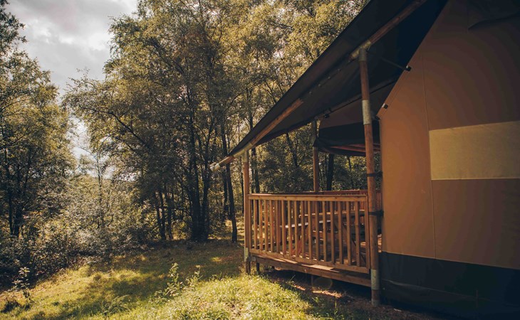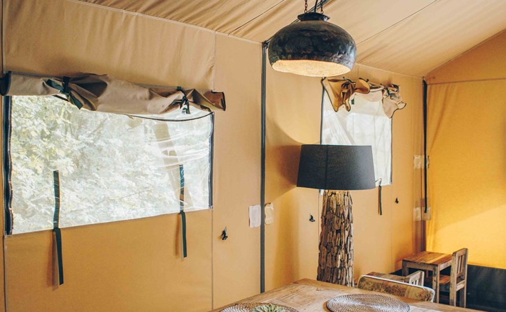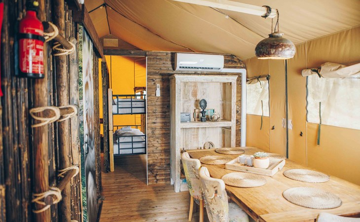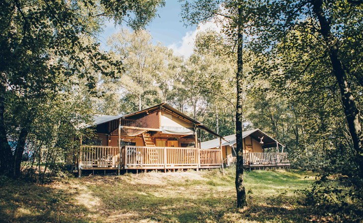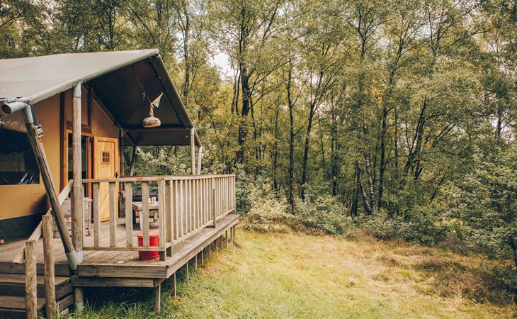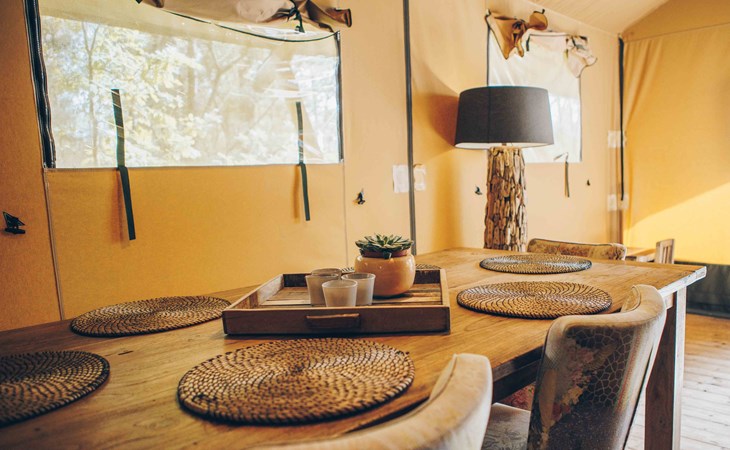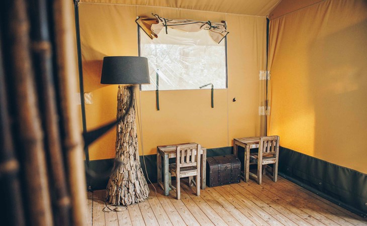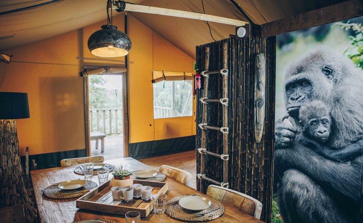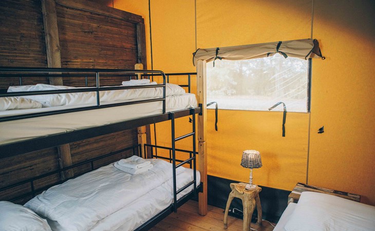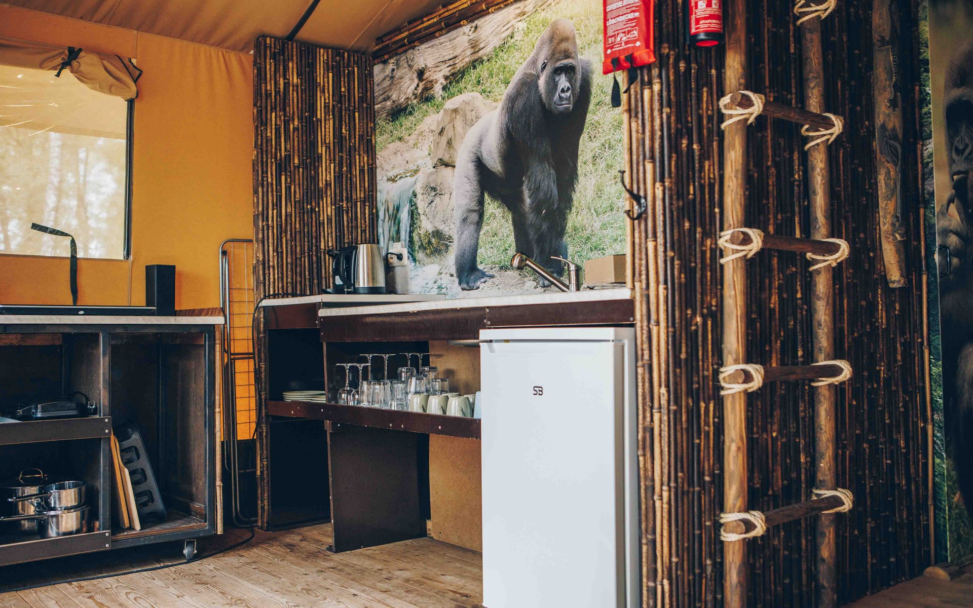 Stap binnen in een wereld vol safari-gevoel, midden in het groen. Onze sfeervolle glampingtenten voor 5 personen zijn ingericht in Afrikaanse stijl en elk voorzien van een uniek thema: kies bijvoorbeeld voor een verblijf tussen de Neushoorns, Gorilla’s, Nijlpaarden of Giraffen. Met twee slaapkamers, waaronder een ouderslaapkamer met tweepersoonsbed en een kinderkamer met eenpersoons- én stapelbed, is de tent perfect voor maximaal vijf personen. De houten ondervloer en ruime veranda zorgen daarbij voor extra comfort en een warme uitstraling.
