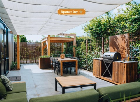 De tuin, met een royale oppervlakte van 347m2, omarmt het huis en biedt op elk moment van de dag zon of schaduw. Of je nu wilt relaxen op het terras, beschut onder de overkapping, of liever op een van de twee ligbedden in de zon ligt, het kan allemaal. En op de tuinset voor zes personen zit je heerlijk te eten of te borrelen in de buitenlucht.