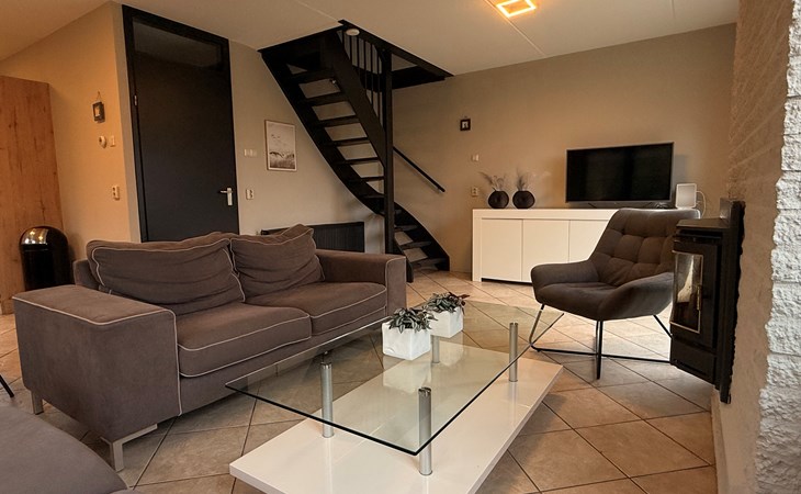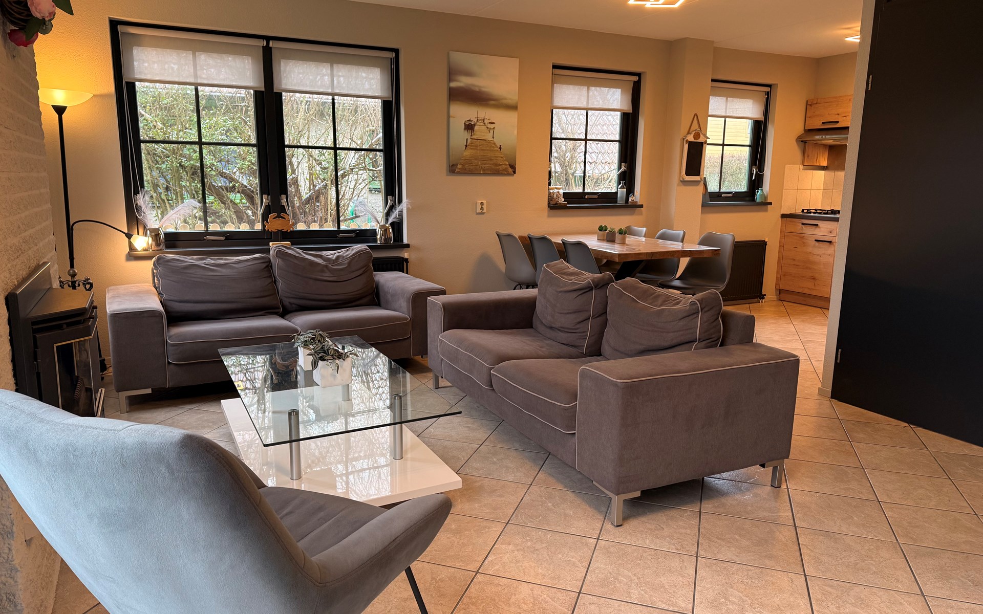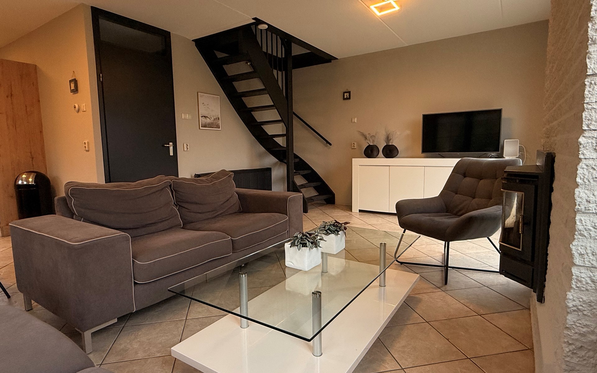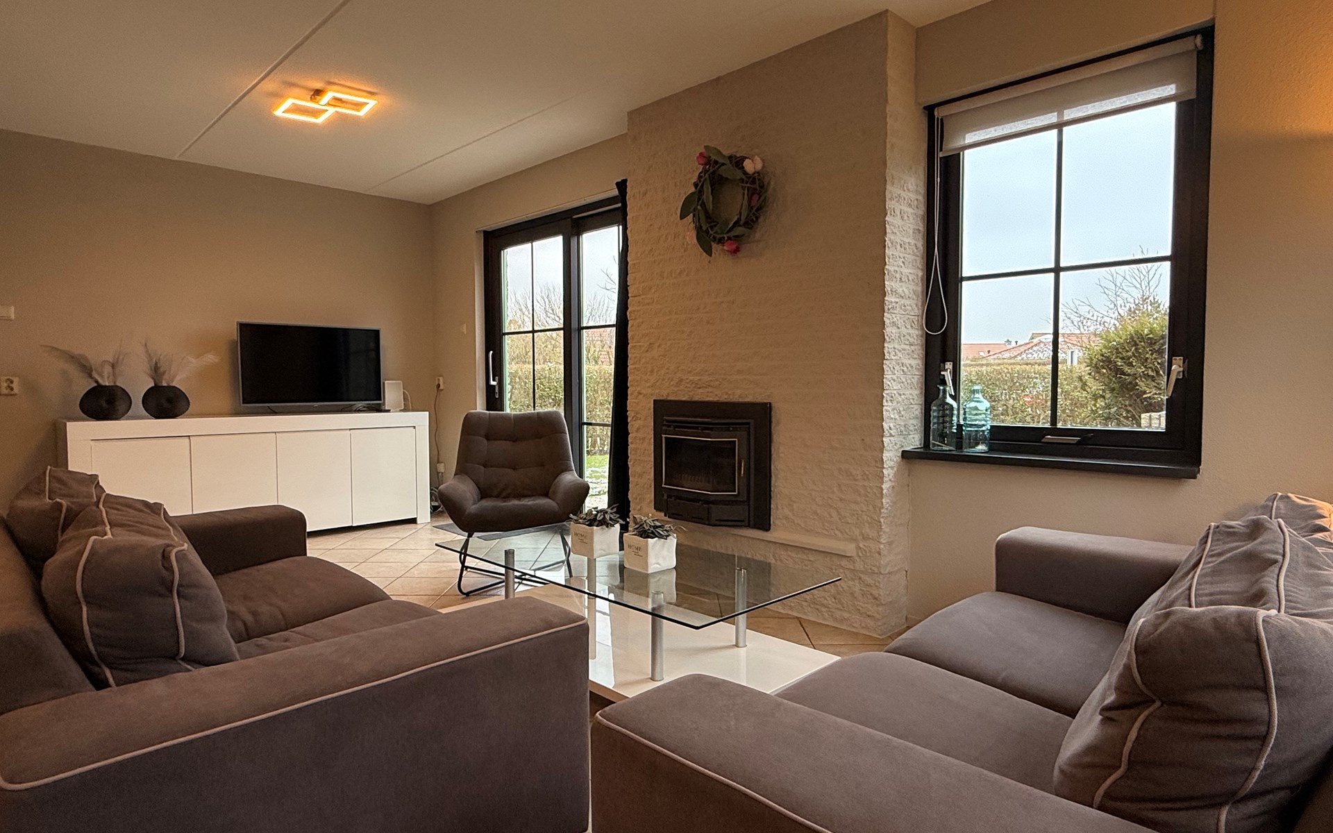 Gezellige woonkamer: Ontspan bij de open haard op kille avonden, of open de schuifpui naar de tuin en geniet van de frisse bries op warme dagen.