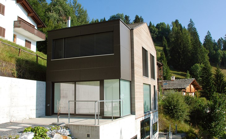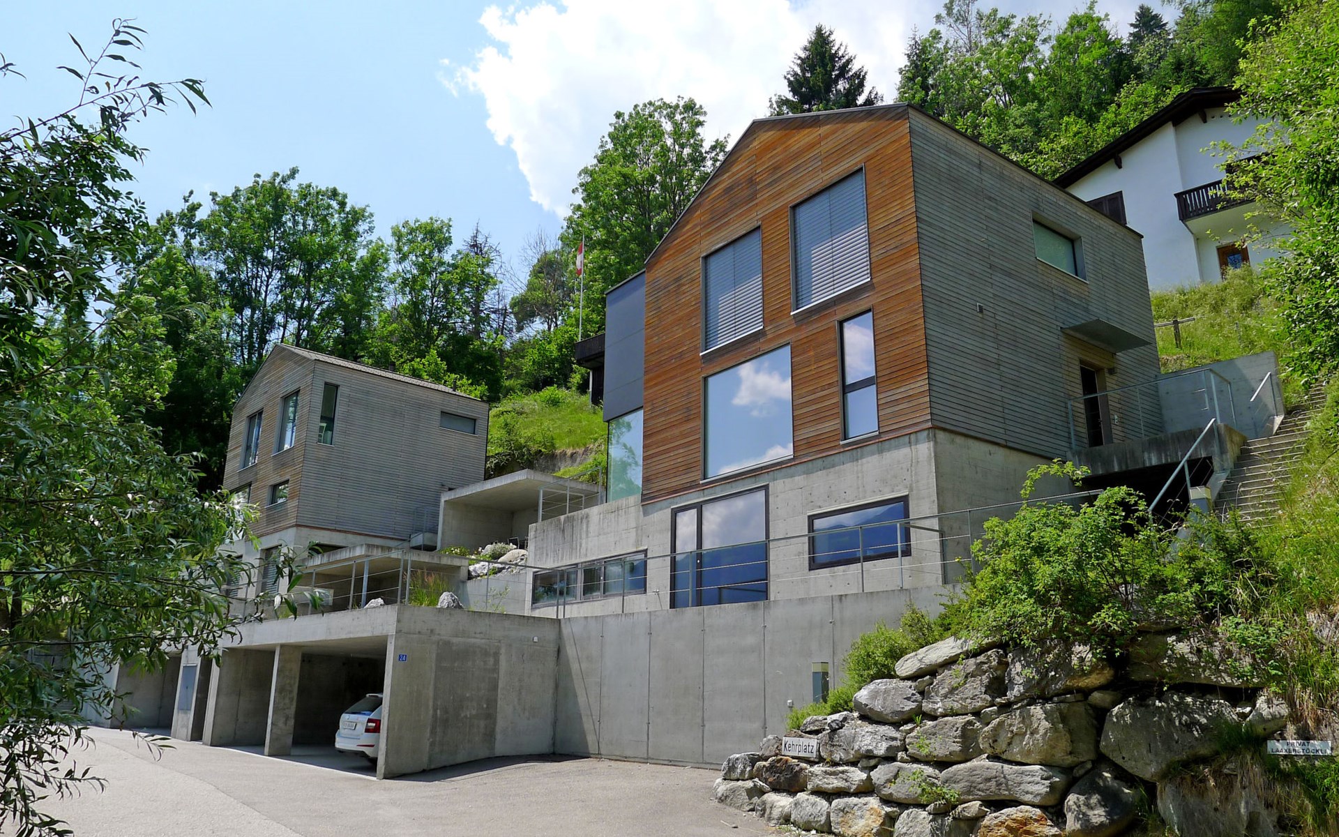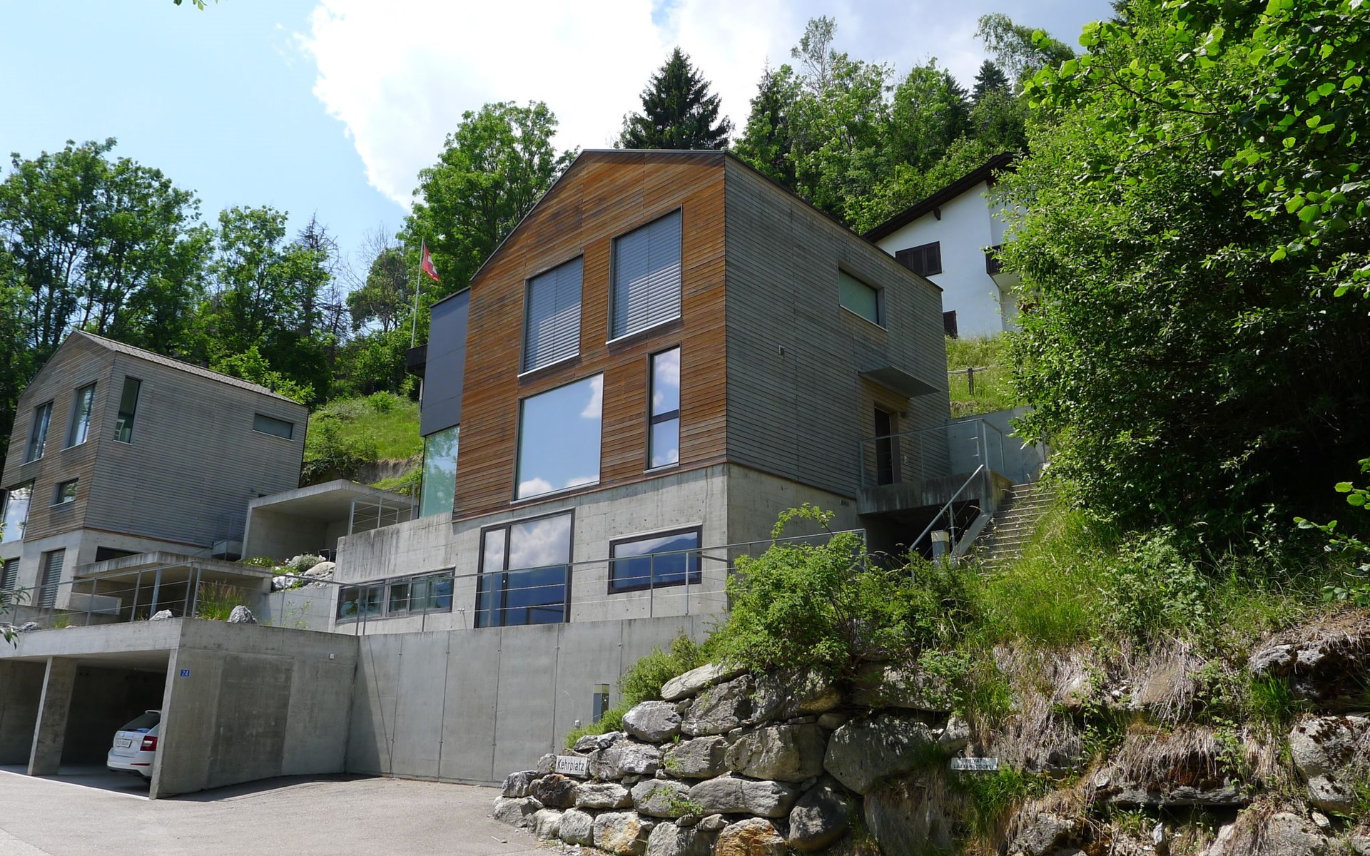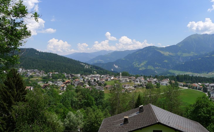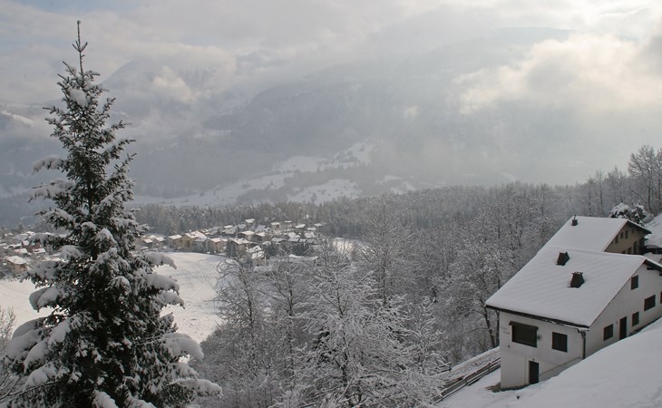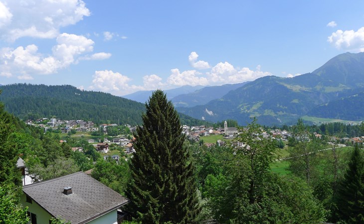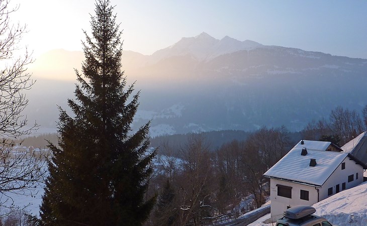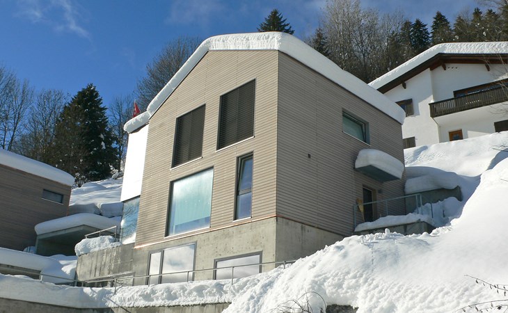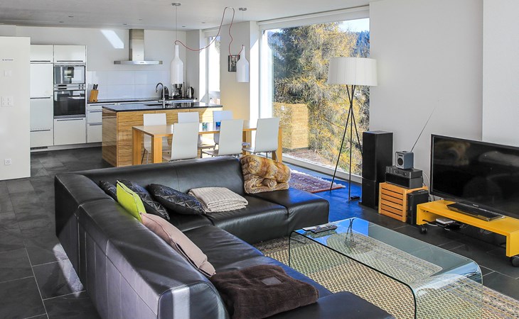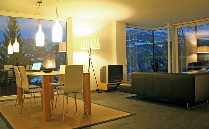 Moderne, mooi, luxueus Huis met 2 woningen "Melina", bouwjaar 2009. Aan de rand van de plaats, geïsoleerde, rustige, zonnige, verhoogde ligging tegen een helling, aan een doodlopende weg, te midden van groen. Voor medegebruik: barbecue. In het huis: centrale verwarming. Smalle toegangsweg tot aan het huis. Trappenweg (15 treden) naar het huis. Eigen garage. Winkel 500 m, levensmiddelenwinkel, restaurant, bushalte 200 m, openluchtzwembad. Golfterrein 5 km, tennis 2.5 km, kabelbaan 2.5 km, skilift 2.5 km, skischool 2.5 km, langlaufloipe 500 m.