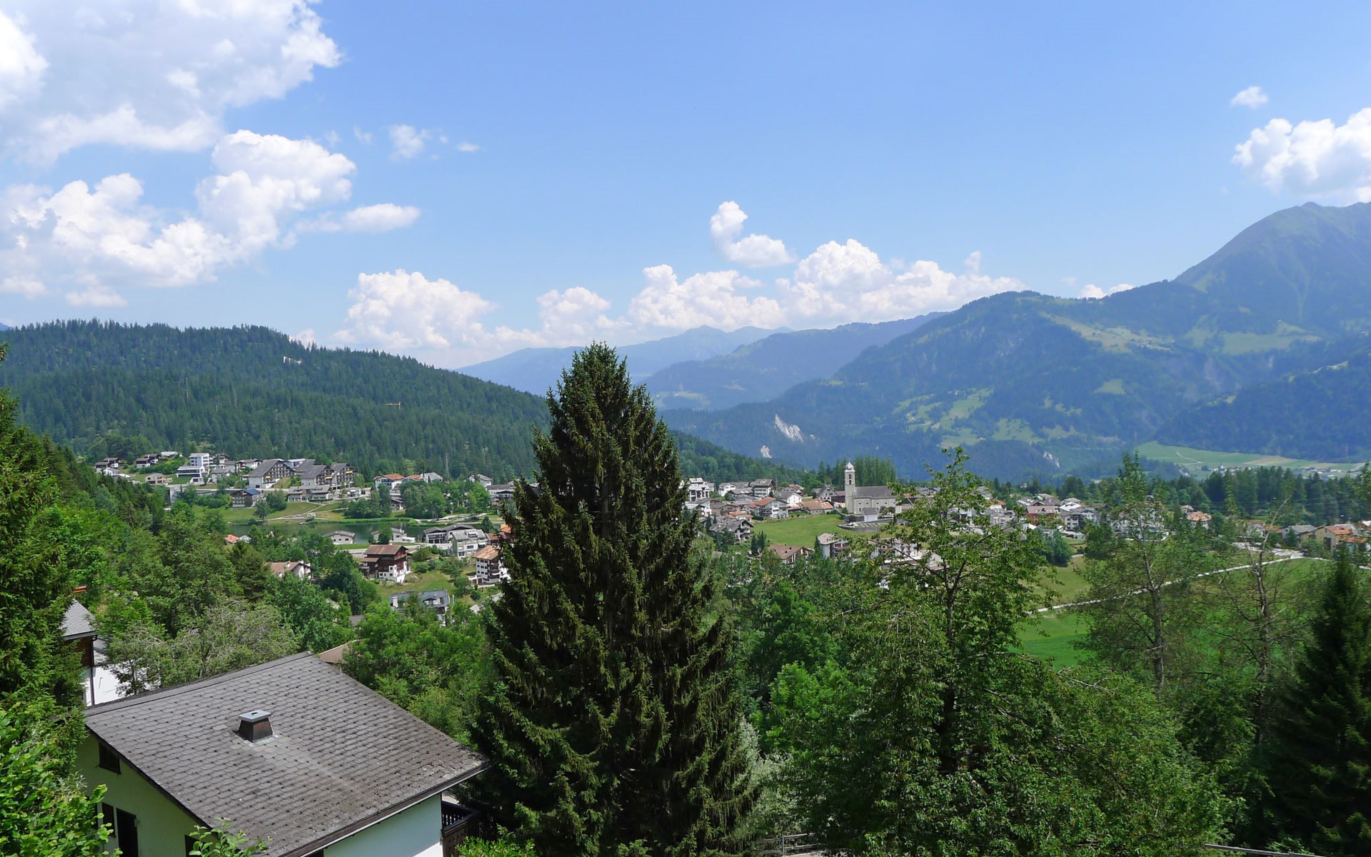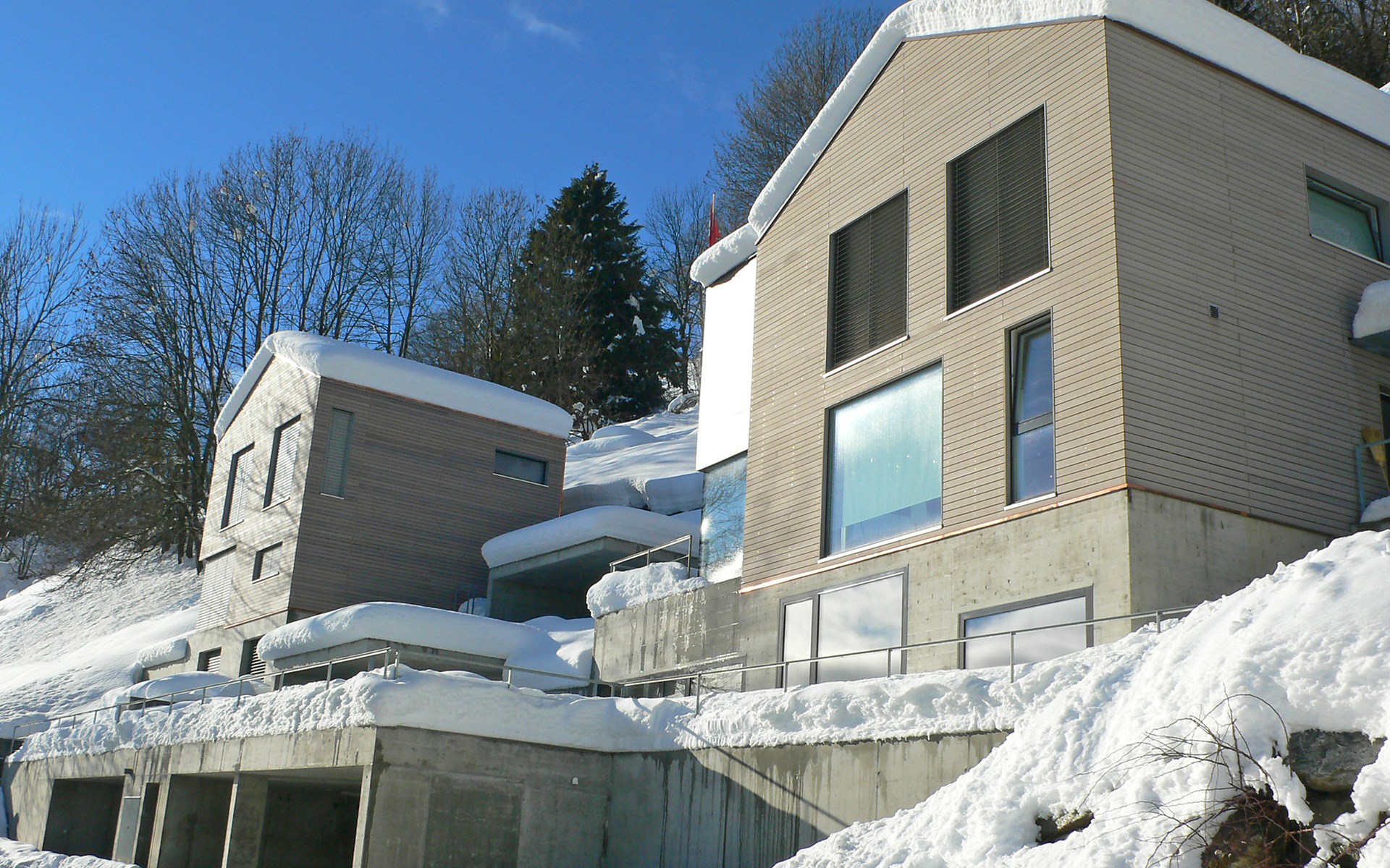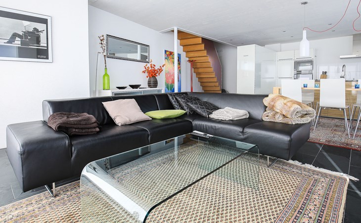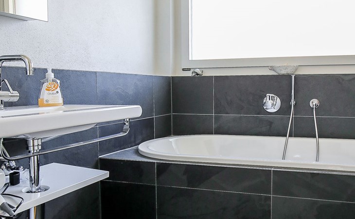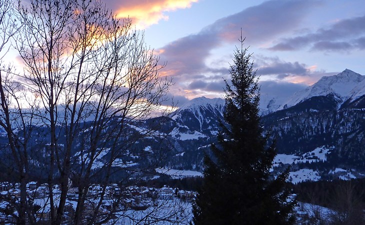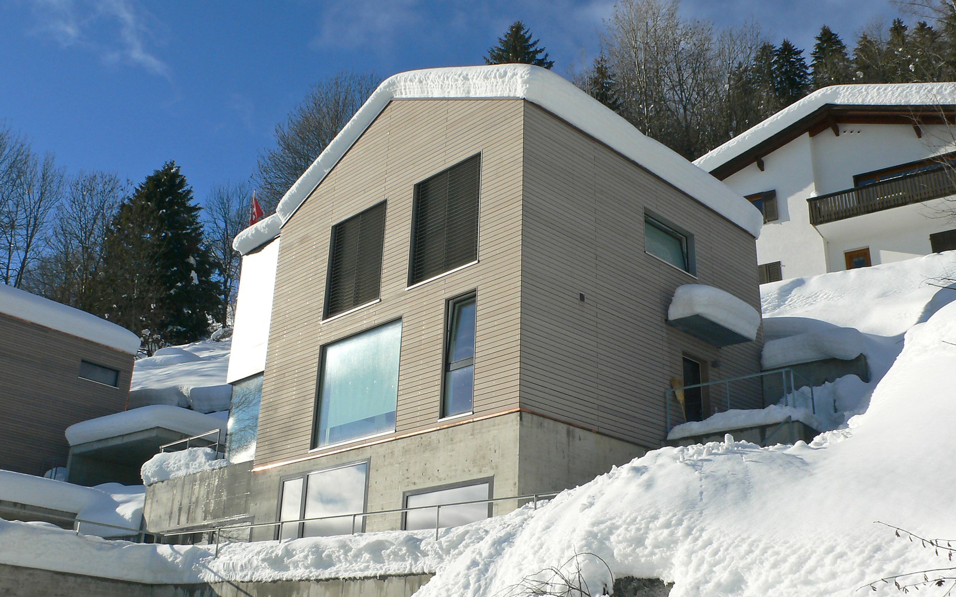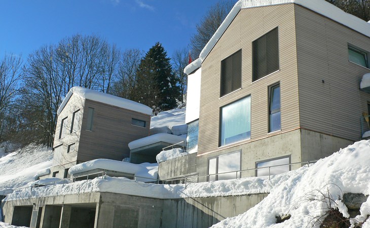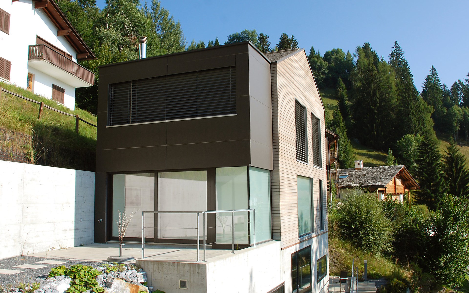 Moderne, mooi, luxueus Huis met 2 woningen "Melina", bouwjaar 2009. Aan de rand van de plaats, geïsoleerde, rustige, zonnige, verhoogde ligging tegen een helling, aan een doodlopende weg, te midden van groen. Voor medegebruik: barbecue. In het huis: centrale verwarming. Smalle toegangsweg tot aan het huis. Trappenweg (15 treden) naar het huis. Eigen garage. Winkel 500 m, levensmiddelenwinkel, restaurant, bushalte 200 m, openluchtzwembad. Golfterrein 5 km, tennis 2.5 km, kabelbaan 2.5 km, skilift 2.5 km, skischool 2.5 km, langlaufloipe 500 m.