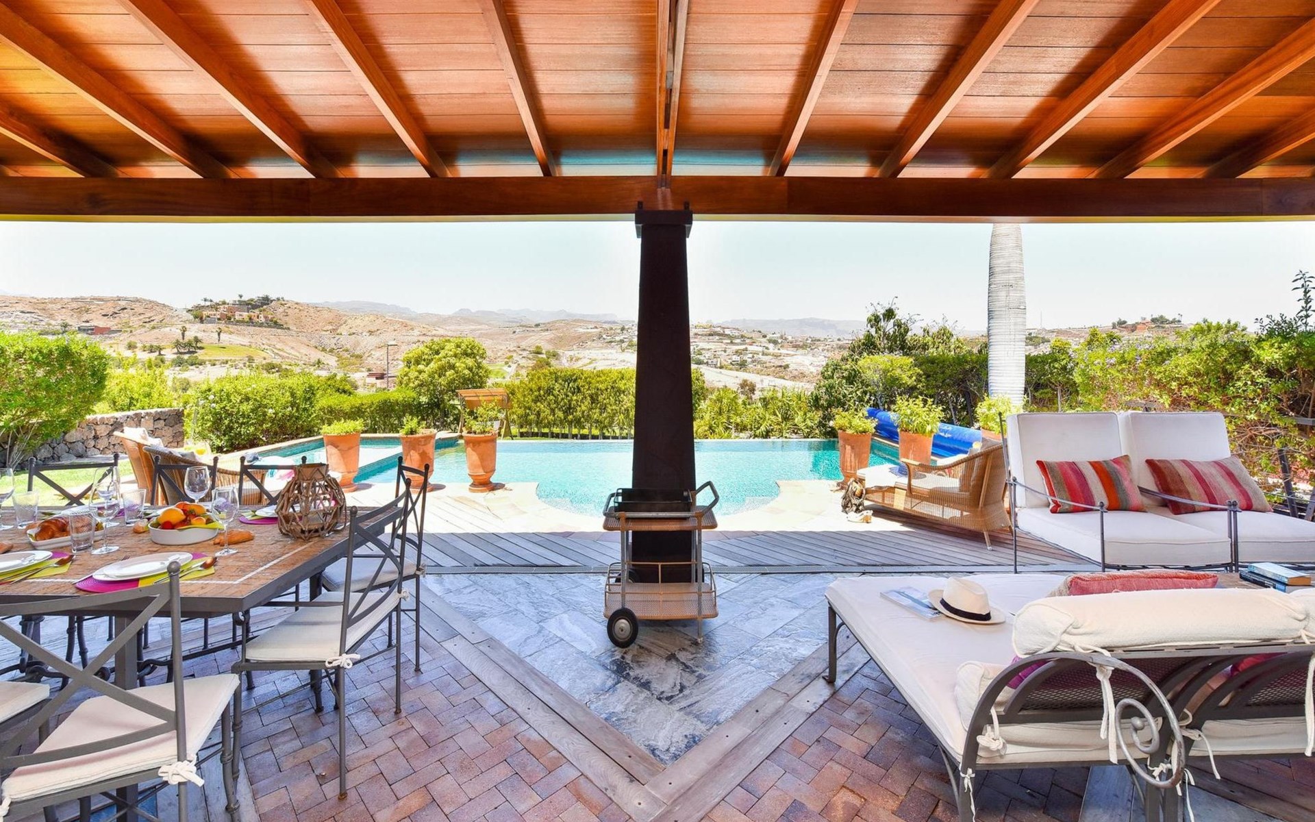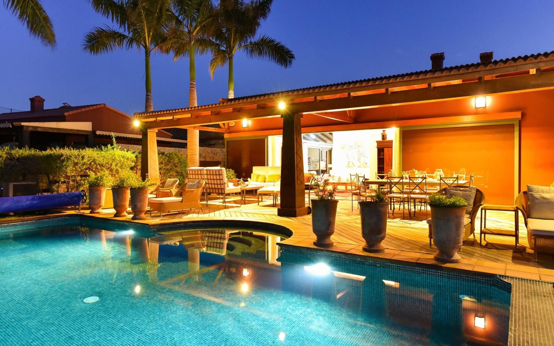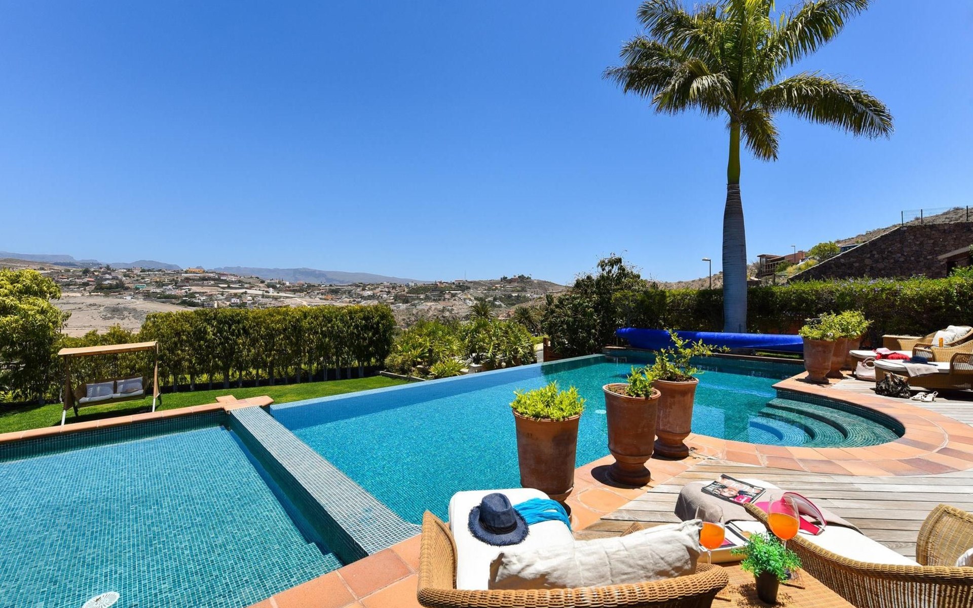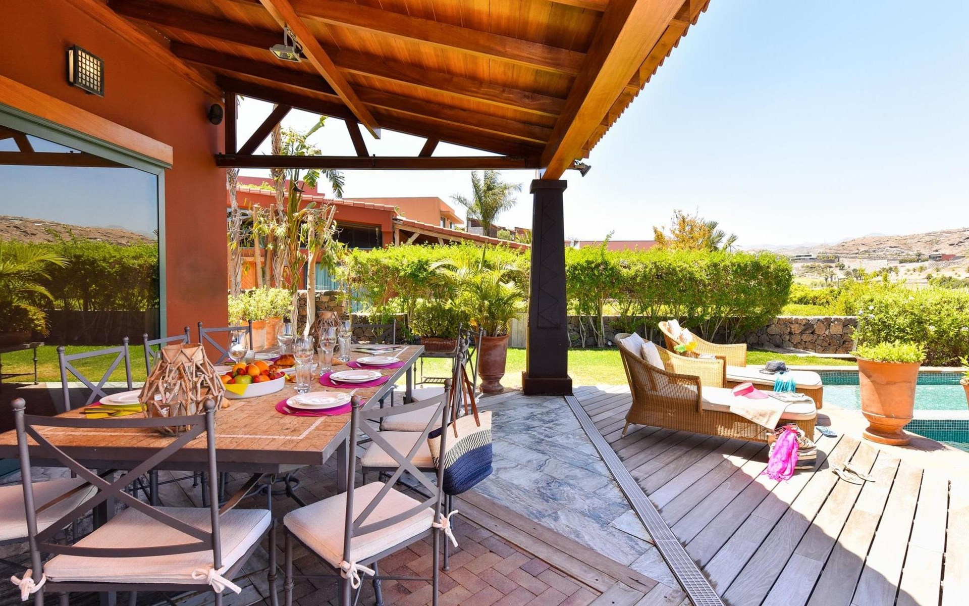 Groot, moderne villa "Canela". In de wijk Maspalomas, in het centrum van Salobre Golf Resort, buiten de plaats Meloneras, rustige, zonnige, verhoogde ligging. Voor medegebruik: terrein 1.000 m2 (omheind), tuin, ligweide. Voor alleengebruik: terrein 1.000 m2 (omheind), tuin, ligweide, openluchtzwembad (10 x 5 m, seizoensgebonden beschikbaarheid: 01.Jan. - 31.Dec.). Kinderzwembad, buitendouche, barbecue. In het huis: Internet (WiFi), centrale verwarming, air-conditioning, wasmachine, droger. Parkeerplaats bij het huis. Winkel, levensmiddelenwinkel 200 m, supermarkt 3 km, restaurant 200 m, bushalte "Las Crucitas" 19 km, zandstrand "3000". Golfterrein (18 holes) 100 m. Auto noodzakelijk. Geschikt voor families, geschikt voor senioren baby uitrusting op aanvraag. De eigenaar accepteert geen jeugdgroepen. Autobaan 1 km van het huis. Hoofdstraat 50 m van het huis. De omgeving is gevoelig voor geluidsoverlast. Gelieve geen lawaai te maken en de rust te bewaren.