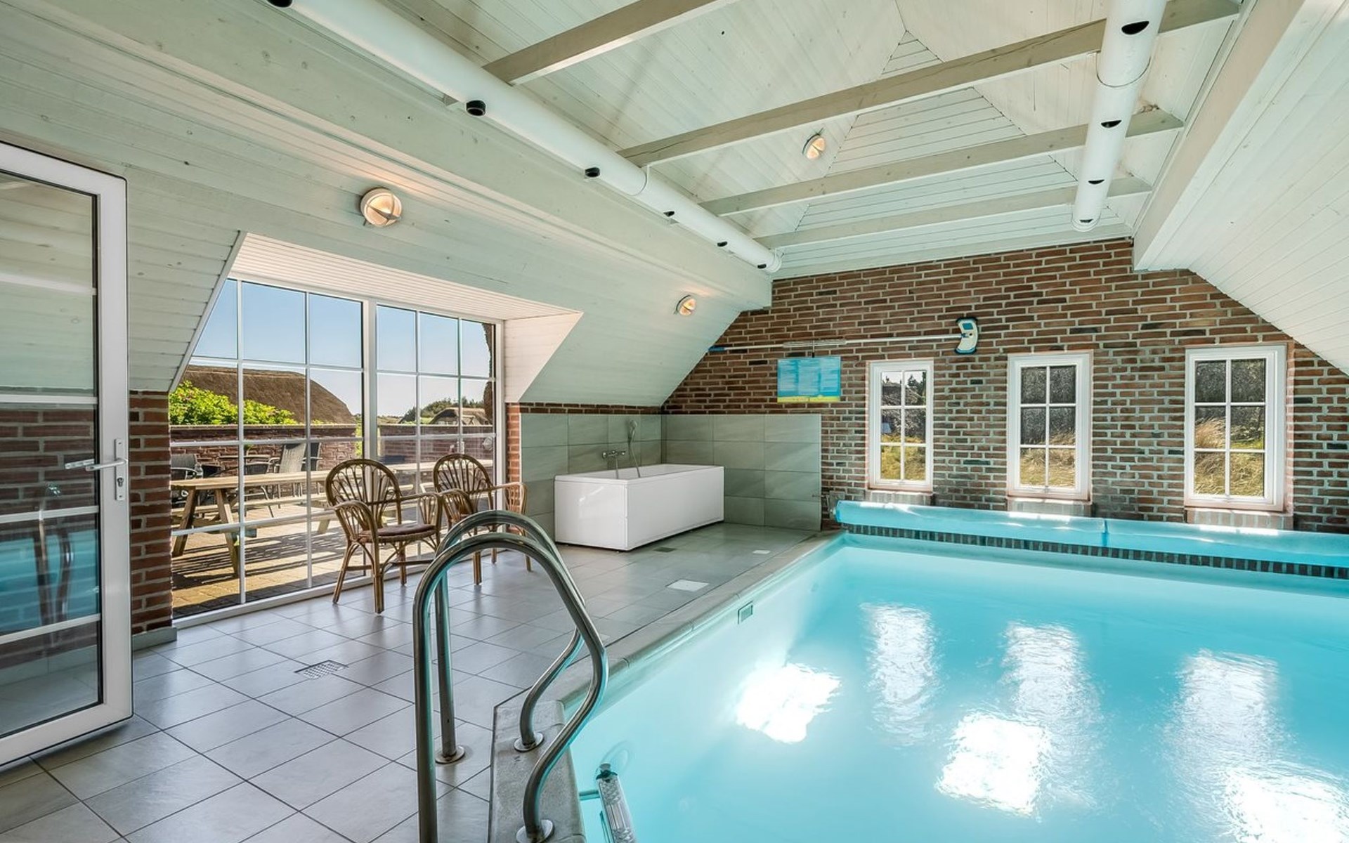 Eengezinswoning, bouwjaar 1991. 700 m van zee. Voor alleengebruik: wild terrein 2.882 m2, overdekt zwembad (3 x 5 m, 15 m2, 120 - 120 cm diepte). Barbecue. In het huis: sauna, wasmachine, droger. Parkeerplaats bij het huis. Levensmiddelenwinkel 6 km. Golfterrein 7 km.