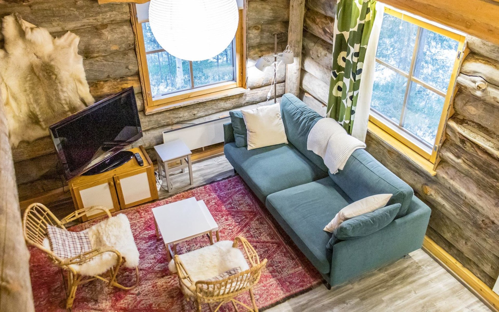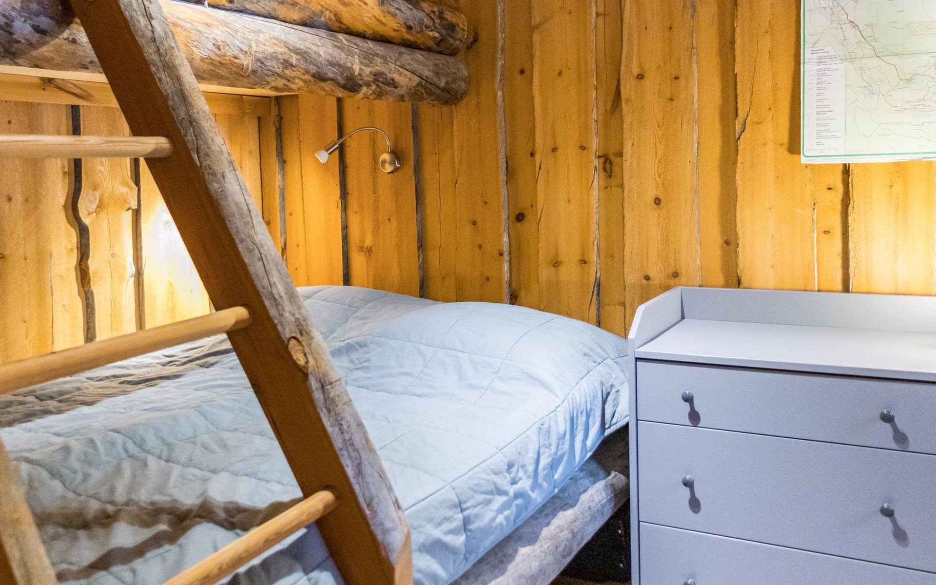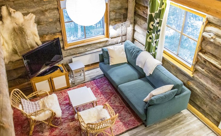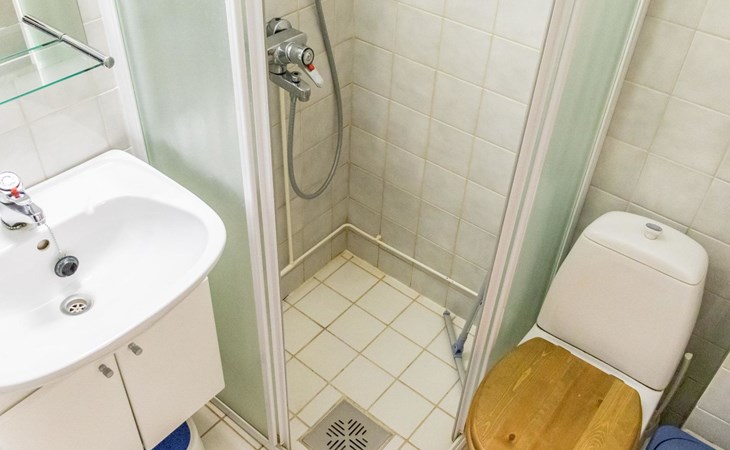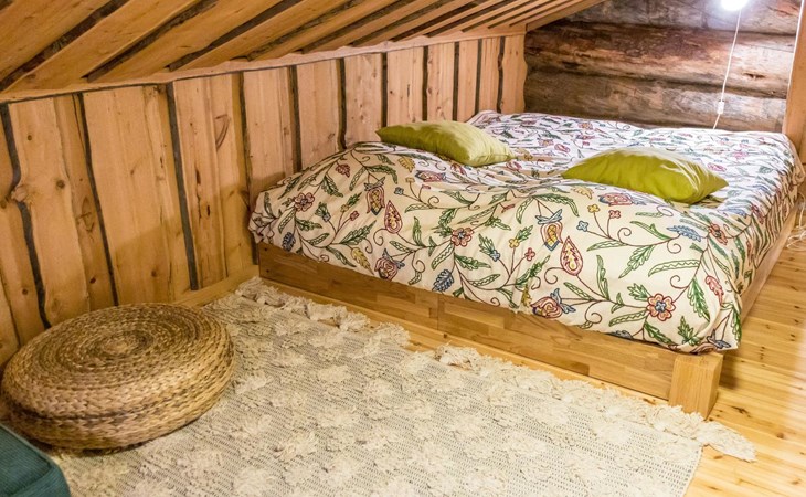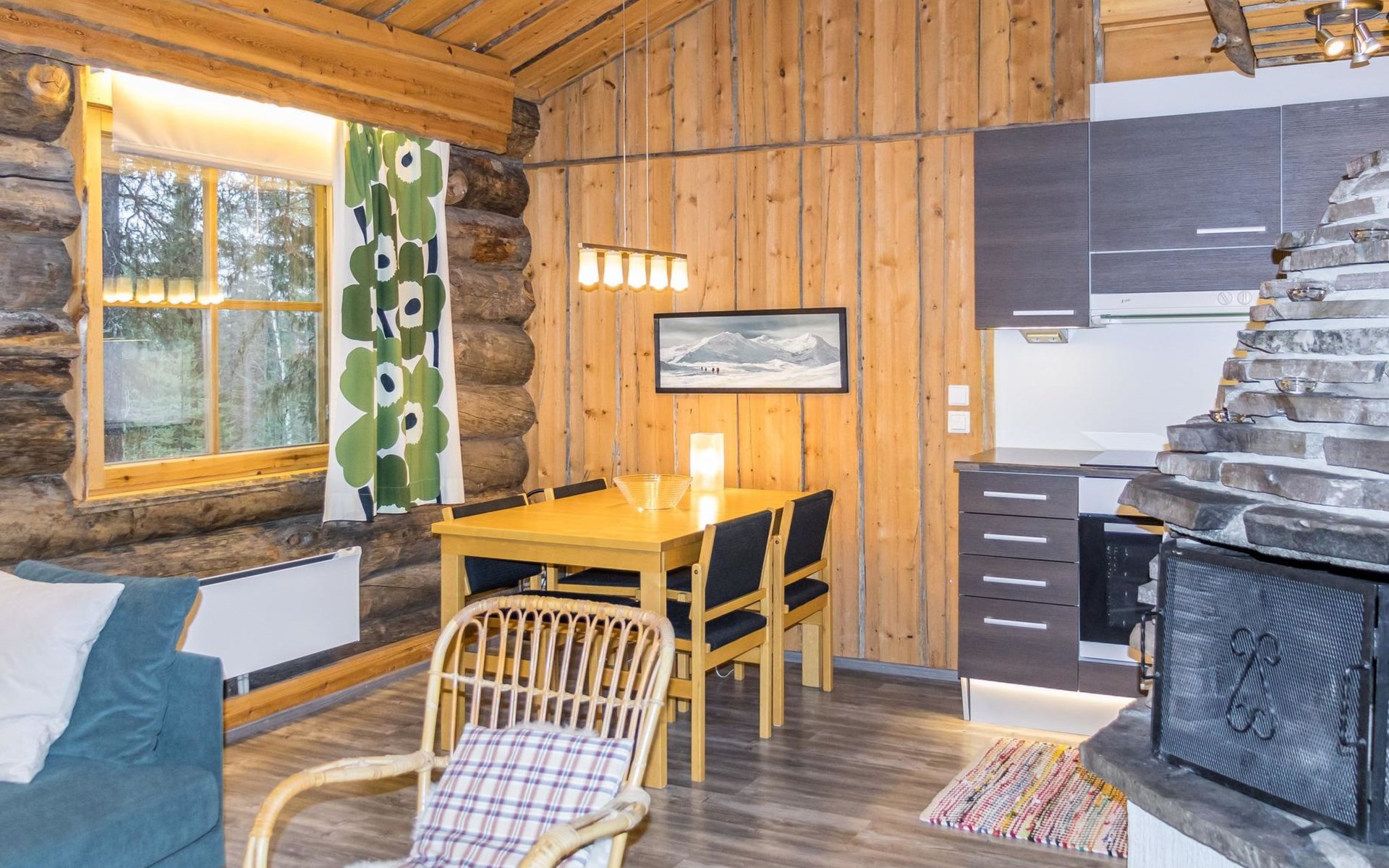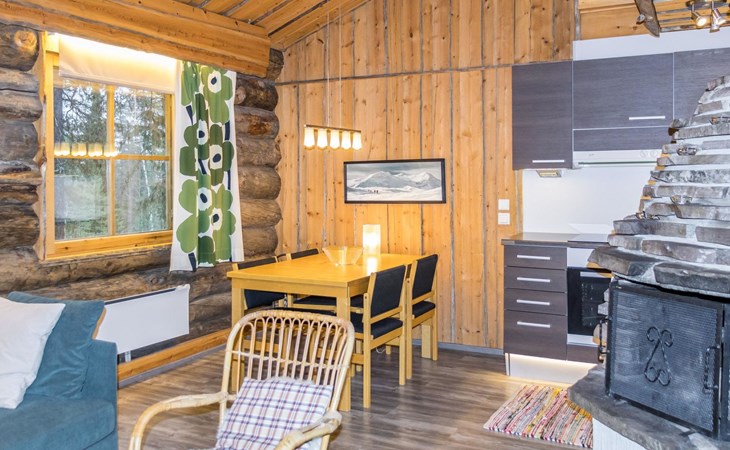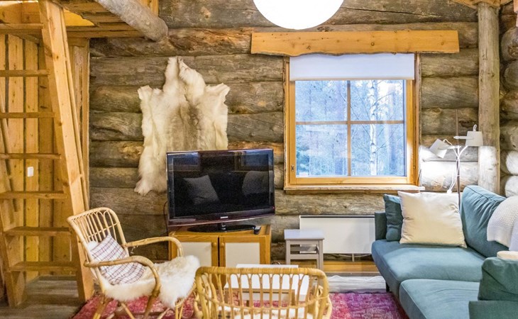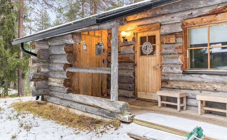 Silverlog row house apartment built in 1990. Living room, kitchen, bedroom bunked bed (bottom 140cm, upper bed 80cm), sleeping loft (to which steep stairs) 160cm double bed, washroom, sauna (elec. stove). There is a small book and DVD library. Separate food freezer is in the sleeping loft upstairs.