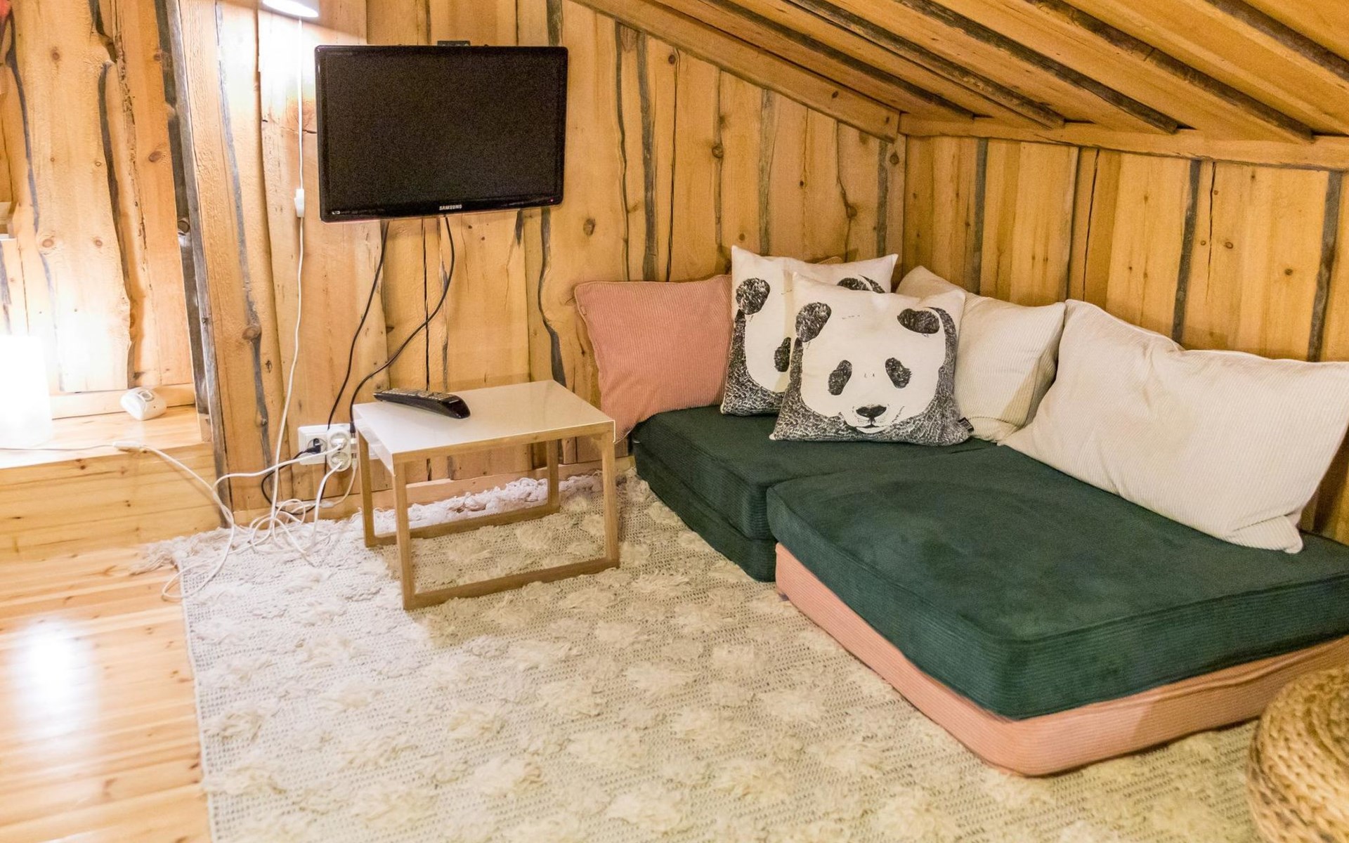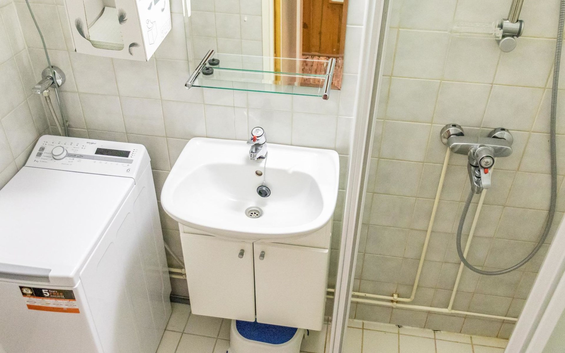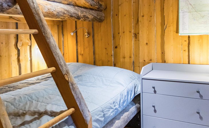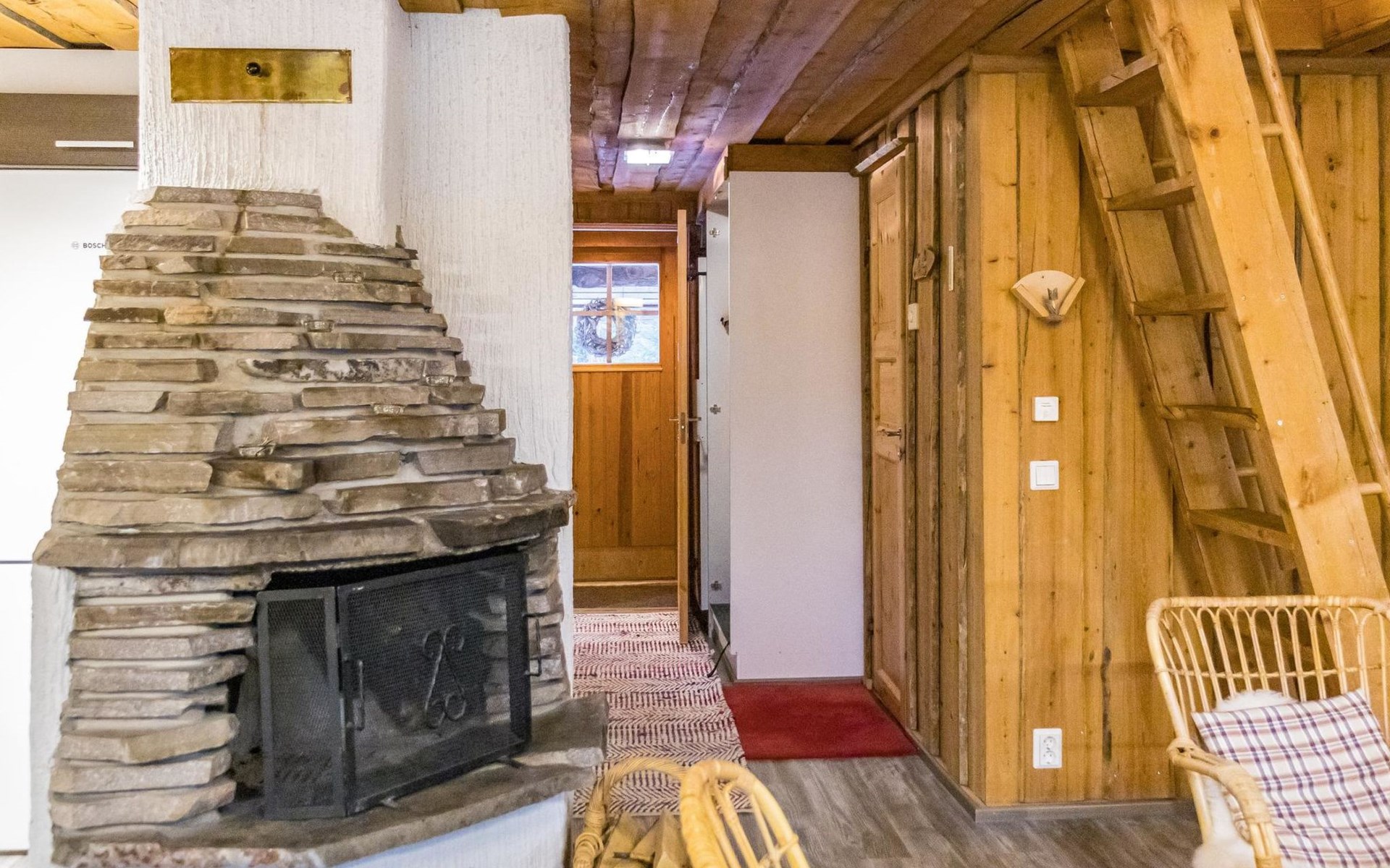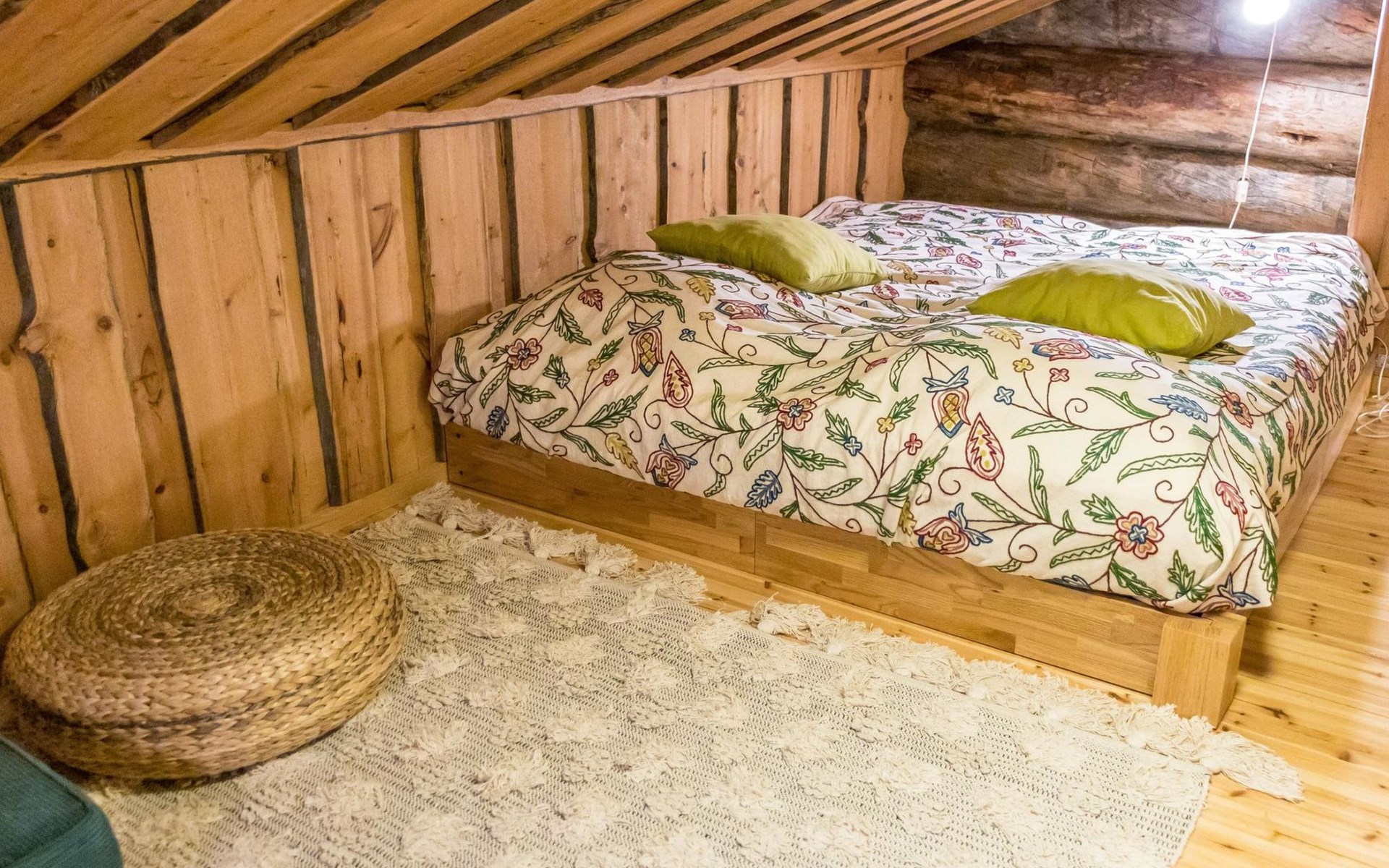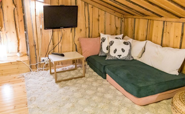 Silverlog row house apartment built in 1990. Living room, kitchen, bedroom bunked bed (bottom 140cm, upper bed 80cm), sleeping loft (to which steep stairs) 160cm double bed, washroom, sauna (elec. stove). There is a small book and DVD library. Separate food freezer is in the sleeping loft upstairs.