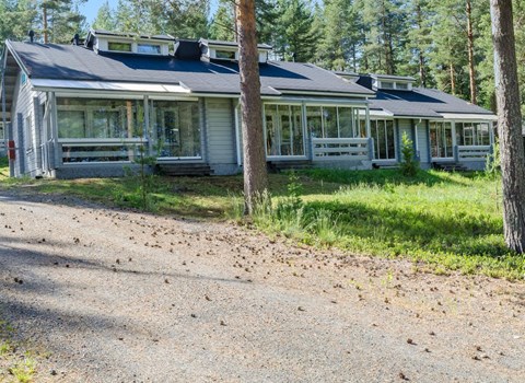 Silverlog row house apartment built in 1990. Living room, kitchen, bedroom bunked bed (bottom 140cm, upper bed 80cm), sleeping loft (to which steep stairs) 160cm double bed, washroom, sauna (elec. stove). There is a small book and DVD library. Separate food freezer is in the sleeping loft upstairs.