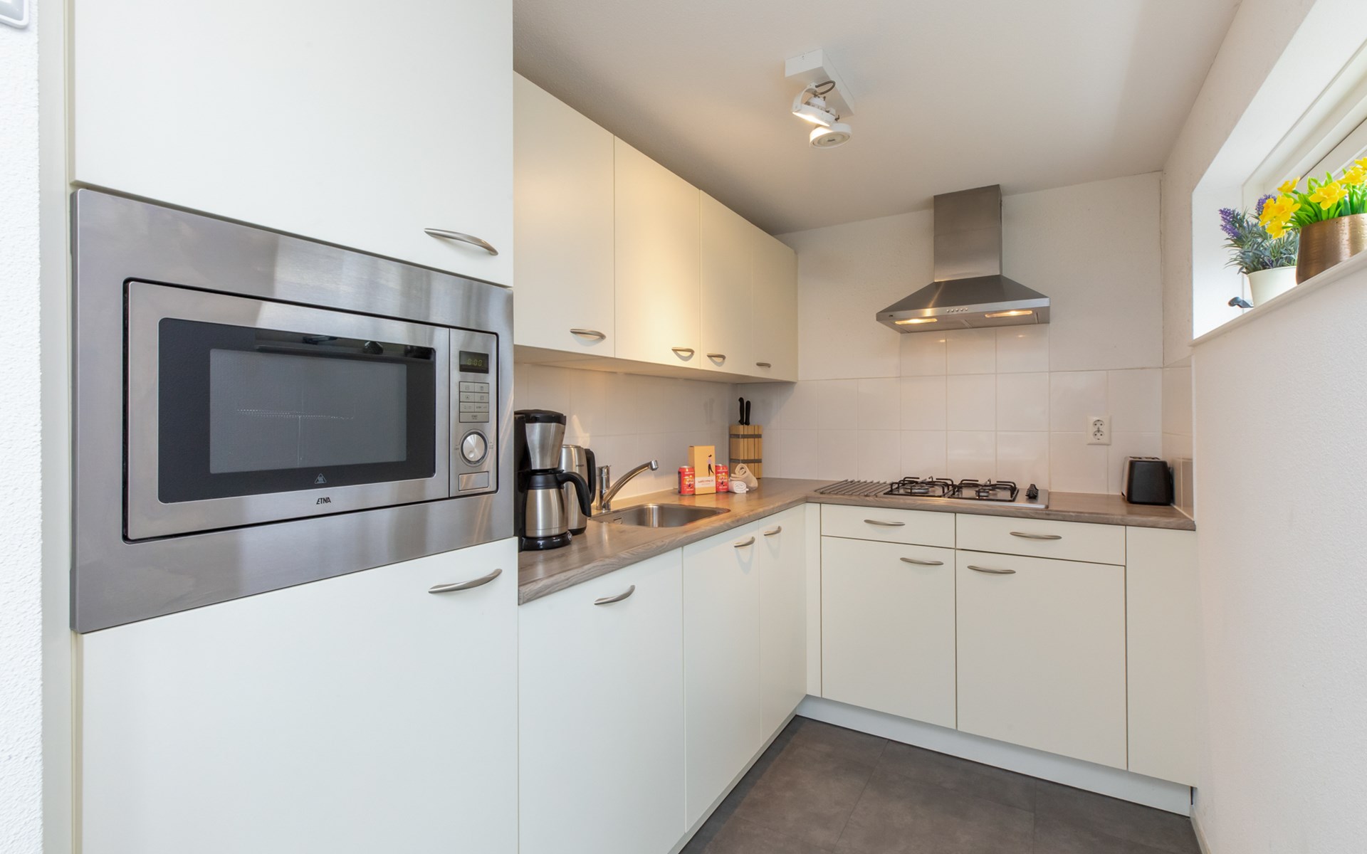 De open keuken is volledig uitgerust met alles wat je nodig hebt om culinair uit te pakken. Je vindt er een kookplaat, combi-magnetron, vaatwasser en een koelkast met vriesvakje. Voor de koffieliefhebbers is er een filter koffiezetapparaat, en theefans kunnen gebruikmaken van de waterkoker. In de aangrenzende eethoek kun je samen genieten van je zelfbereide maaltijden.