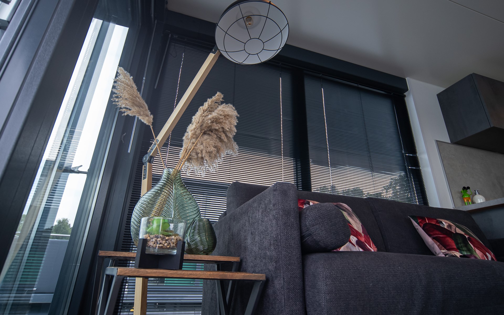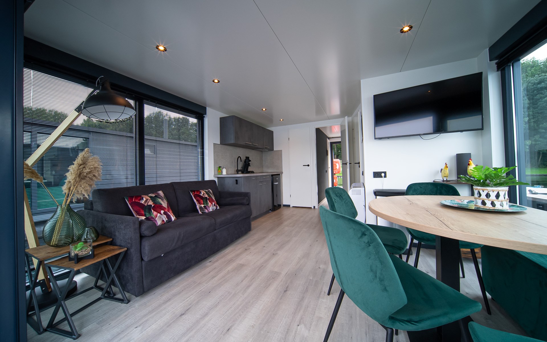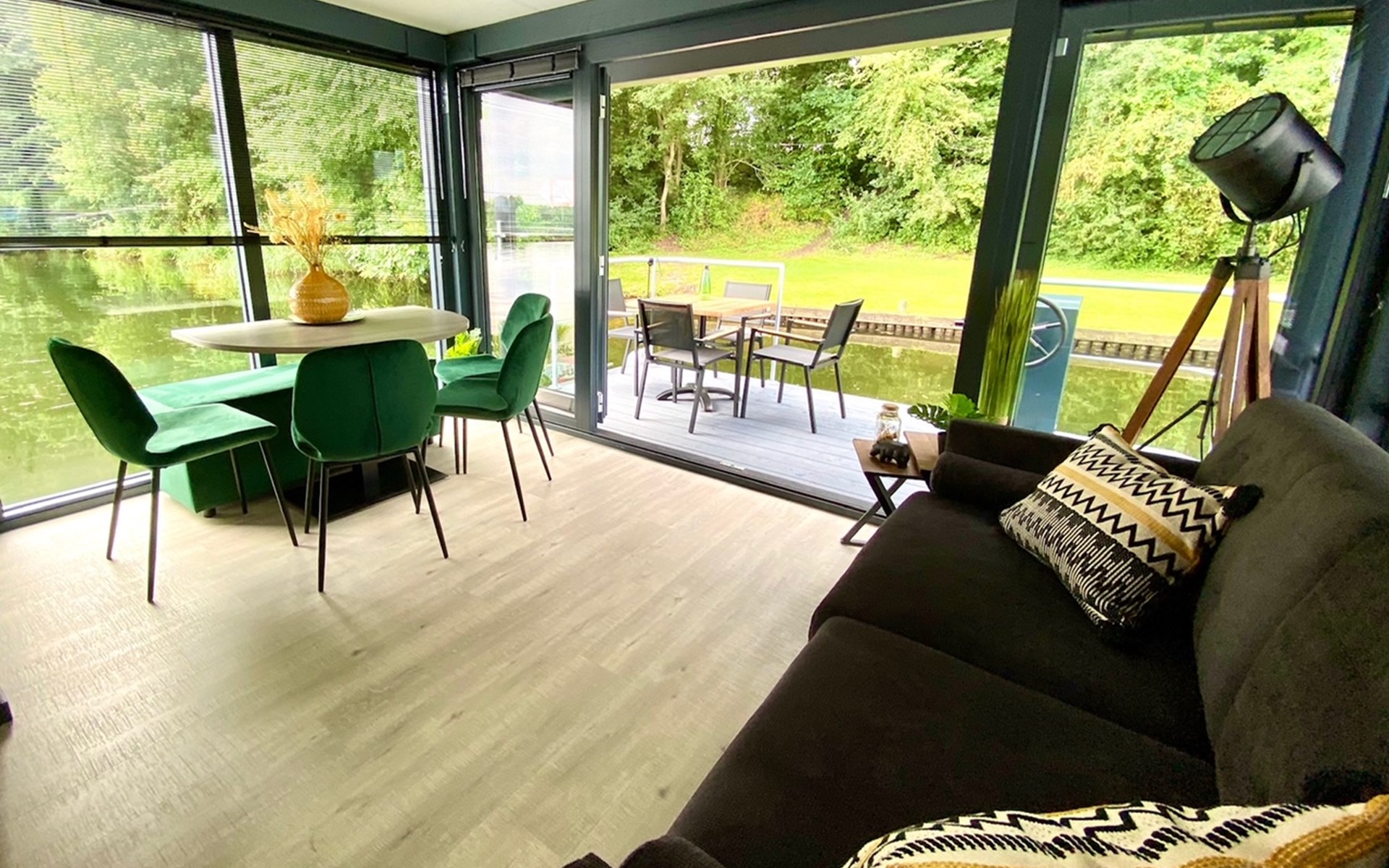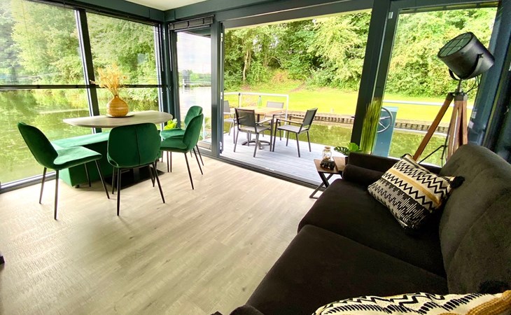 Woonkamer: comfortabele zitbank en eettafel, met grote ramen die panoramisch uitzicht bieden over het meer. Vanuit hier stap je direct het terras op, met zicht op de hottub.