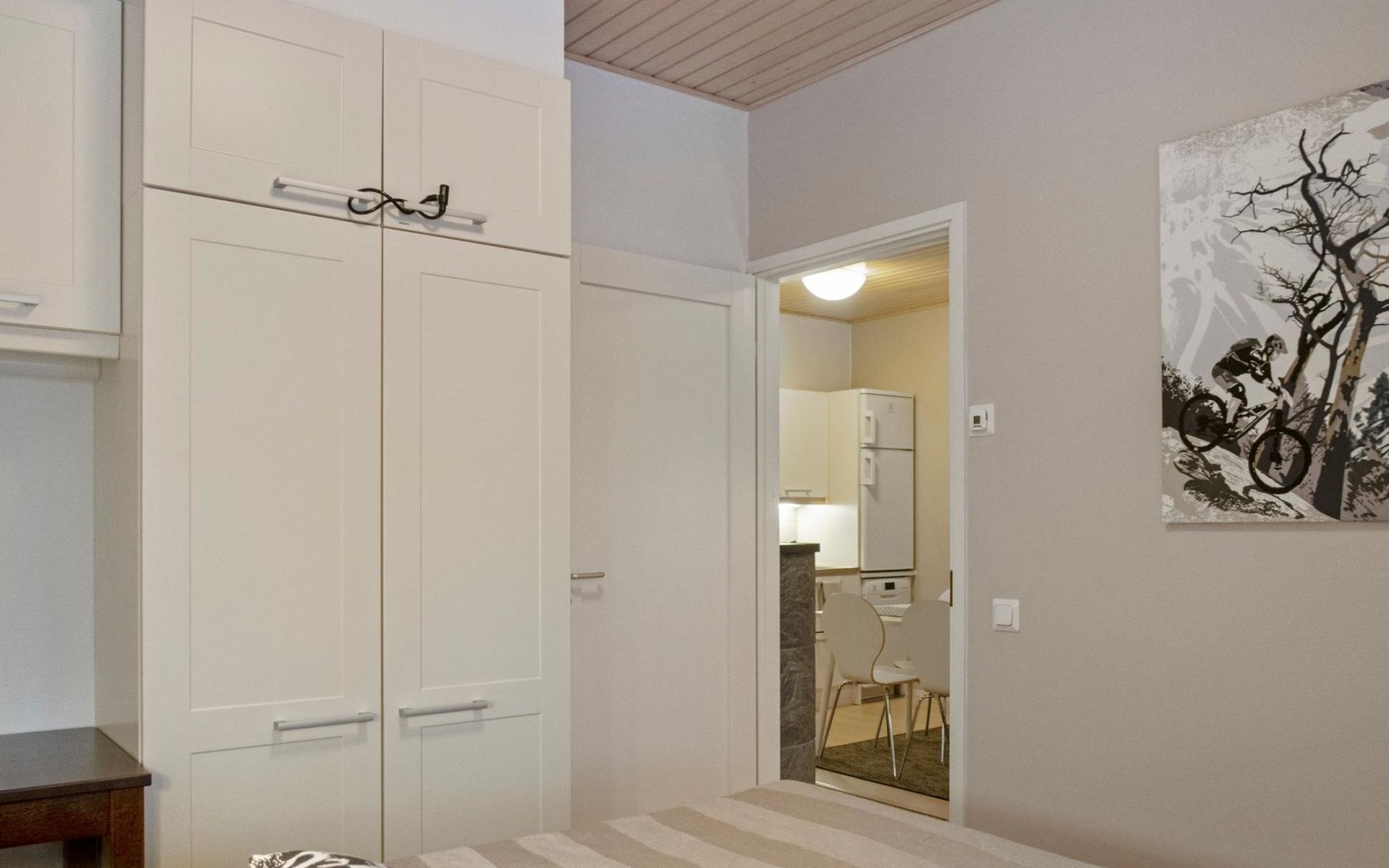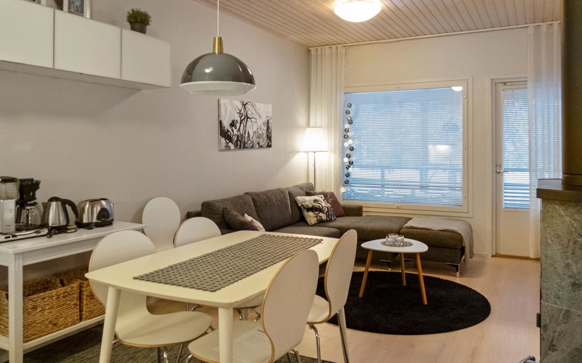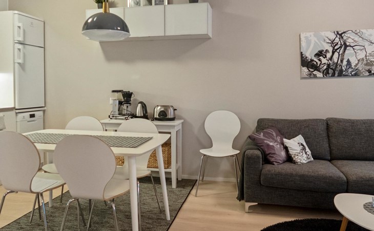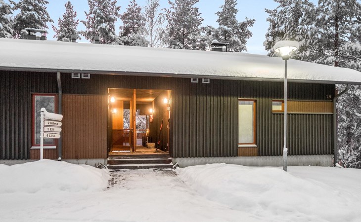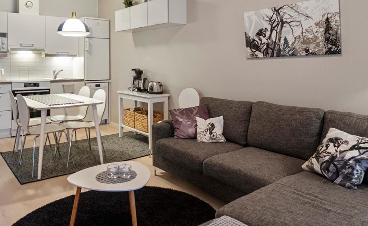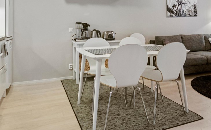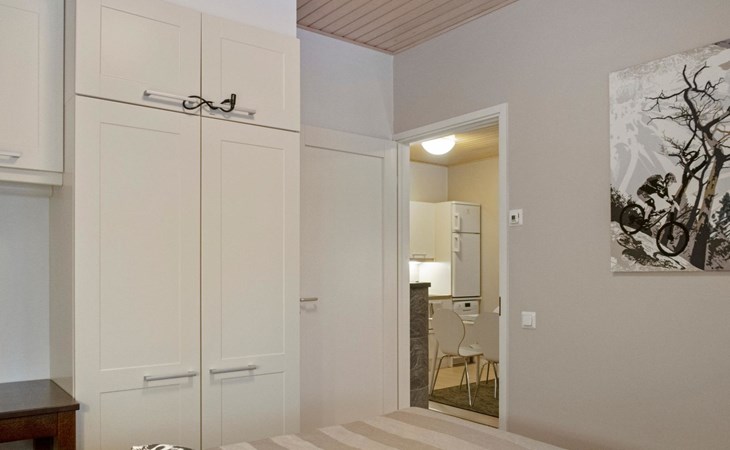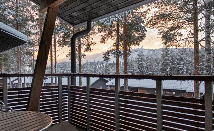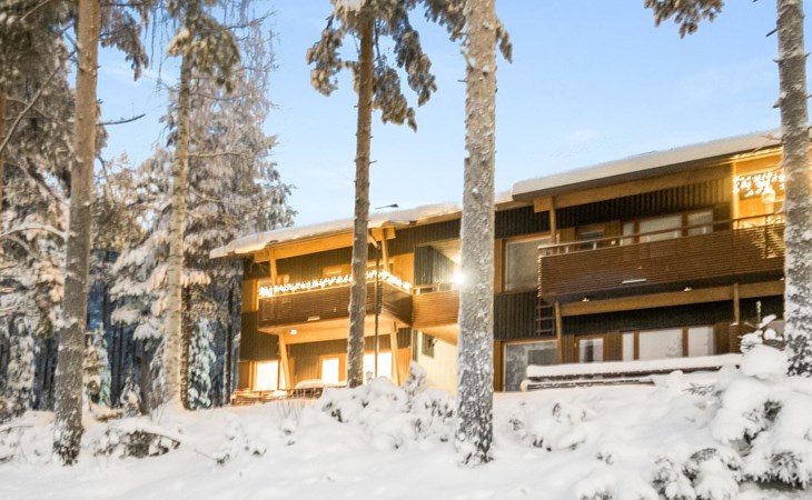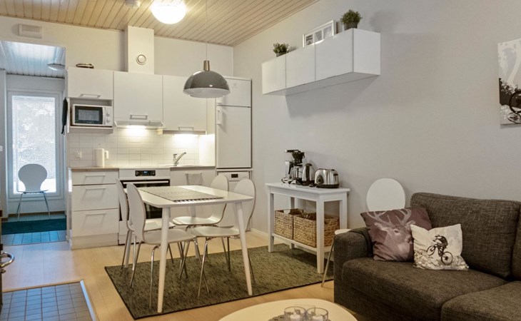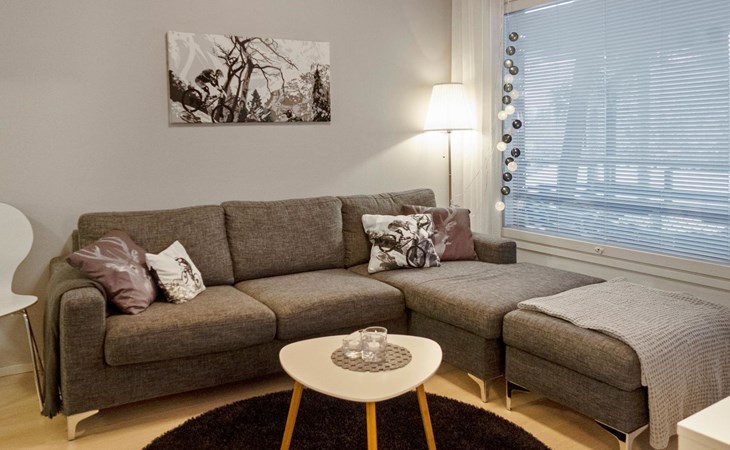AINO apartment is 50 m² on one level. Bright living room/kitchen, windows and balcony facing the slopes of Vuokatti. Two bedrooms, one bedroom has a double bed and the other has separate beds for two. Washroom/toilet, sauna (electric stove). Balcony with furniture for 4 and a gas grill in use during the summer season.