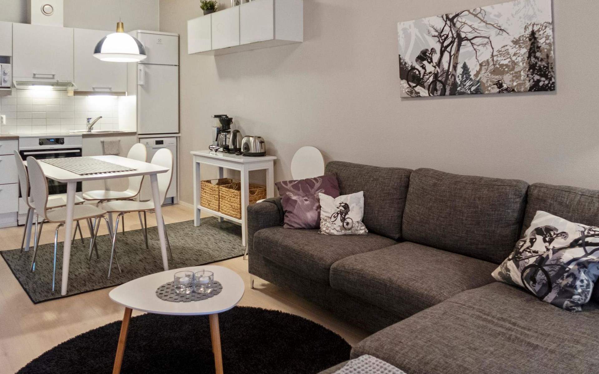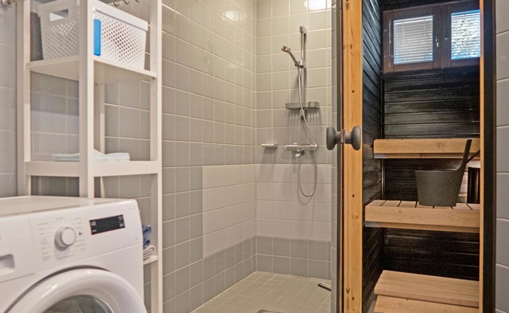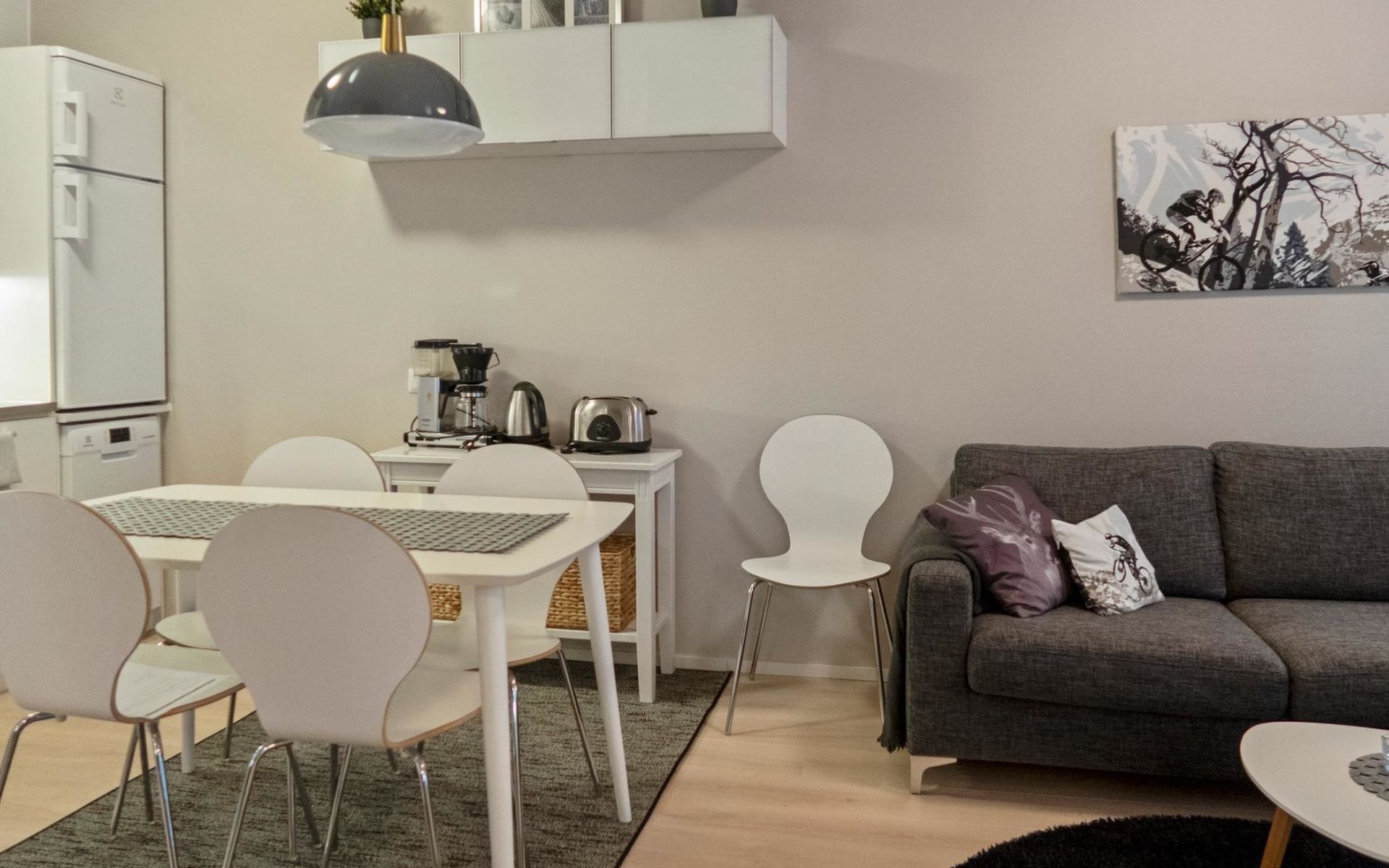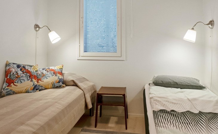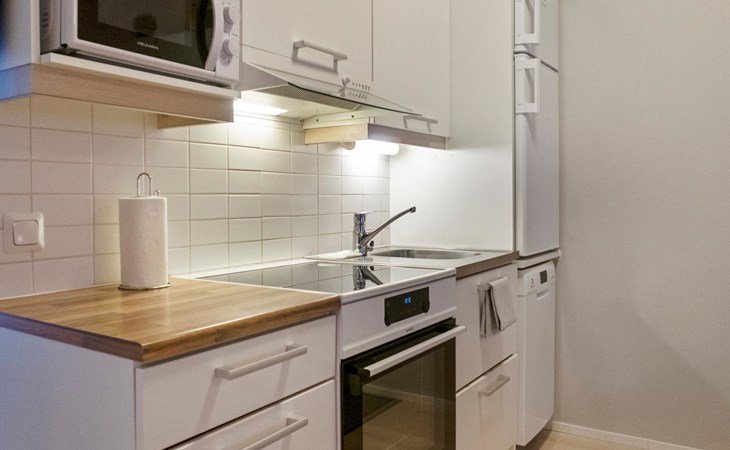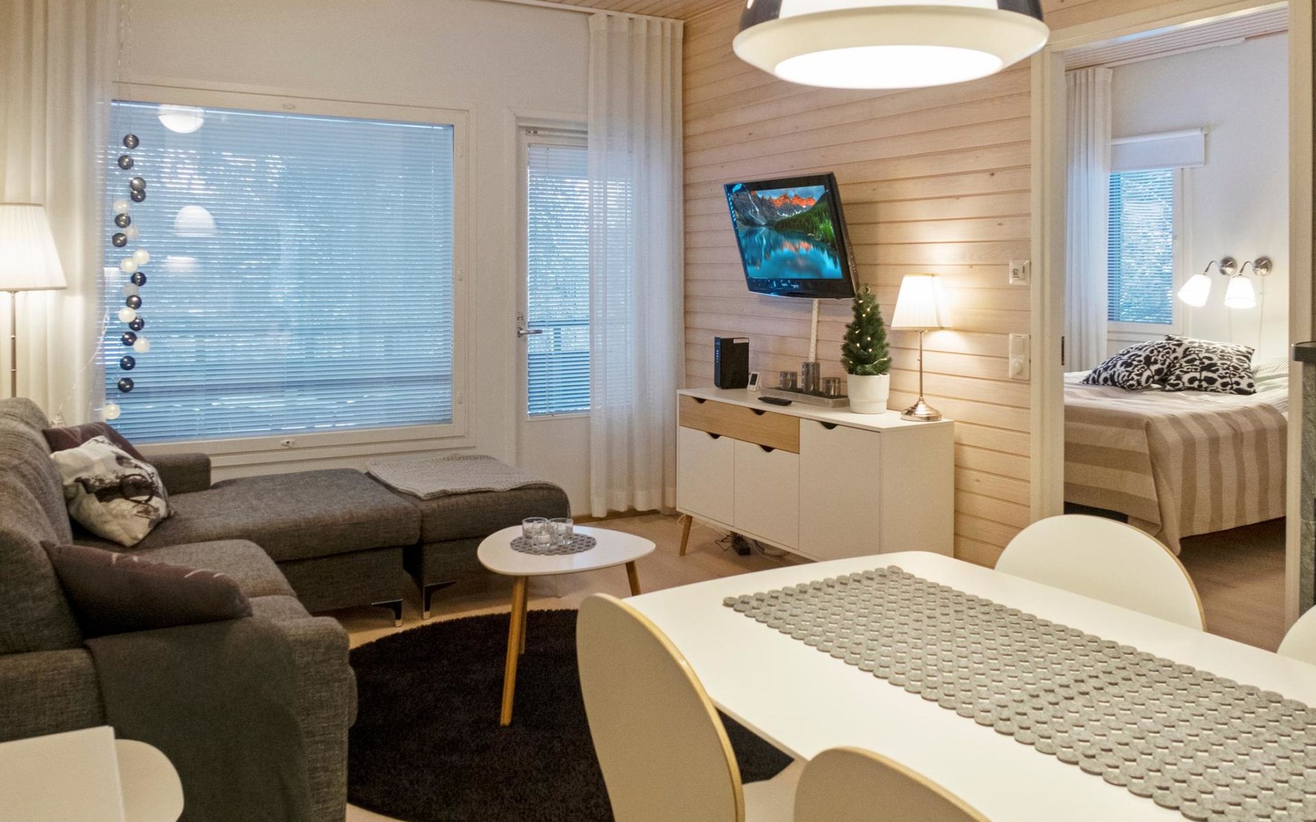 AINO apartment is 50 m² on one level. Bright living room/kitchen, windows and balcony facing the slopes of Vuokatti. Two bedrooms, one bedroom has a double bed and the other has separate beds for two. Washroom/toilet, sauna (electric stove). Balcony with furniture for 4 and a gas grill in use during the summer season.