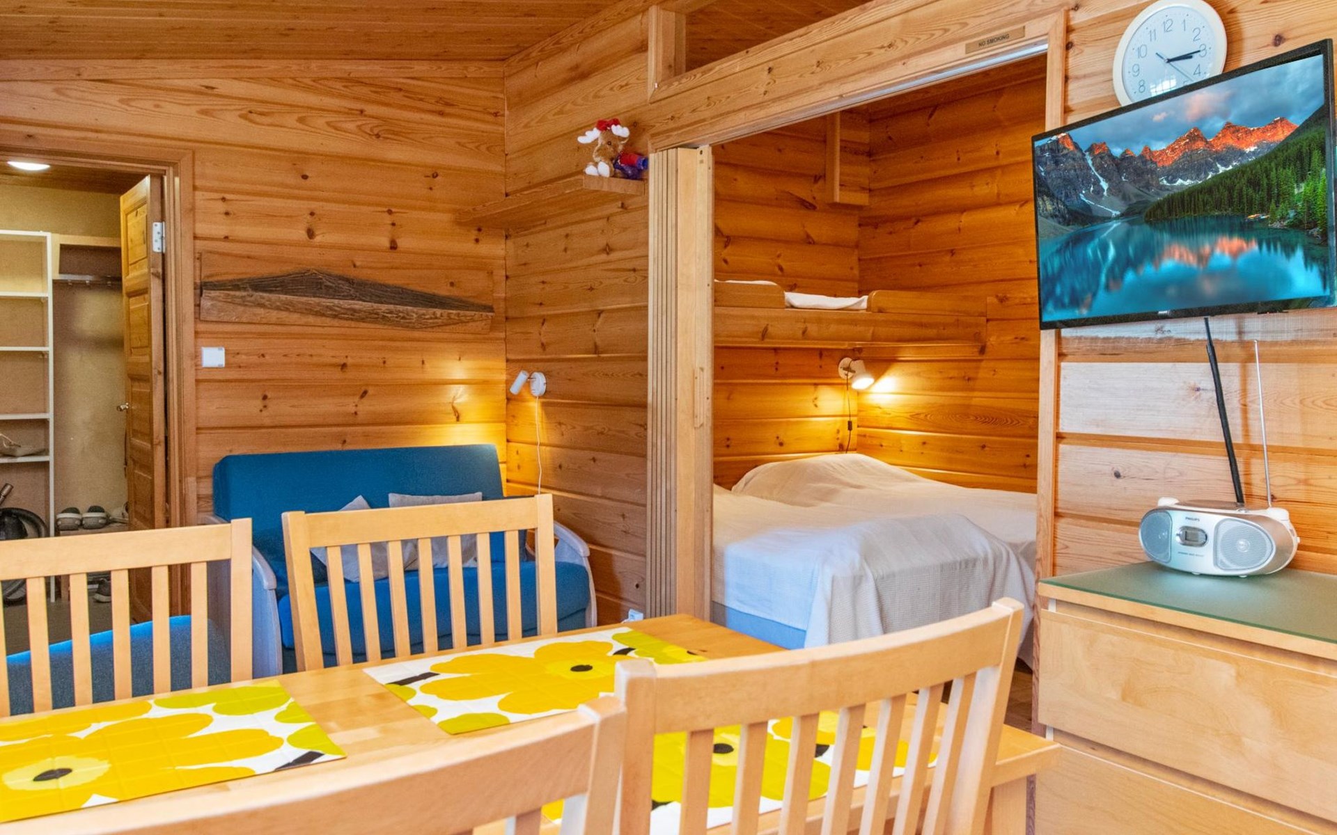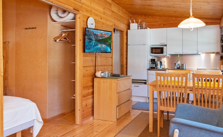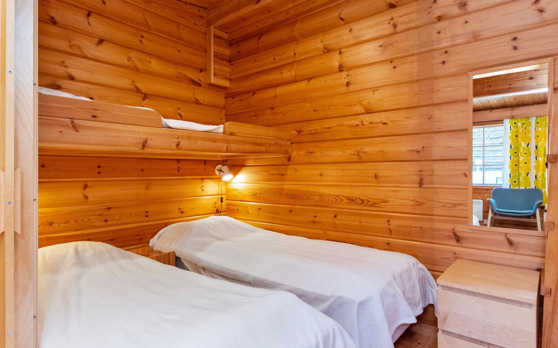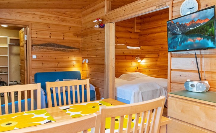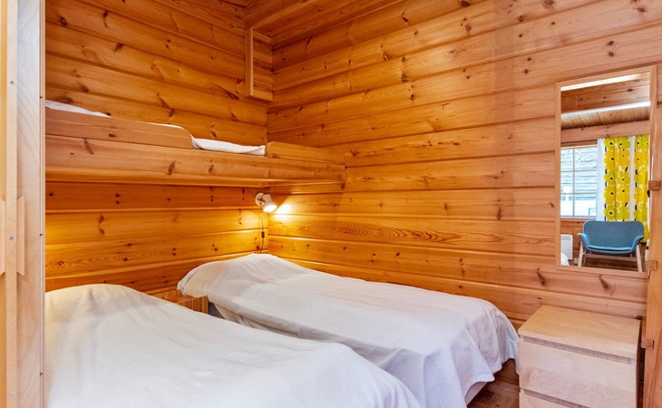 The bedroom, which closes with a sliding door, has two single beds and one upper bed above the beds. In addition, the living room has a sofa bed 120 cm wide and 190 cm long, providing extra sleeping space.