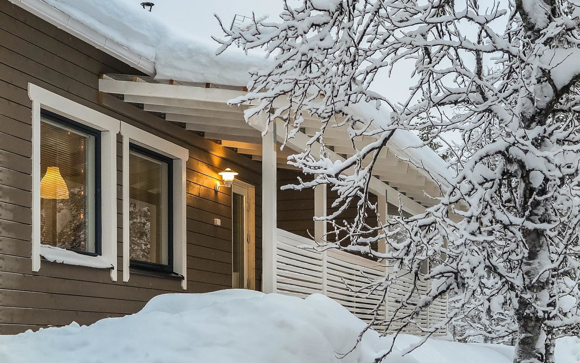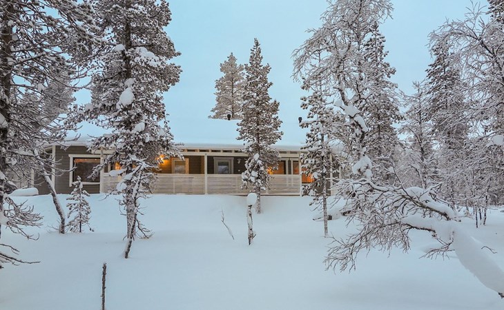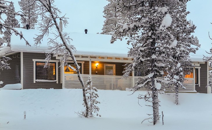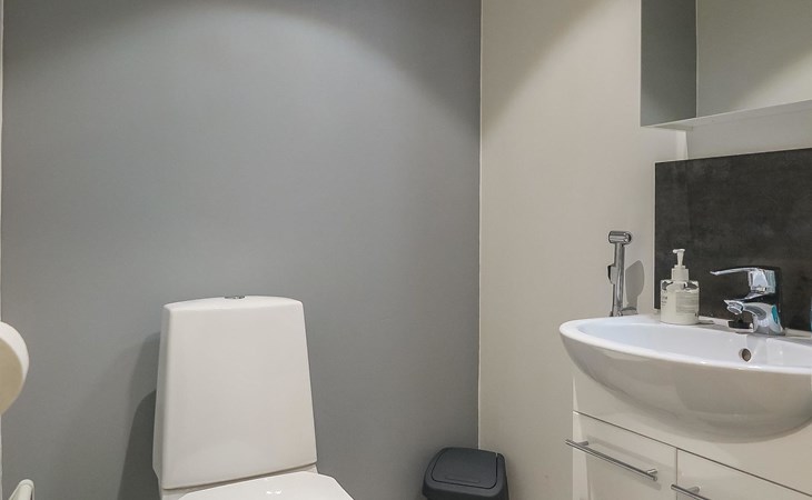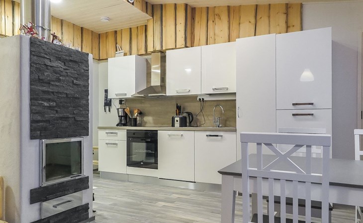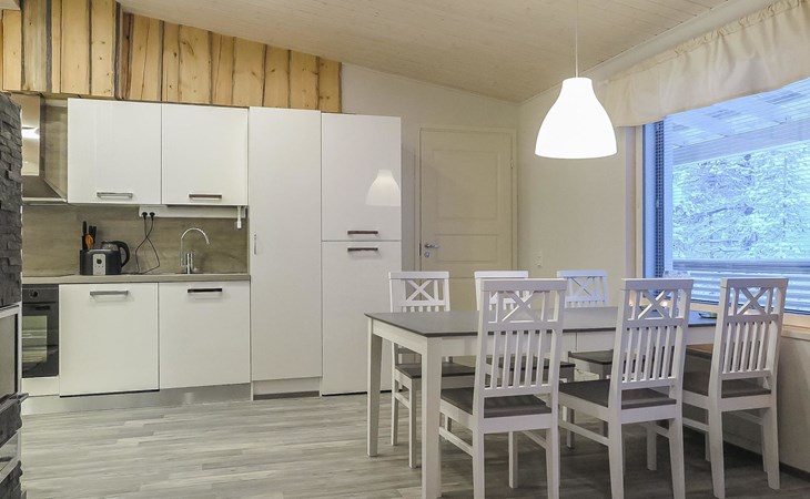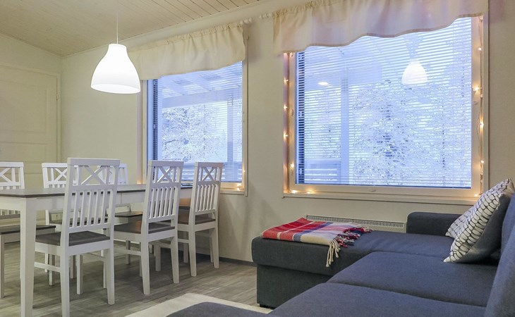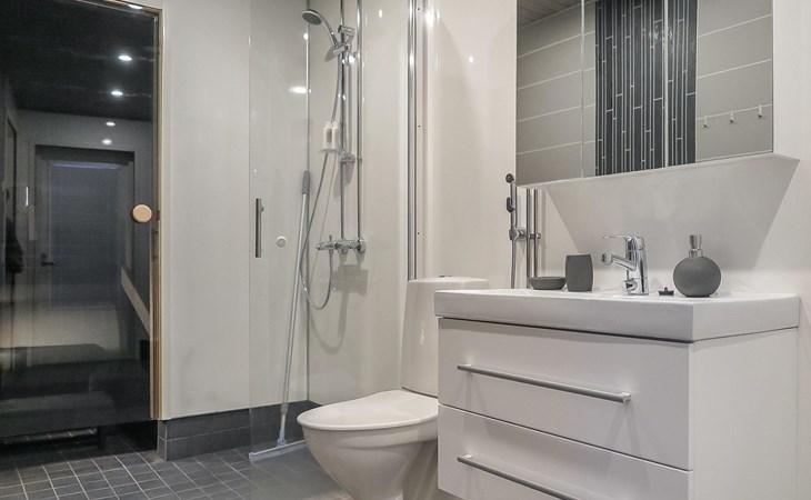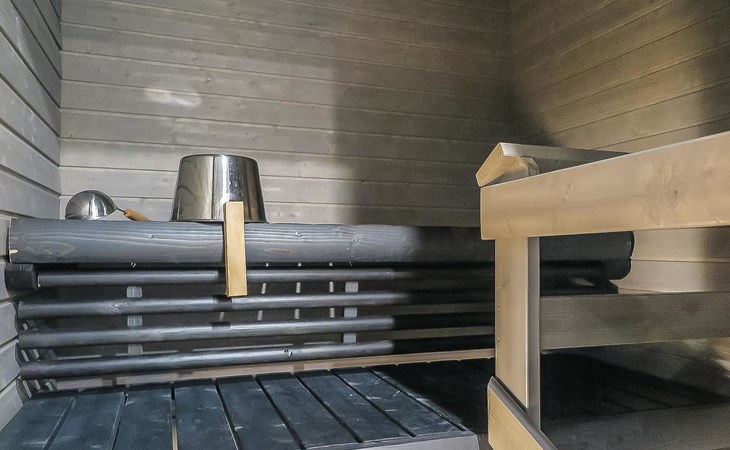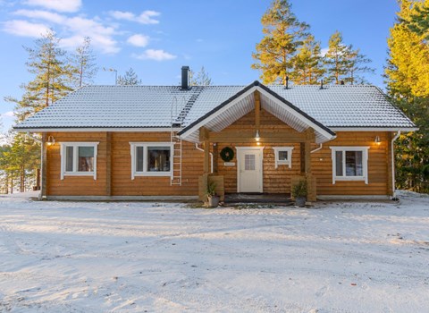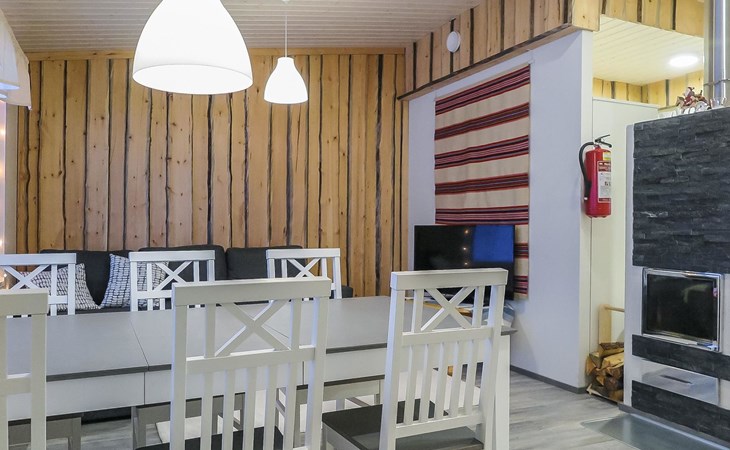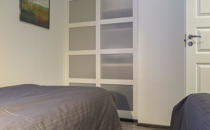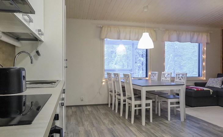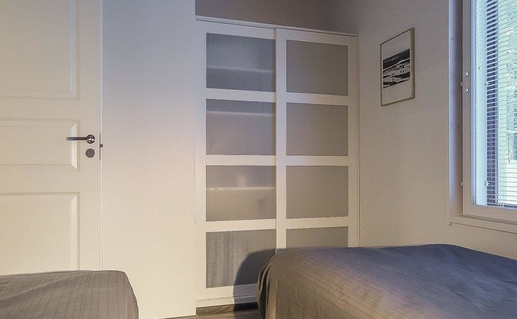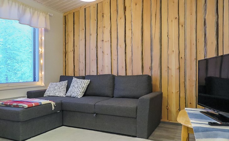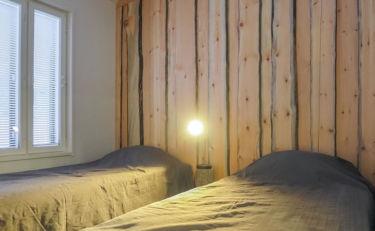 Apartment in semi-detached wooden house, built in 2019. Living room/kitchen with convertible sofa, 2 bedrooms with 2 beds, sauna, washroom/WC, separate WC, covered open veranda and storeroom.