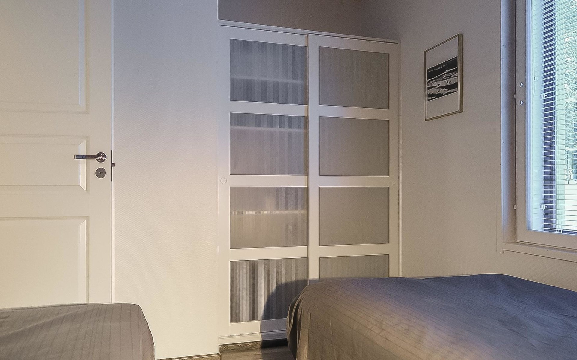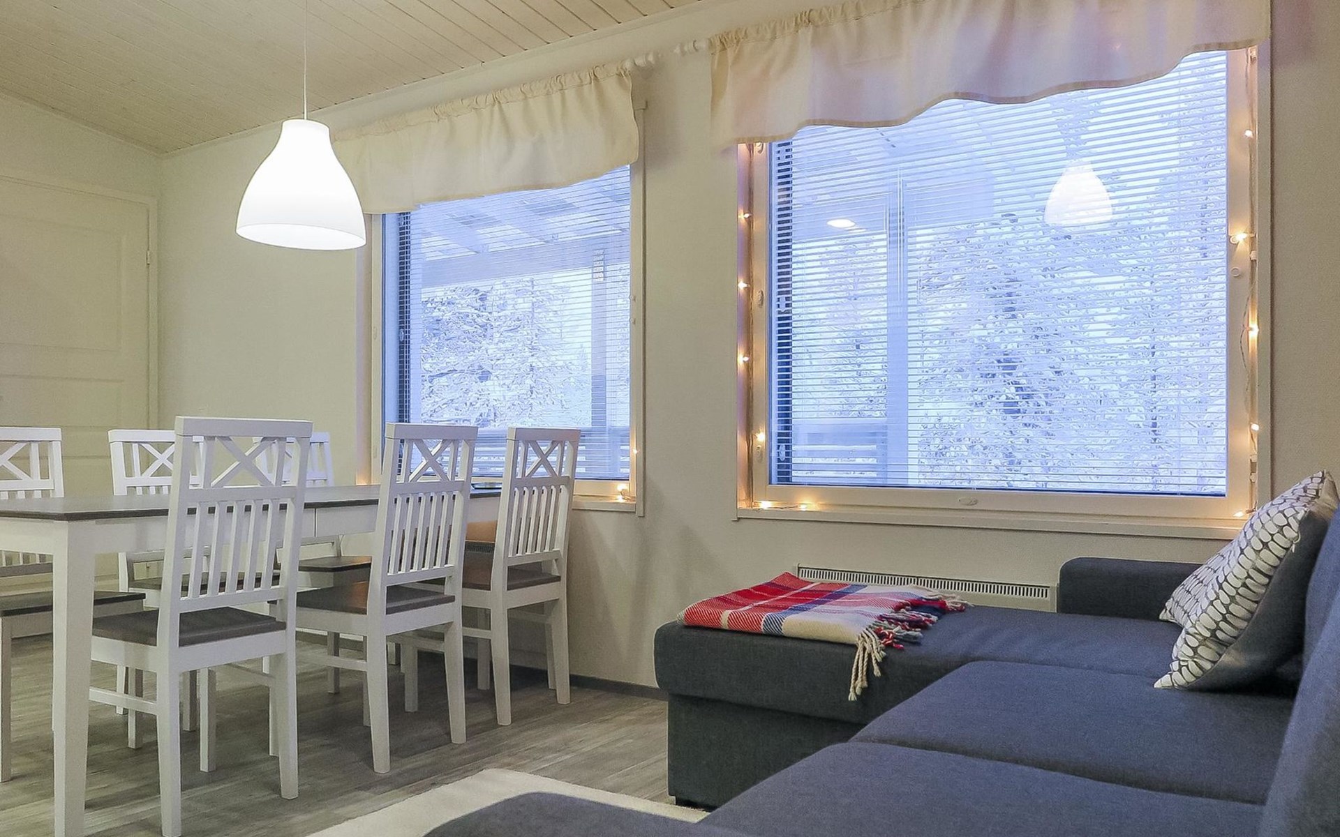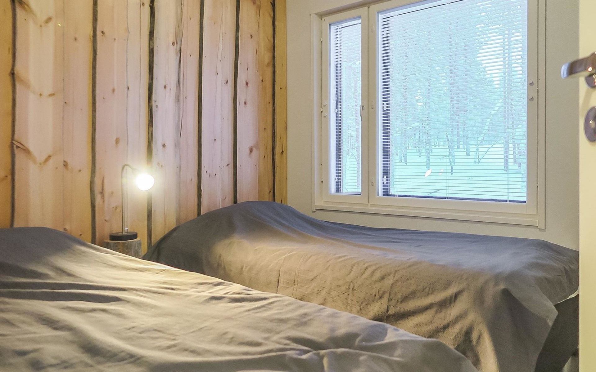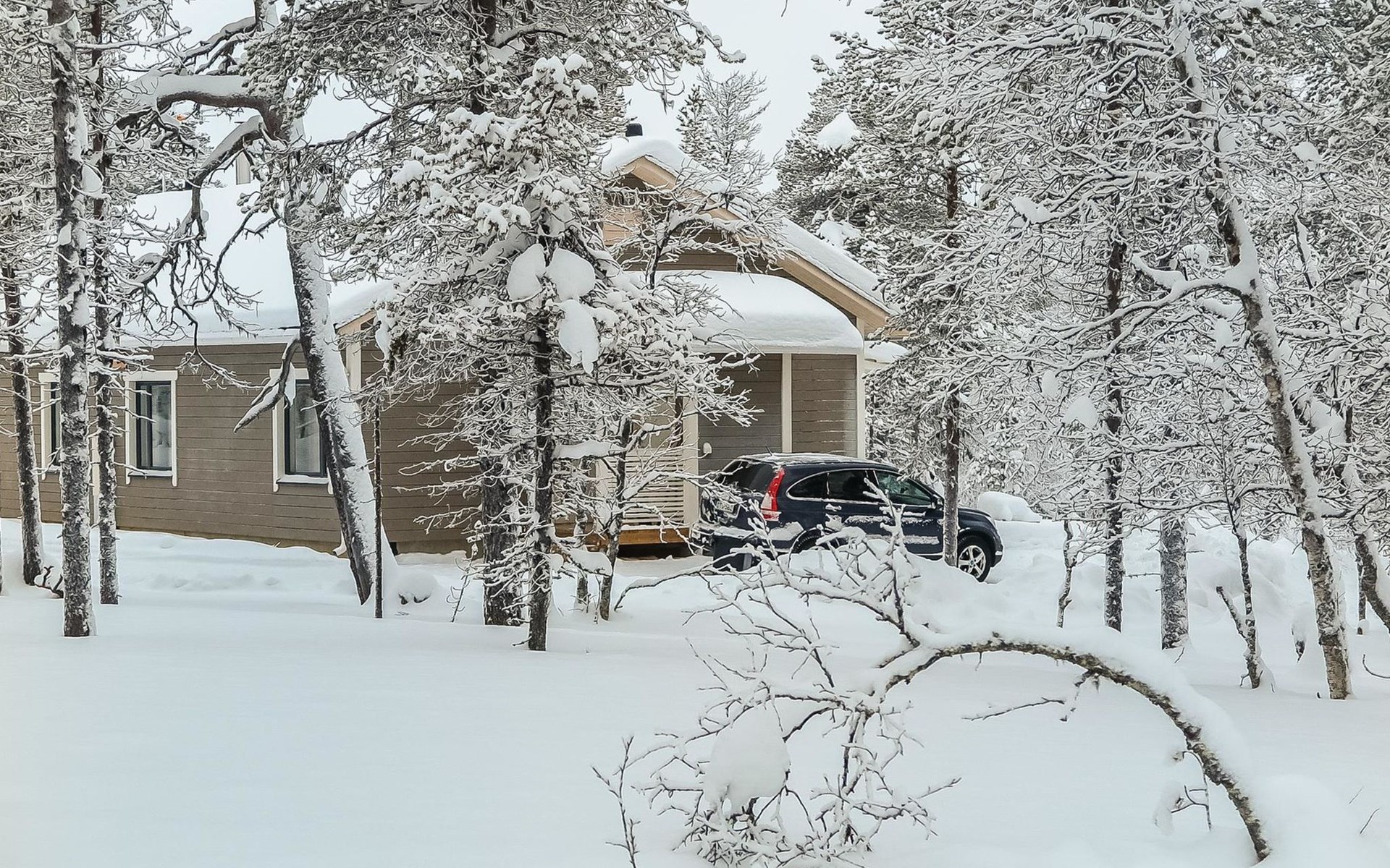 Apartment in semi-detached wooden house, built in 2019. Living room/kitchen with convertible sofa, 2 bedrooms with 2 beds, sauna, washroom/WC, separate WC, covered open veranda and storeroom.