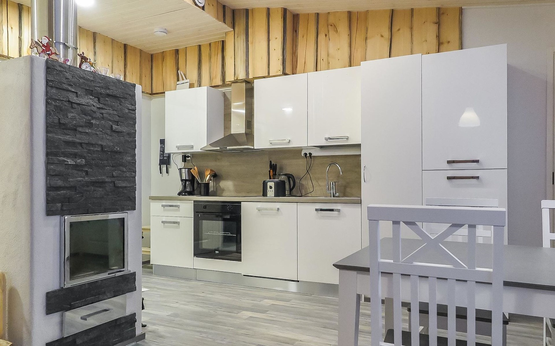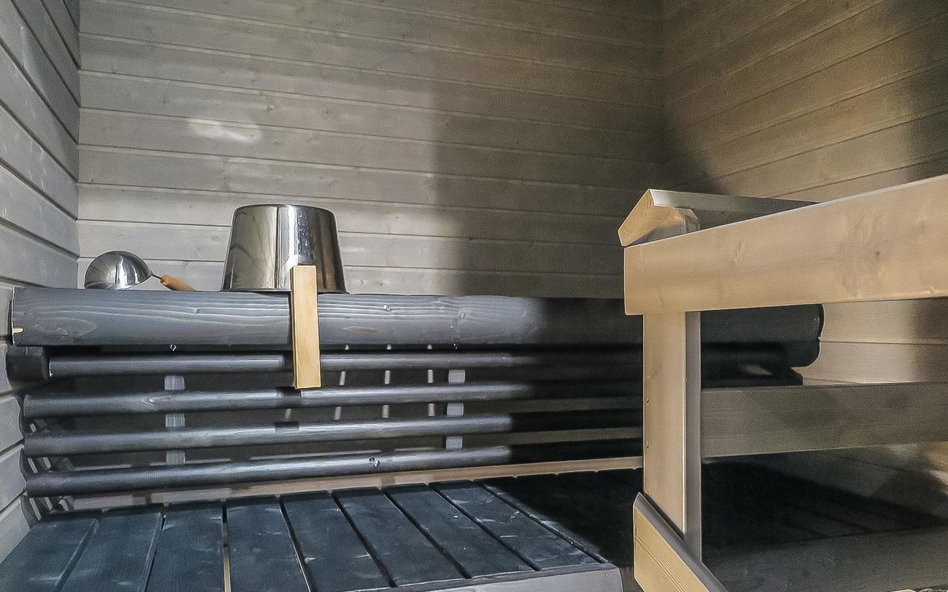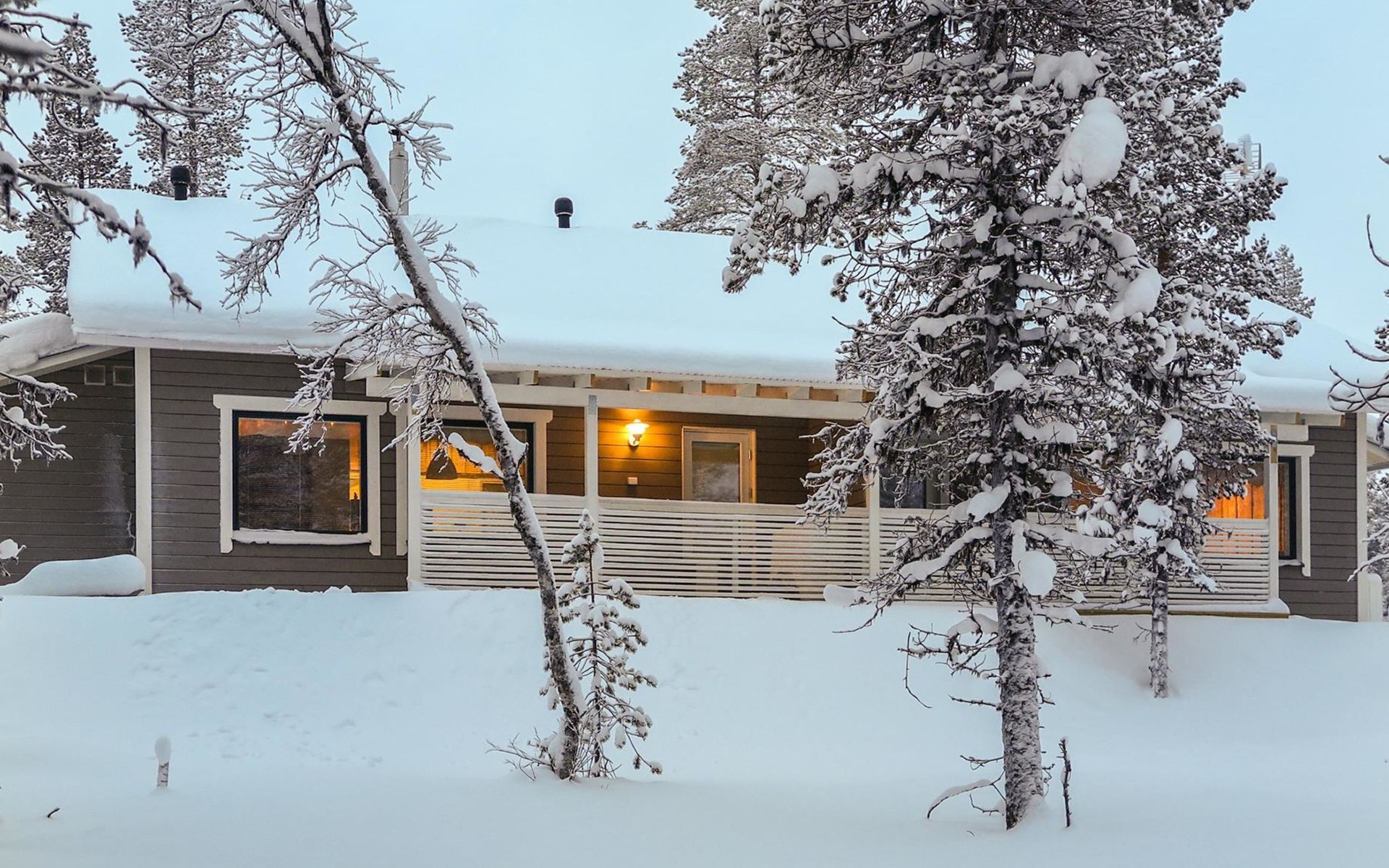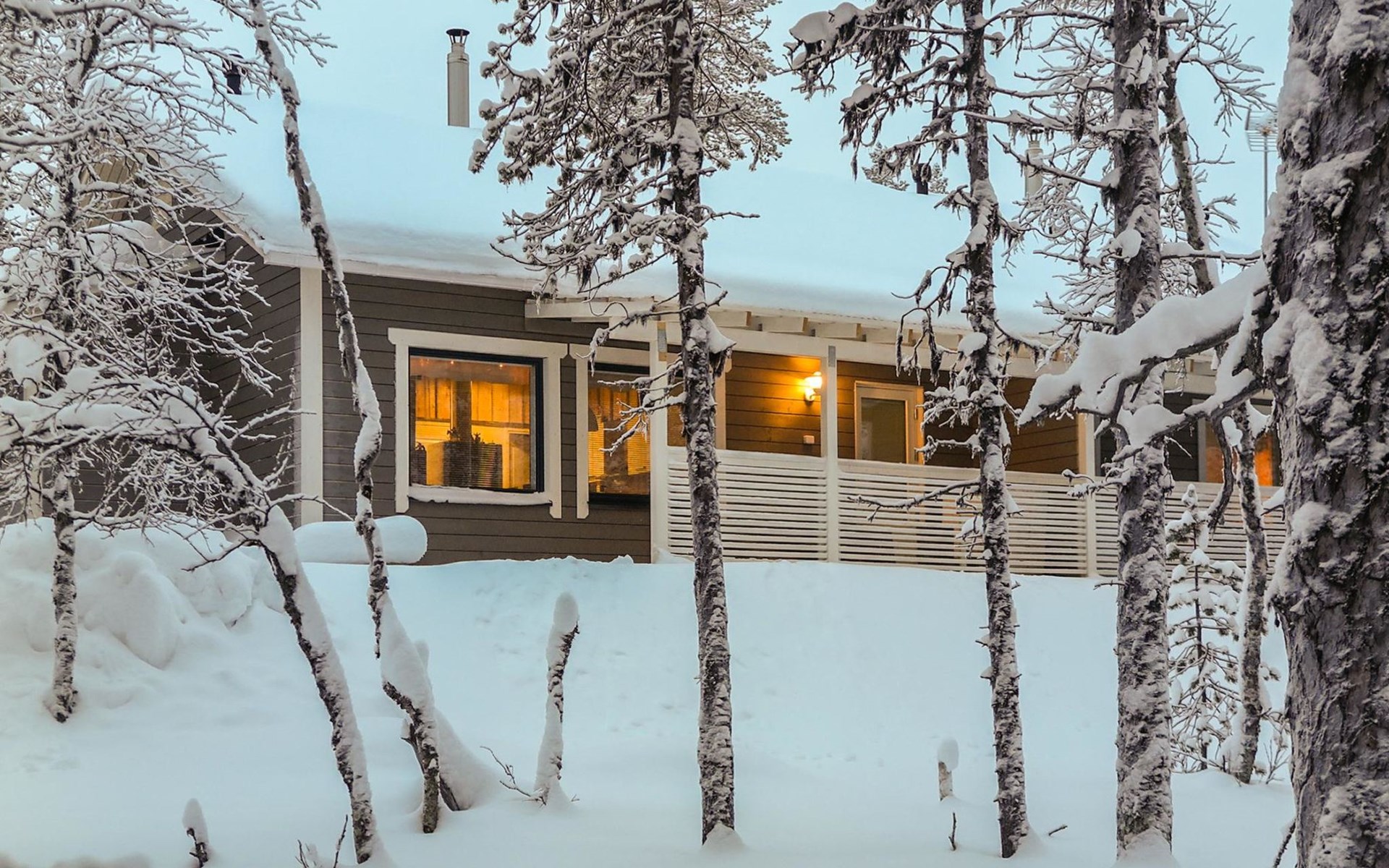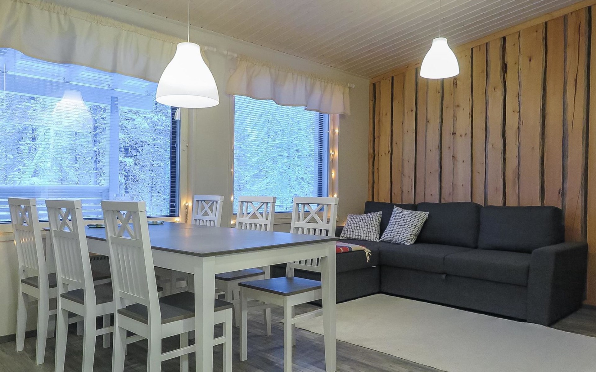 Apartment in semi-detached wooden house, built in 2019. Living room/kitchen with convertible sofa, 2 bedrooms with 2 beds, sauna, washroom/WC, separate WC, covered open veranda and storeroom.