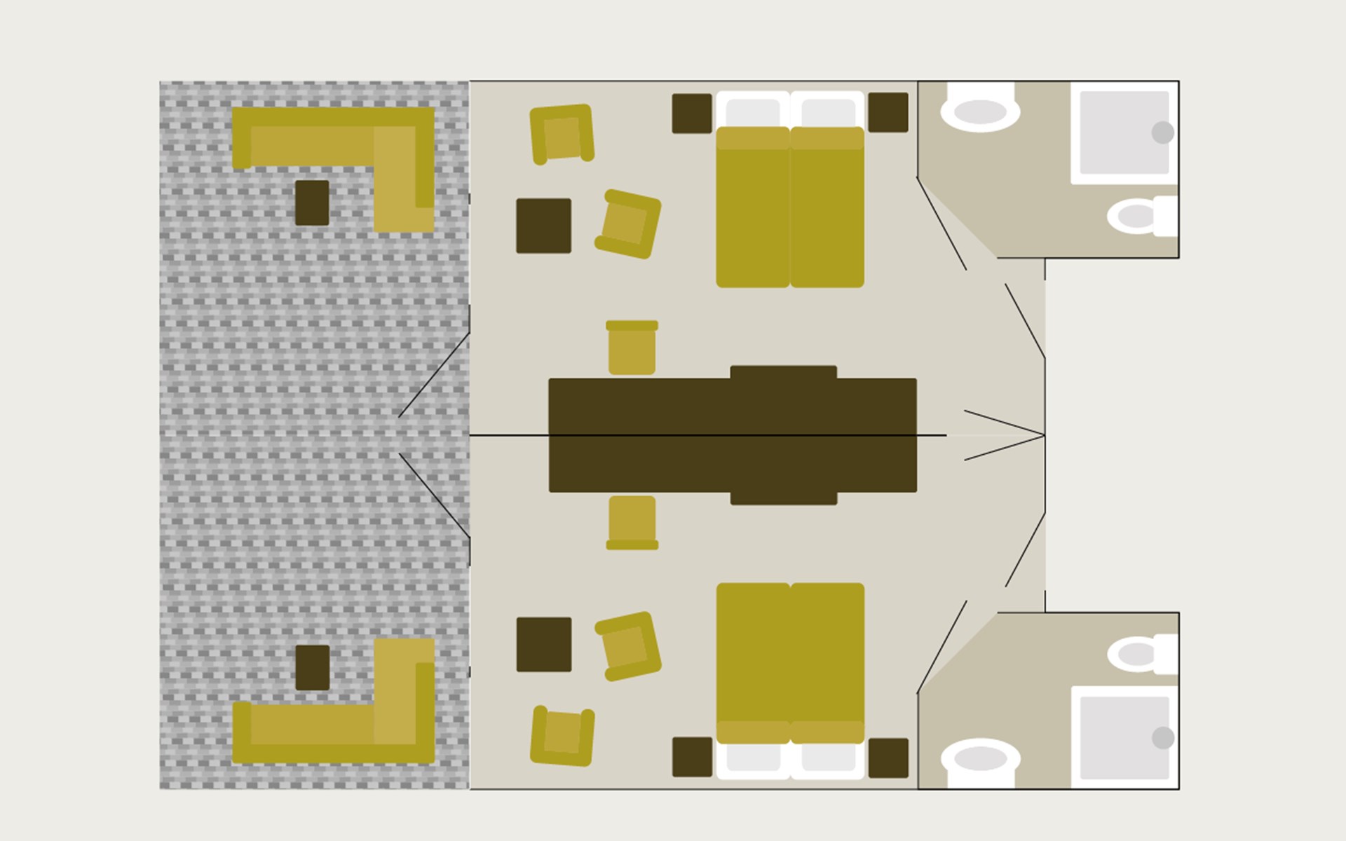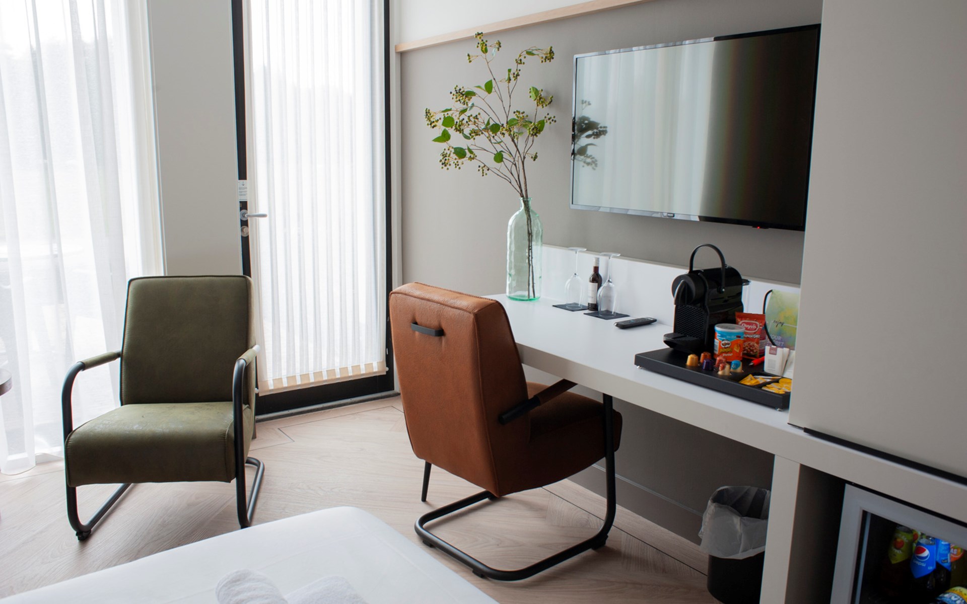 Op 5-sterren Recreatiepark De Boshoek beleef je een unieke vakantie in een luxe hotelkamer voor 4 personen, ideaal voor een ontspannen uitje met het gezin of vrienden. Deze geschakelde hotelkamers bieden je het comfort van een hotel met de charme van de natuur, waar je kunt genieten van een luxe badkamer, airconditioning, een Nespresso koffiemachine, en een flatscreen TV. De kamers zijn volledig ingericht voor een zorgeloos verblijf, met twee comfortabele boxspringbedden, een zitje en een waterkoker. Je hebt de beschikking over twee badkamers en kunt bij mooi weer lekker buiten zitten op je privéterras, met uitzicht op het groene weiland.