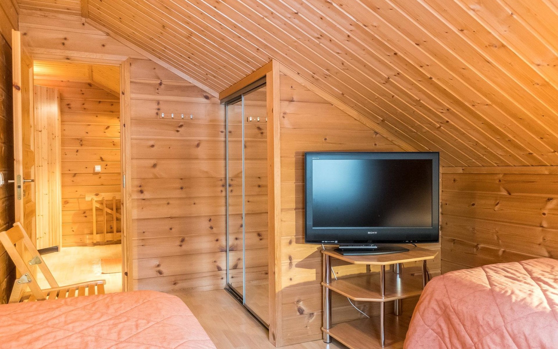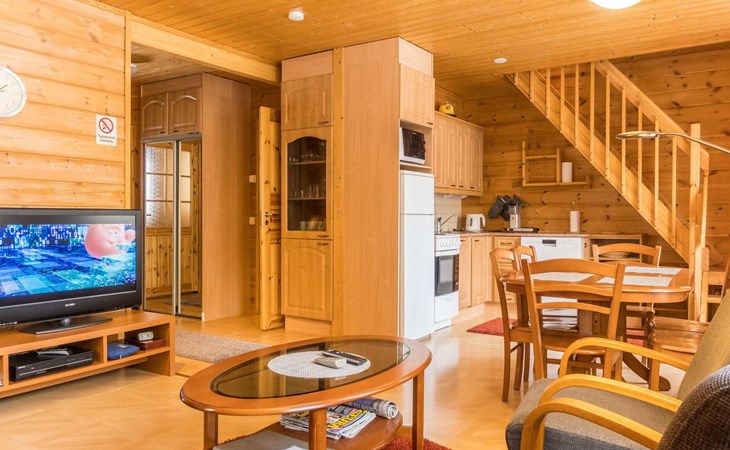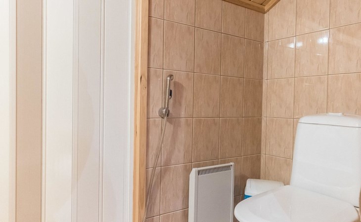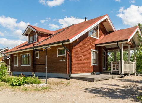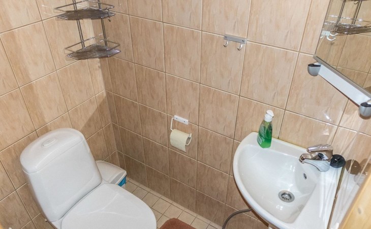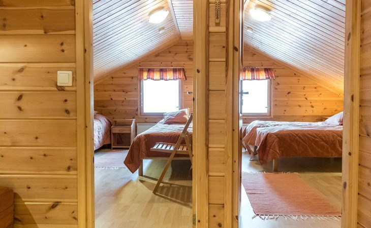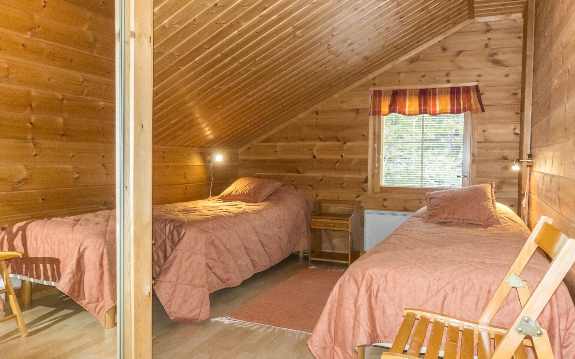 A semi-detached house, built in 2005, sauna is renovated in 2011. Ground floor: kitchen/livingroom, bedroom with 2 beds, sauna (electric stove), bathroom (2 showers), separate toilet, small open veranda. Upstairs: 2 bedrooms, both with 2 beds, bedrooms has sloping roofs, toilet also upstairs, lounge area.