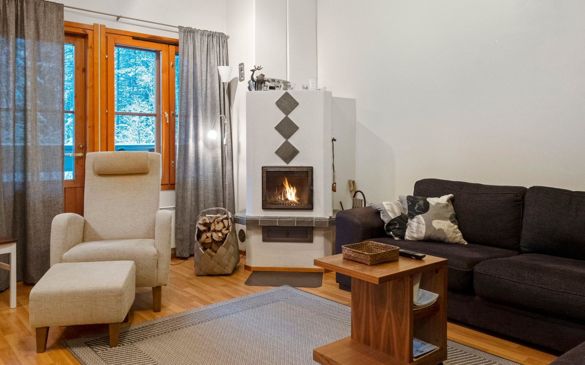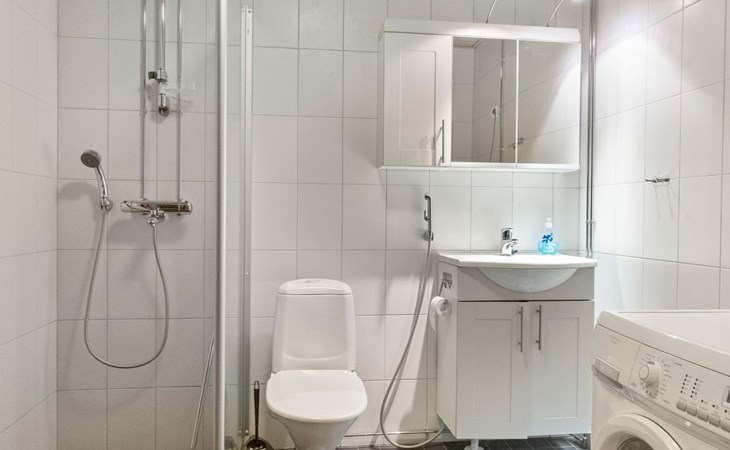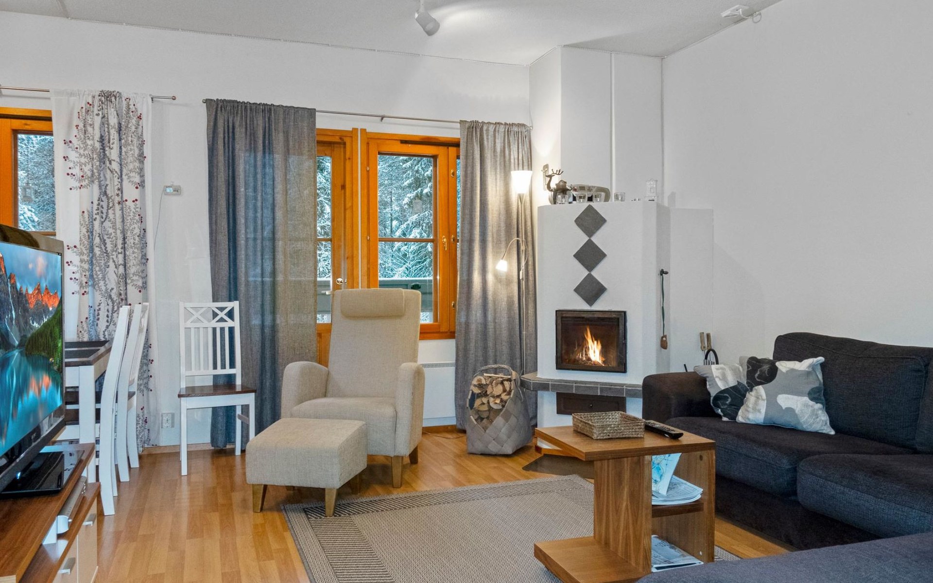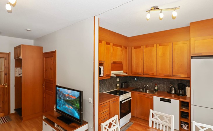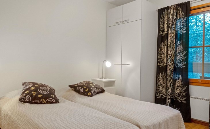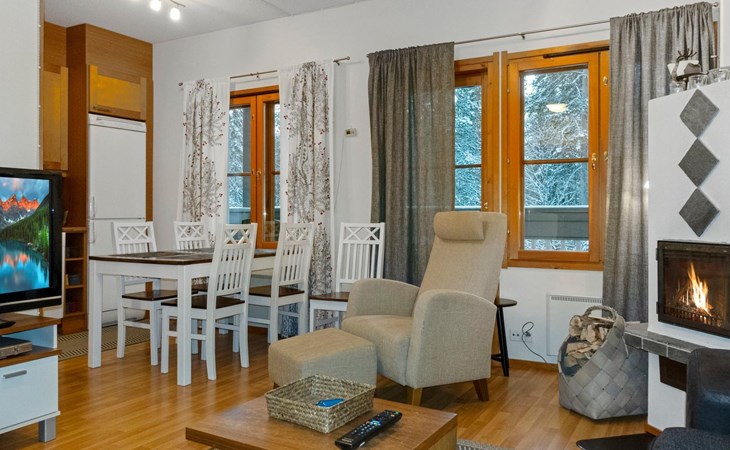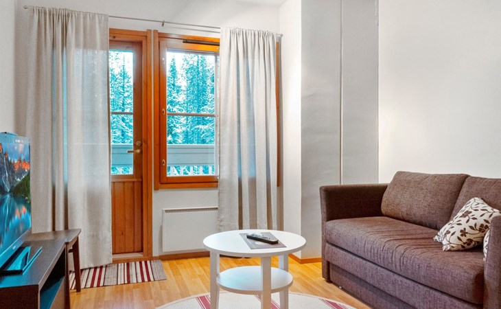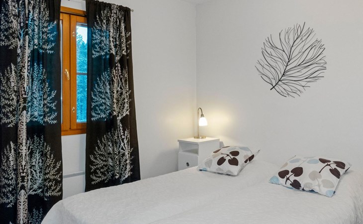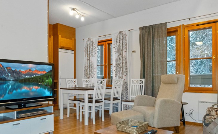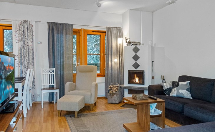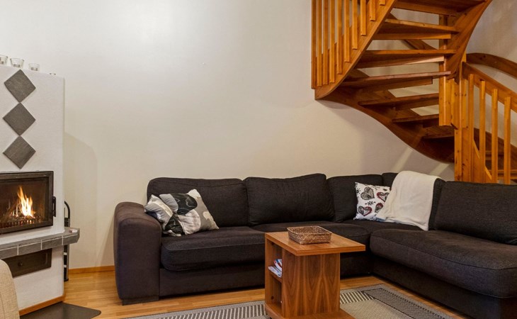 On the lower floor there is living room, kitchenette, sauna, washroom/WC and spacious balcony. On the second floor 2 bedrooms, each with 2 single beds, lounge with sofa bed and folding mattress, WC and shower also on second floor, balcony. Parking space with wall outlet for the car. Unheated ski storage.
