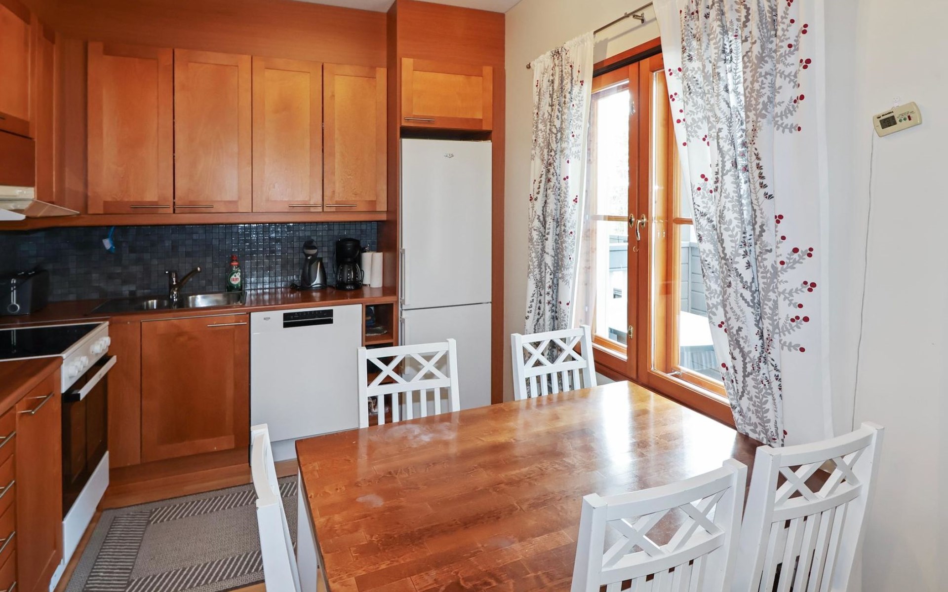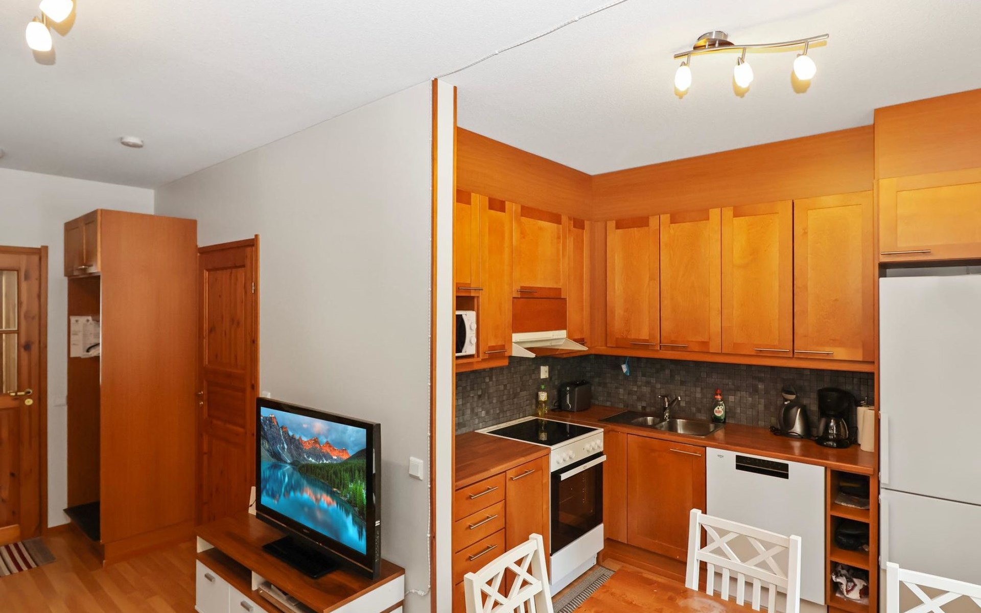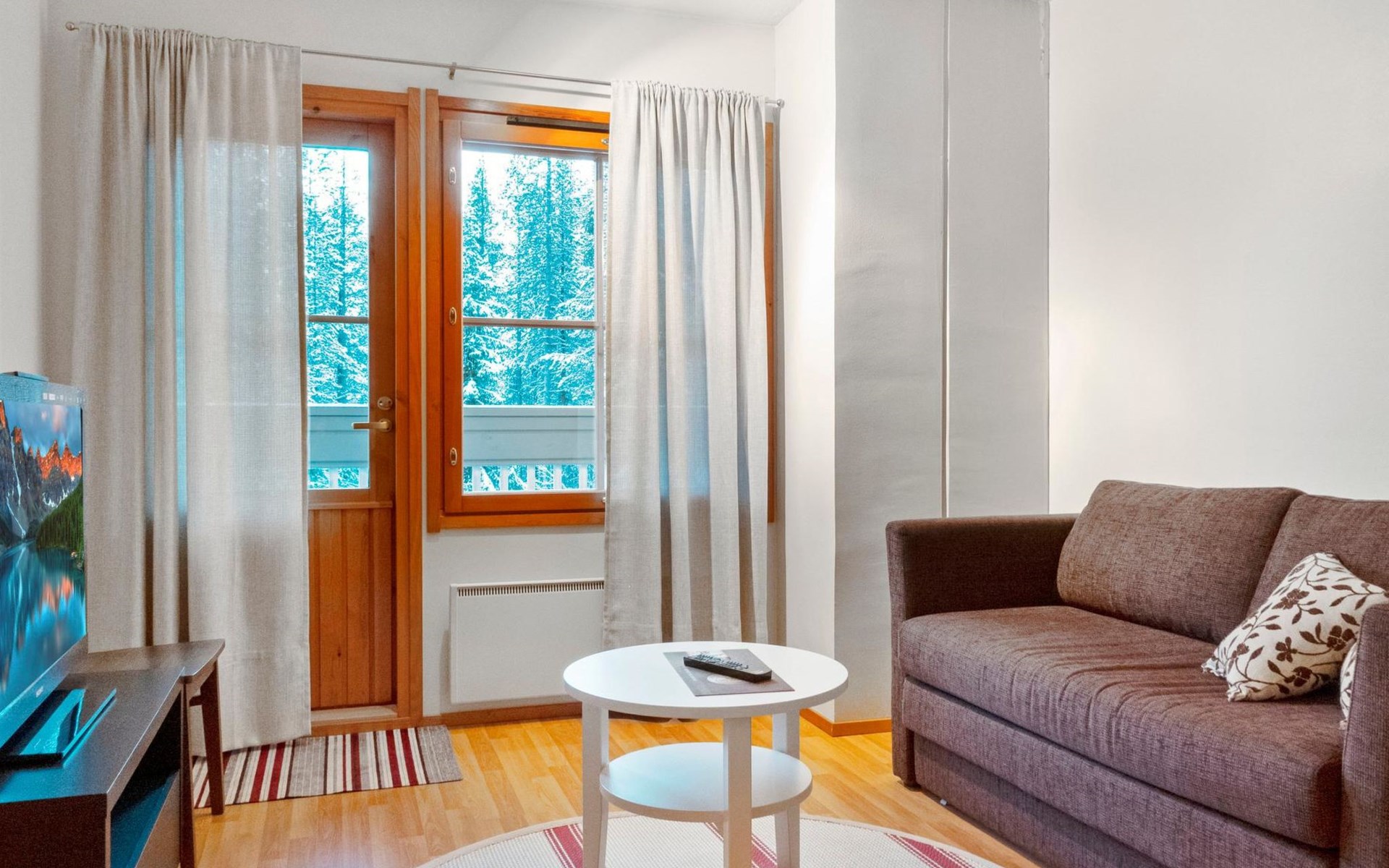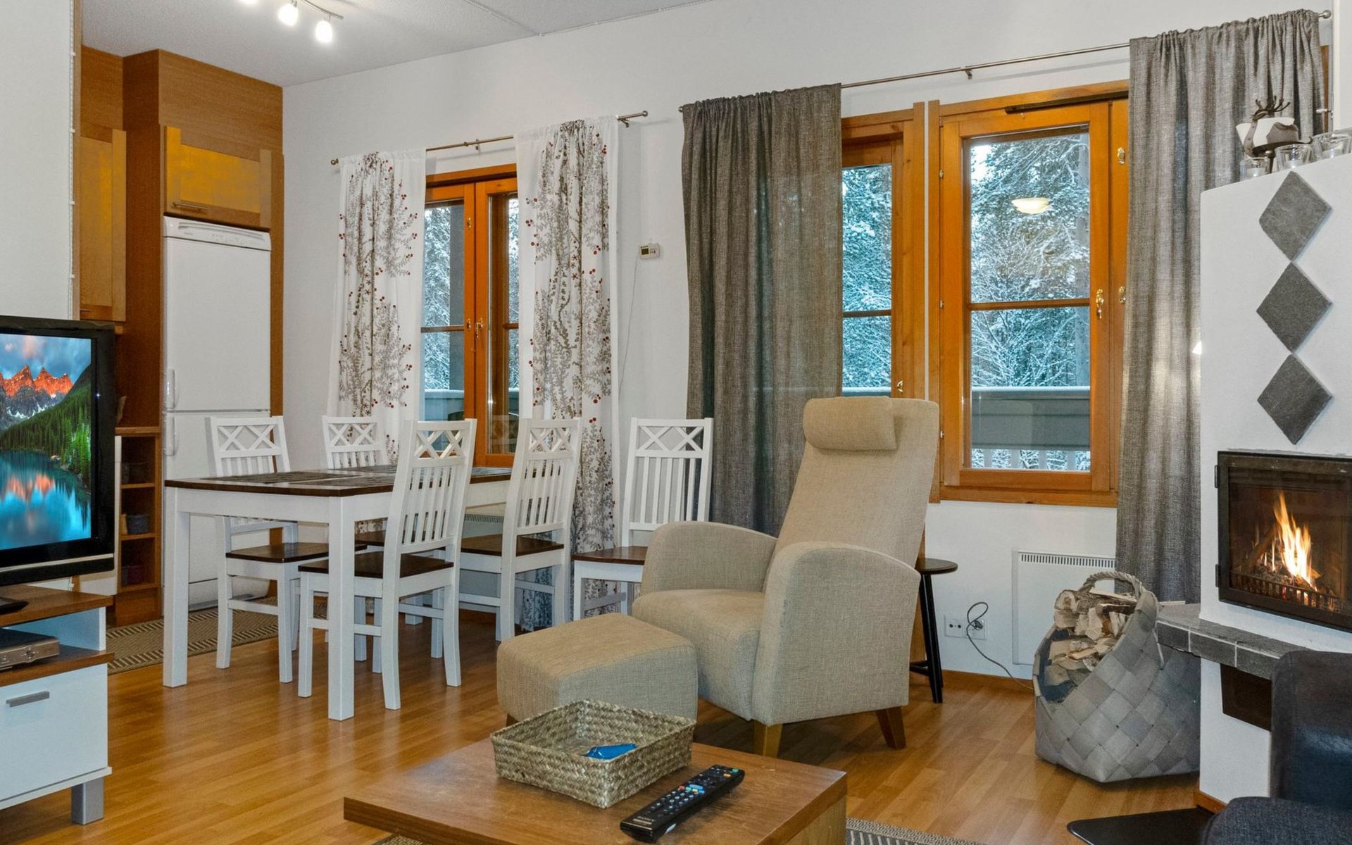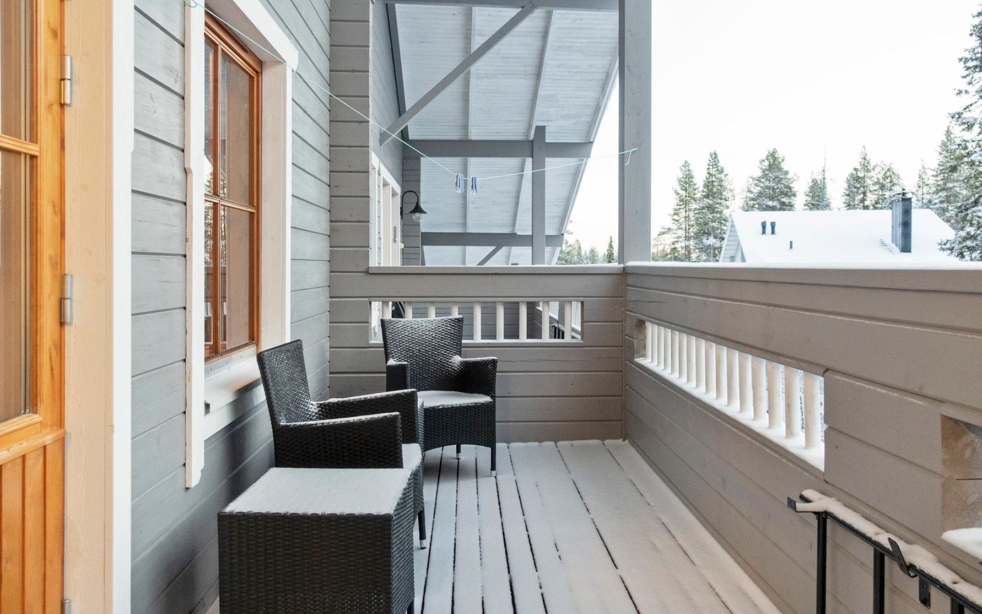 On the lower floor there is living room, kitchenette, sauna, washroom/WC and spacious balcony. On the second floor 2 bedrooms, each with 2 single beds, lounge with sofa bed and folding mattress, WC and shower also on second floor, balcony. Parking space with wall outlet for the car. Unheated ski storage.