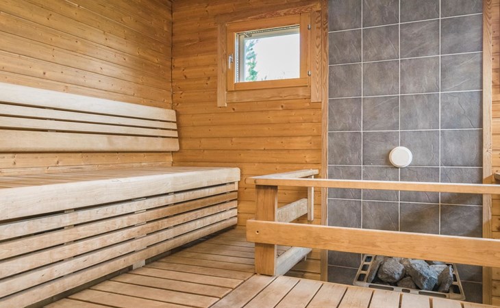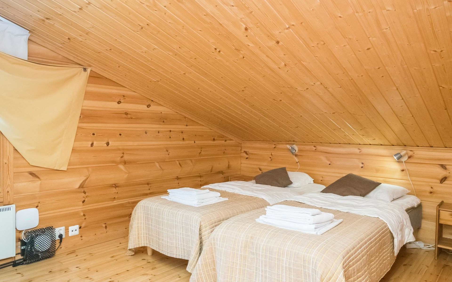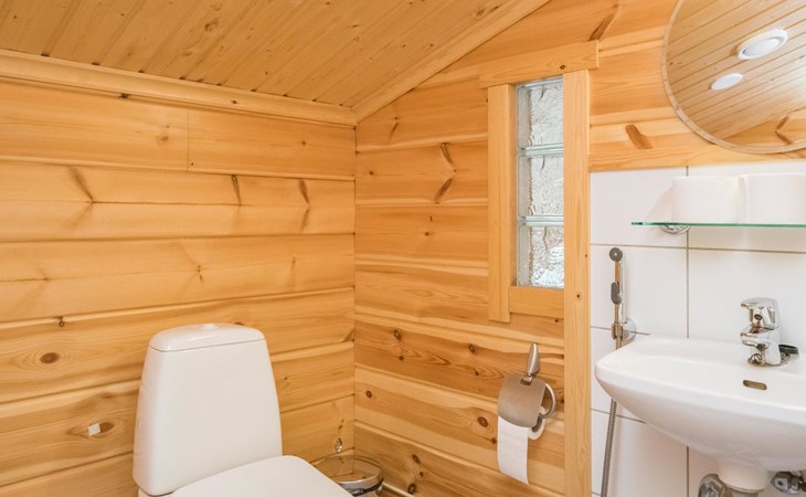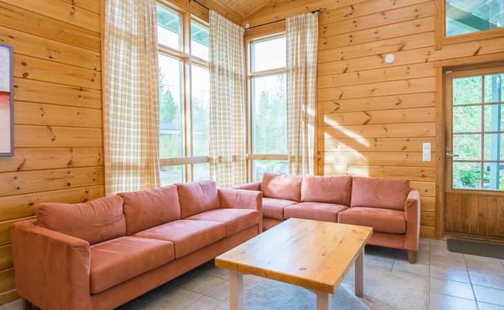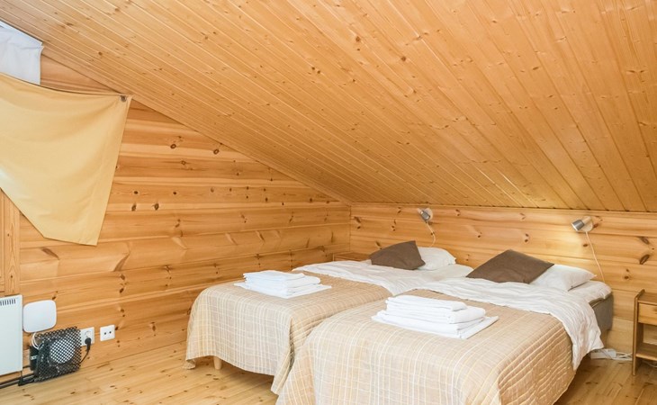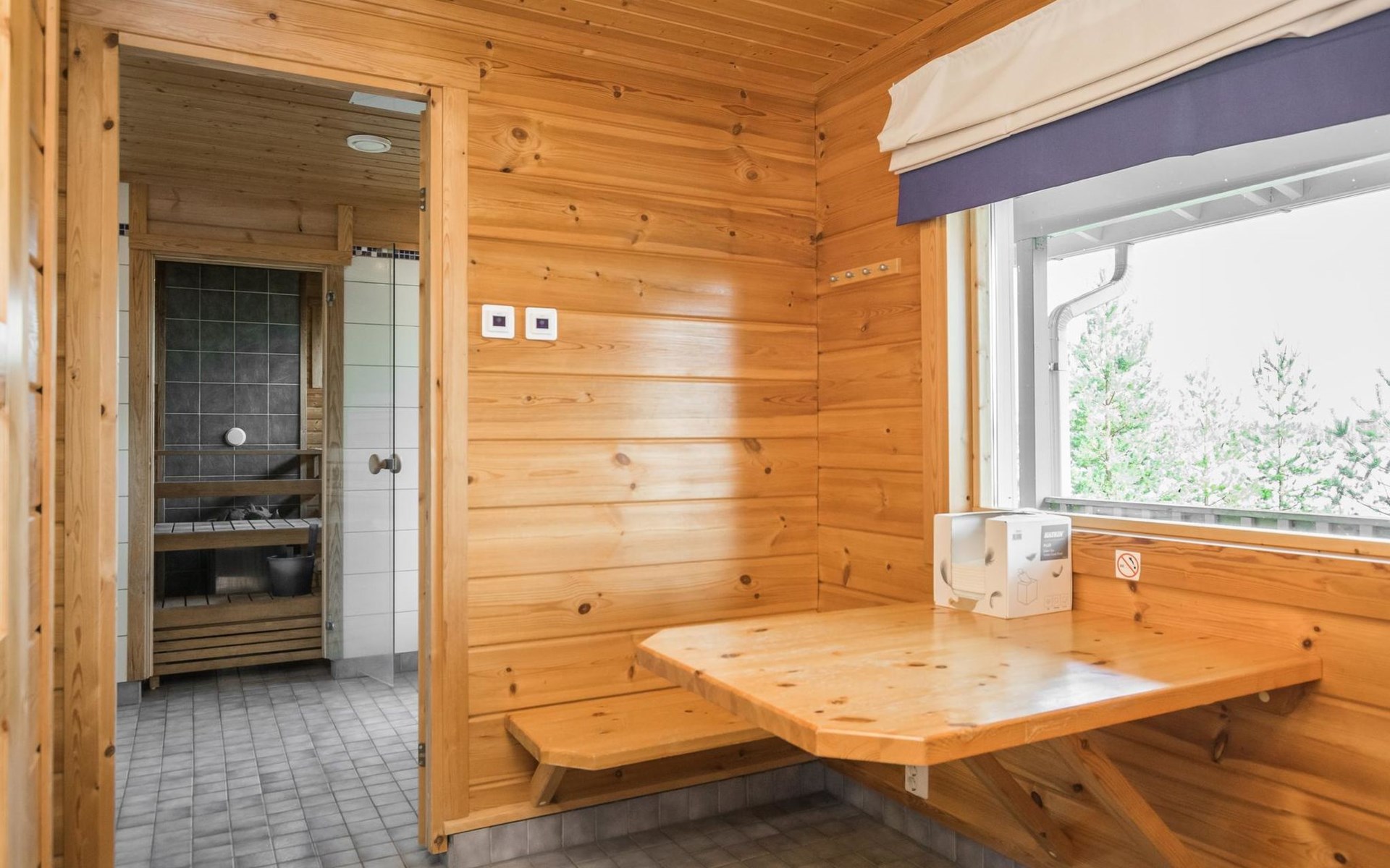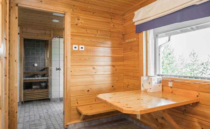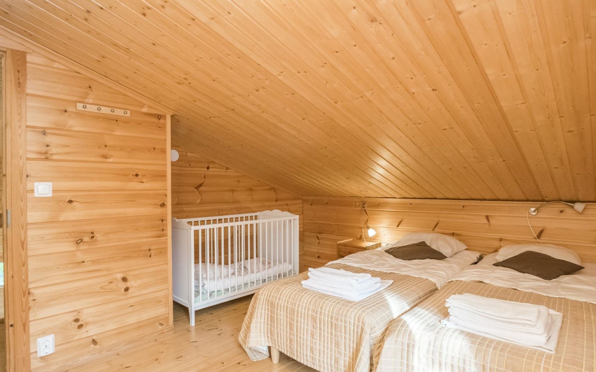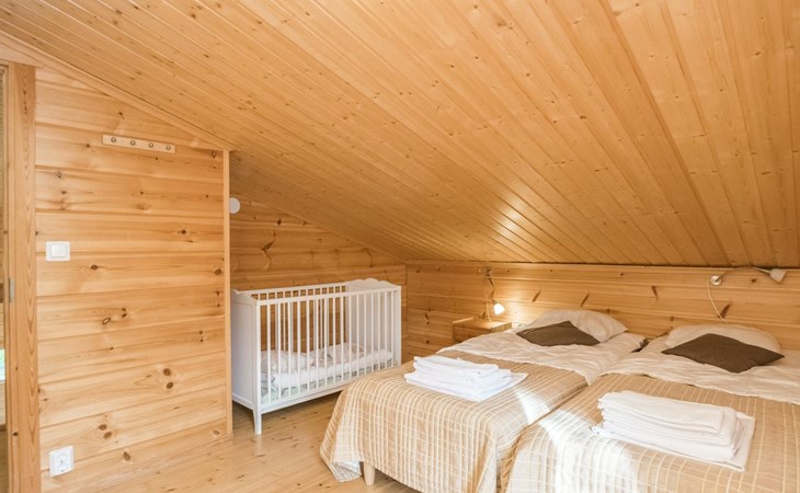 Log chalet 2003, living room/kitchen. Downstairs 2 bedrooms with 2 beds in each, WC. Upstairs 2 bedrooms with 2 beds in each, WC. Separate sauna area with the dressing room, washroom (2 showers), sauna (electric stove), WC. Entrance to sauna department through porch.