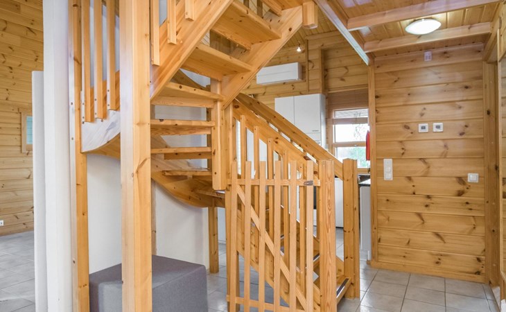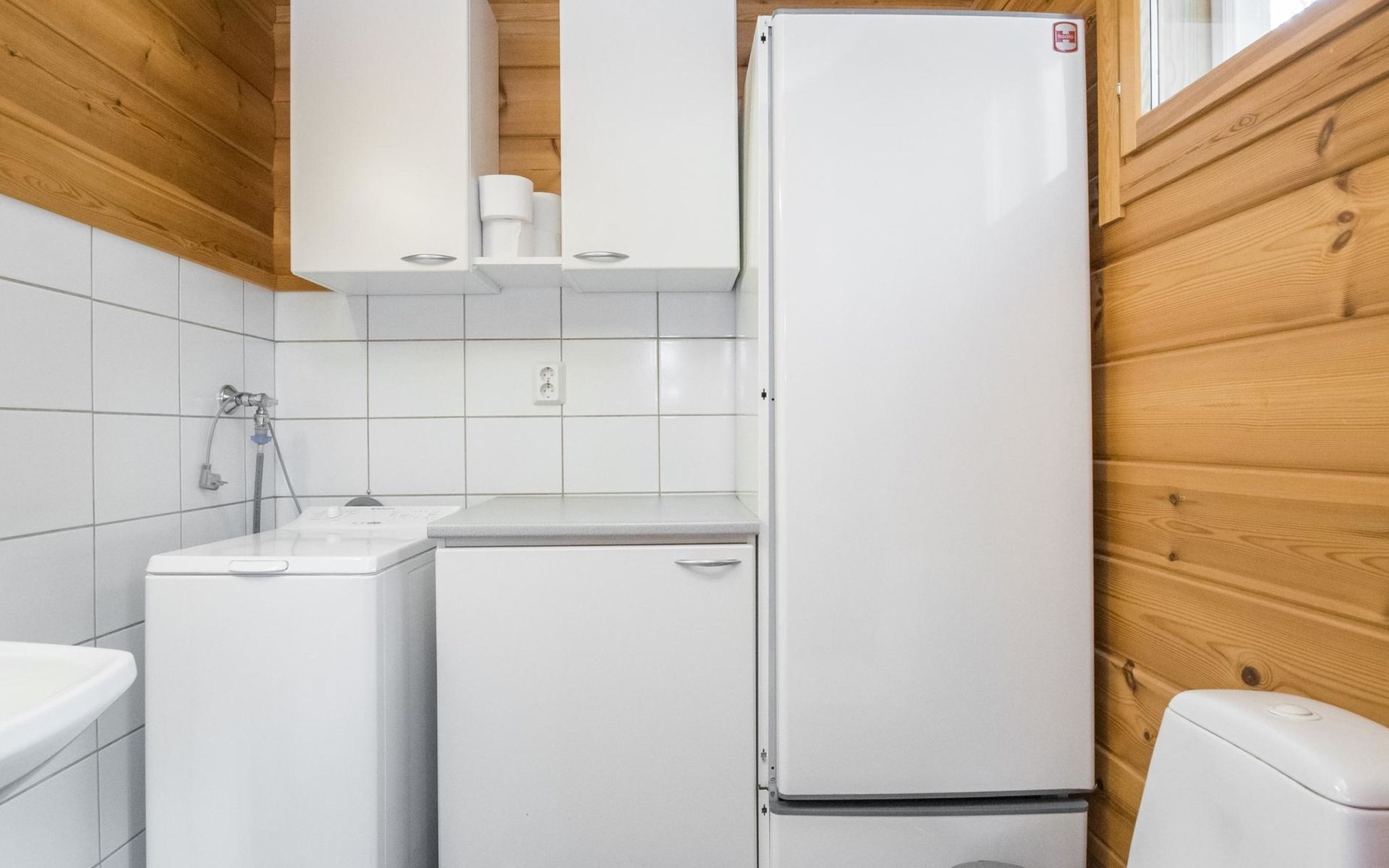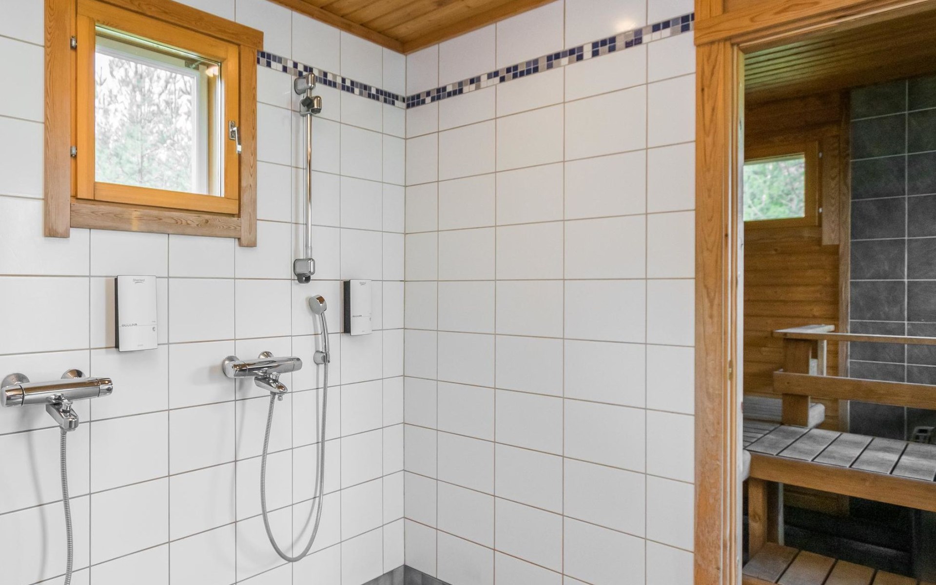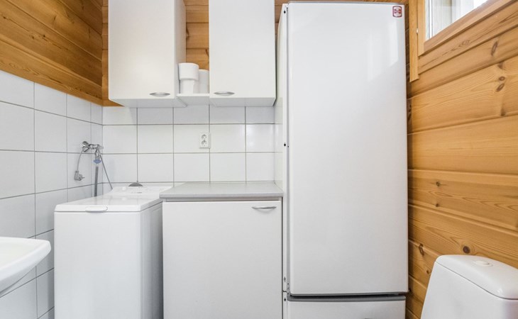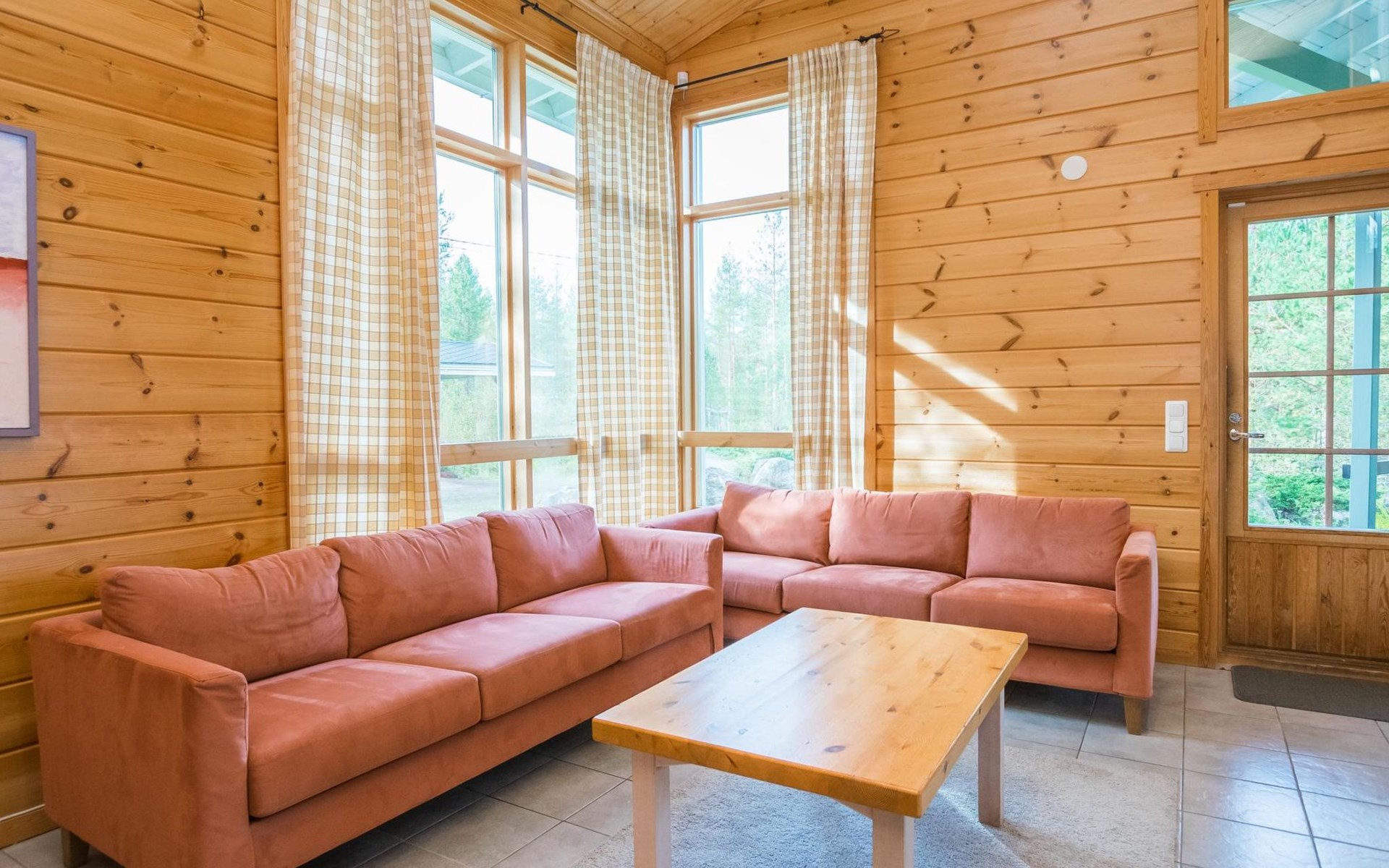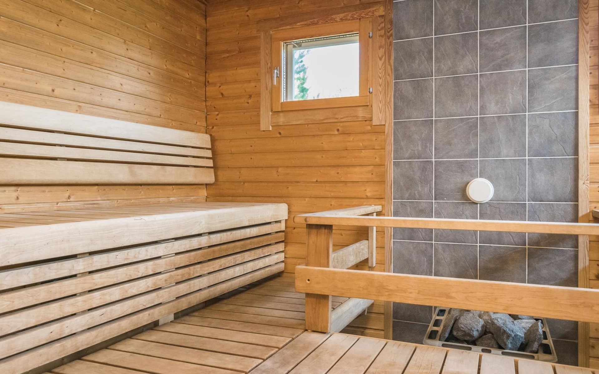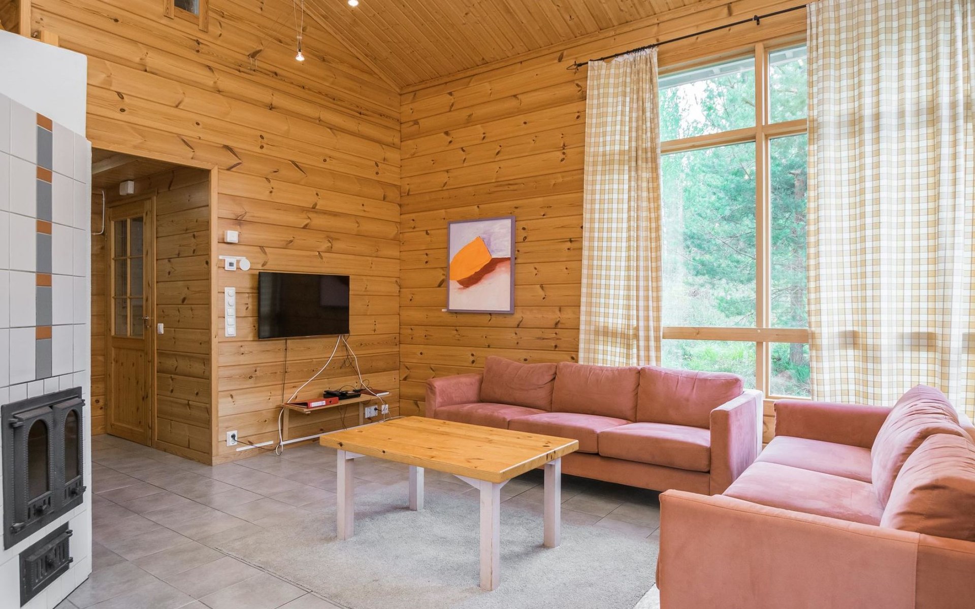 Log chalet 2003, living room/kitchen. Downstairs 2 bedrooms with 2 beds in each, WC. Upstairs 2 bedrooms with 2 beds in each, WC. Separate sauna area with the dressing room, washroom (2 showers), sauna (electric stove), WC. Entrance to sauna department through porch.