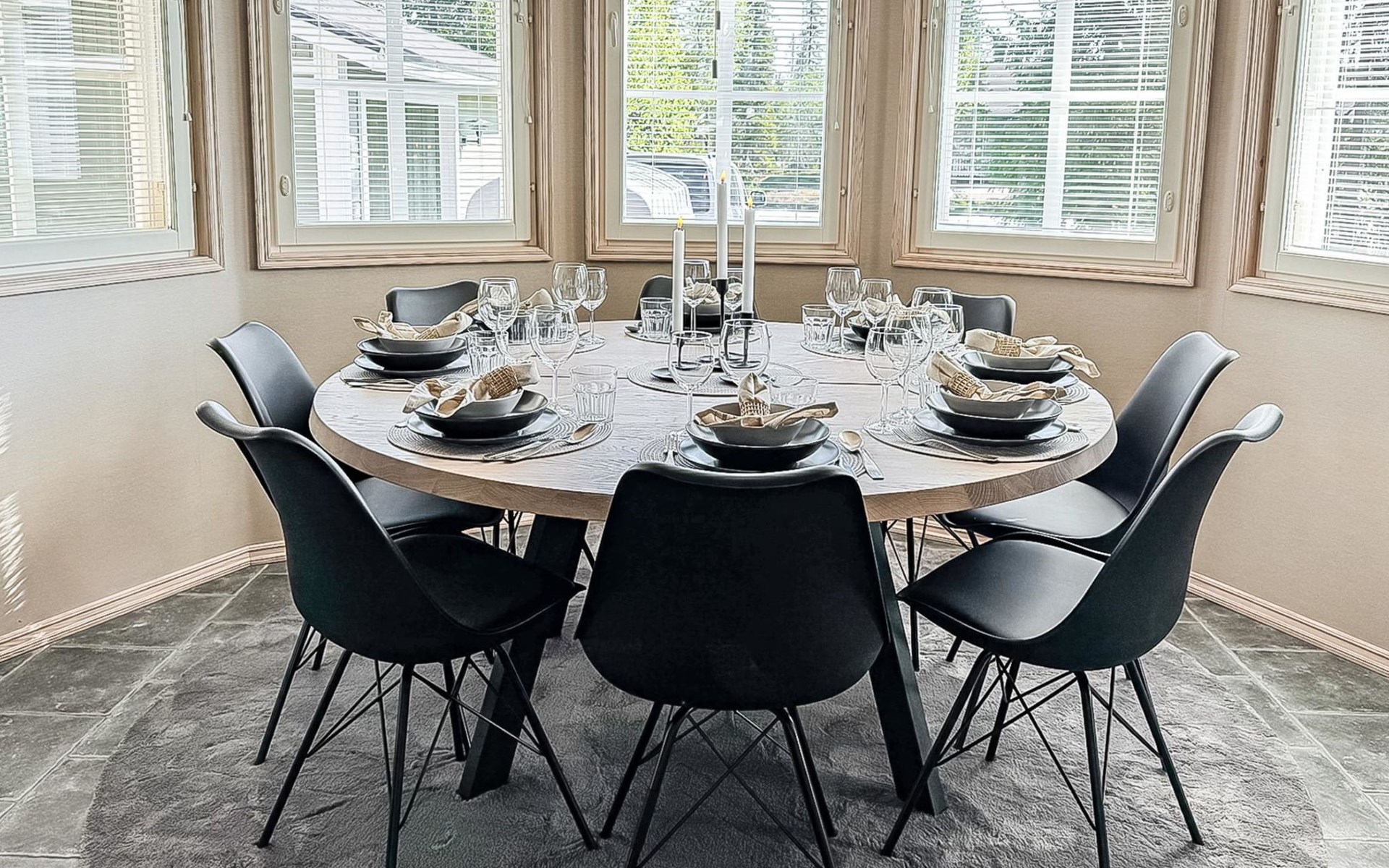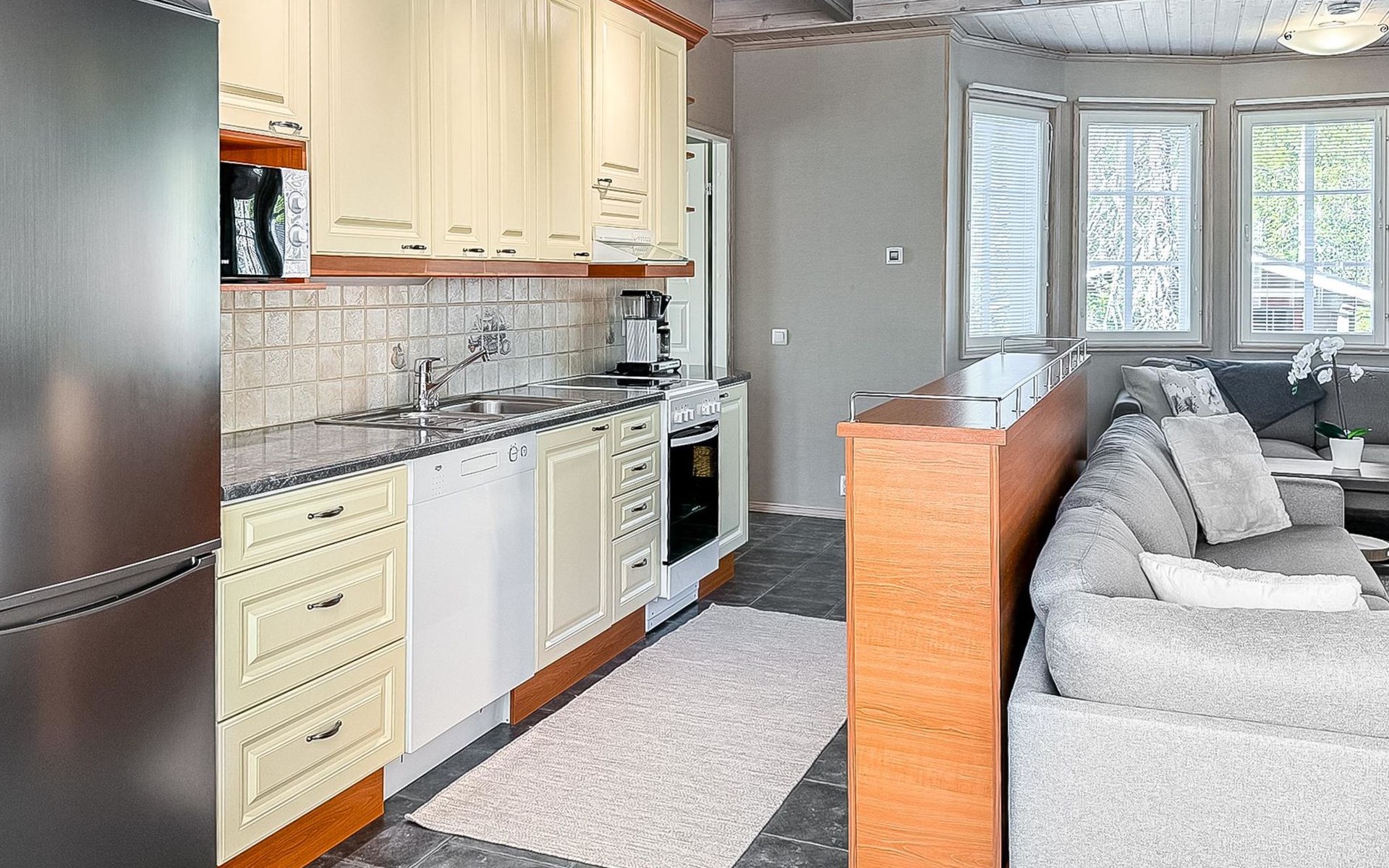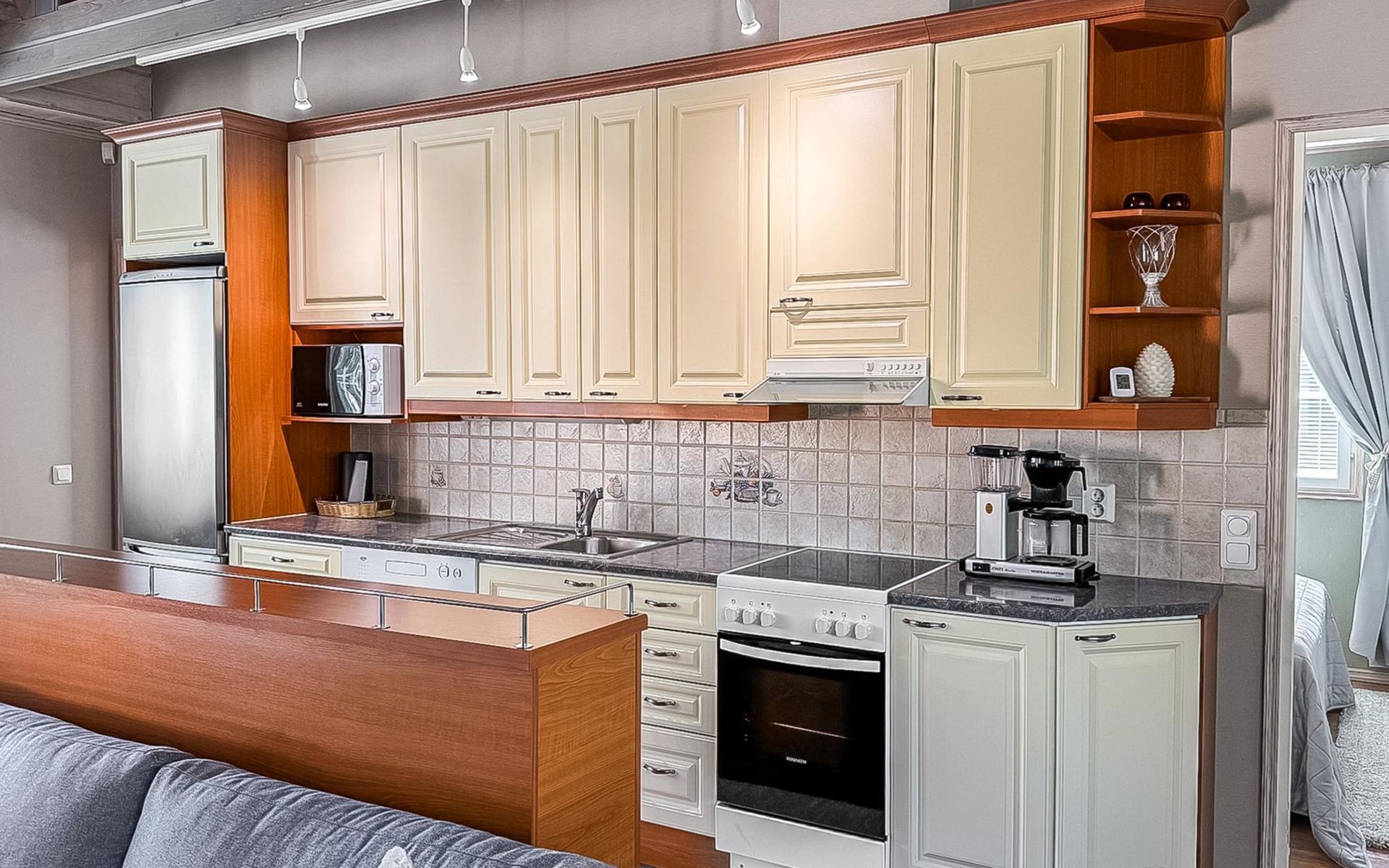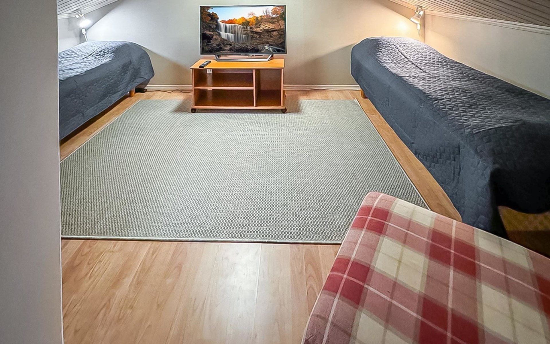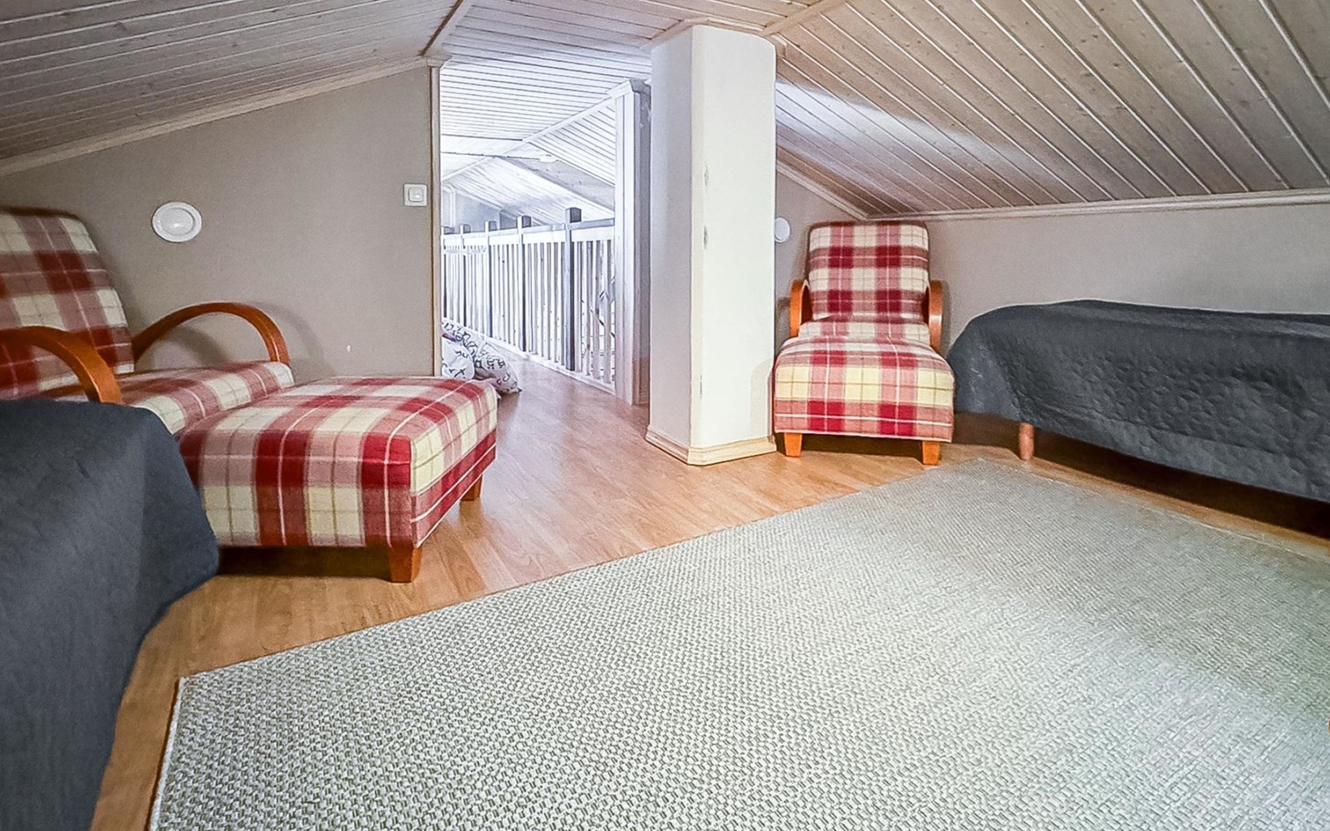 The ground floor features two bedrooms, each with a double bed, and the loft has two bedrooms, each with two single beds. Loft size 20 m2. There is a two stools in the living room that can convert into a mattress. The well-equipped, spacious, living room/kitchen allows for comfortable gatherings.