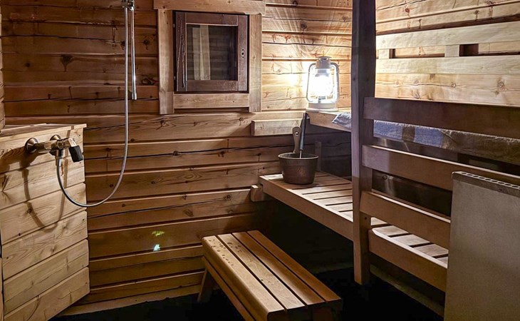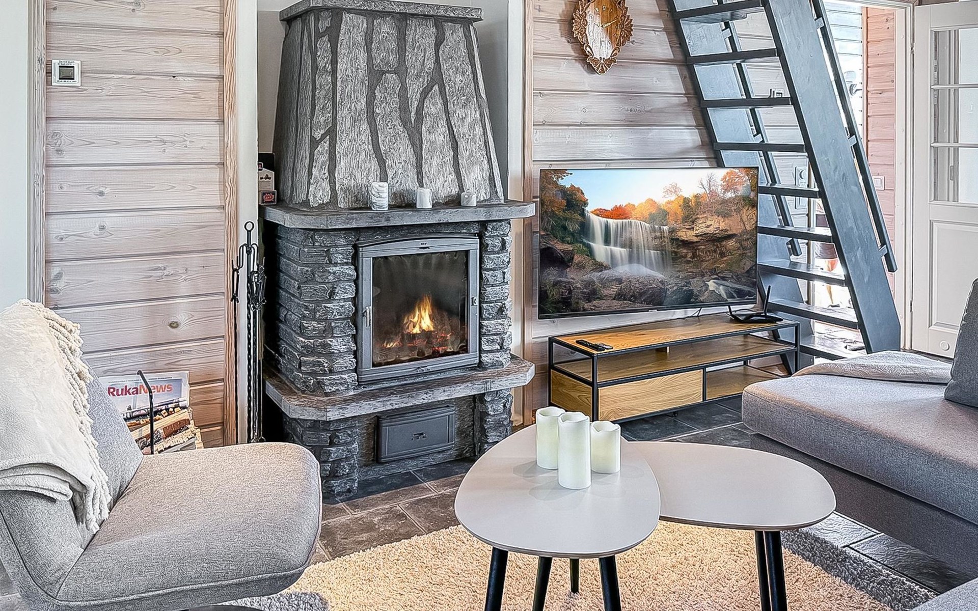 The cabin features an electric sauna and a charming wood-heated yard sauna, perfect for relaxation after an active day. The Vuosseli area in Ruka offers an excellent location with easy access to diverse outdoor activities year-round. The Ski bus stop is just 200 meters away, making it effortless to reach Ruka’s services.