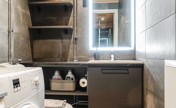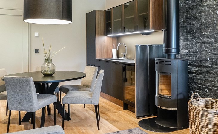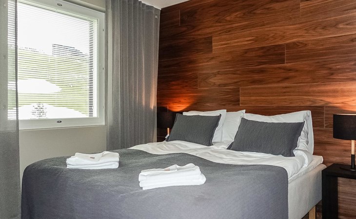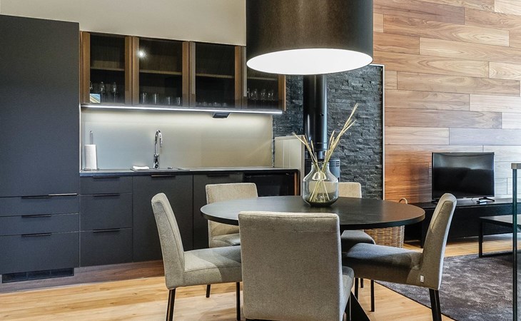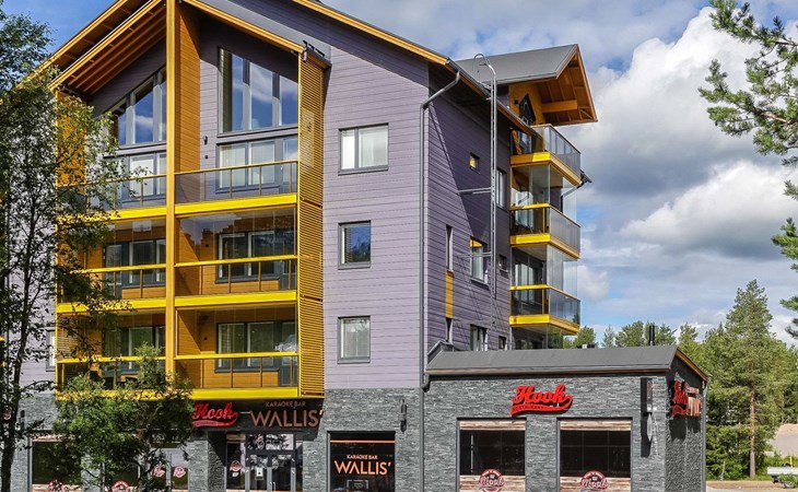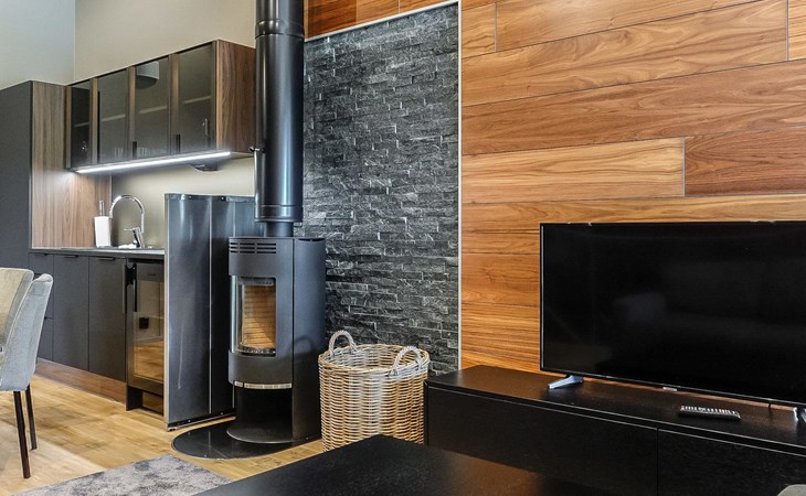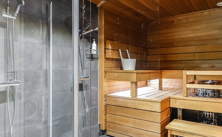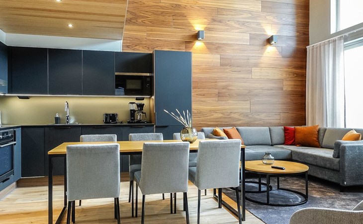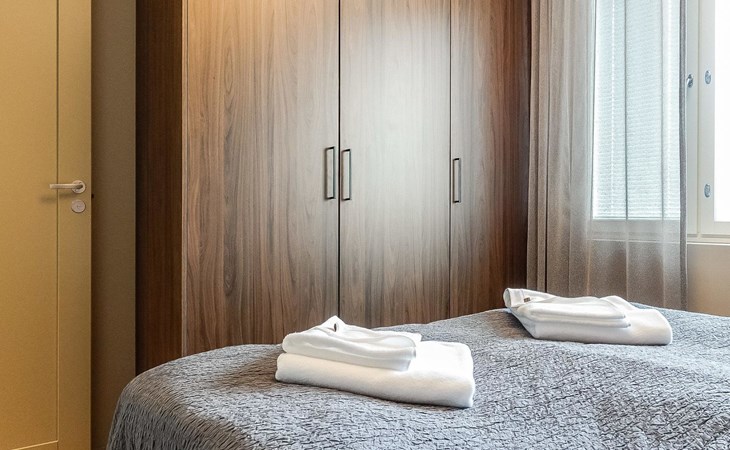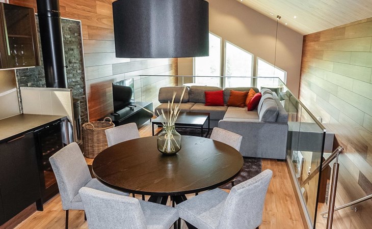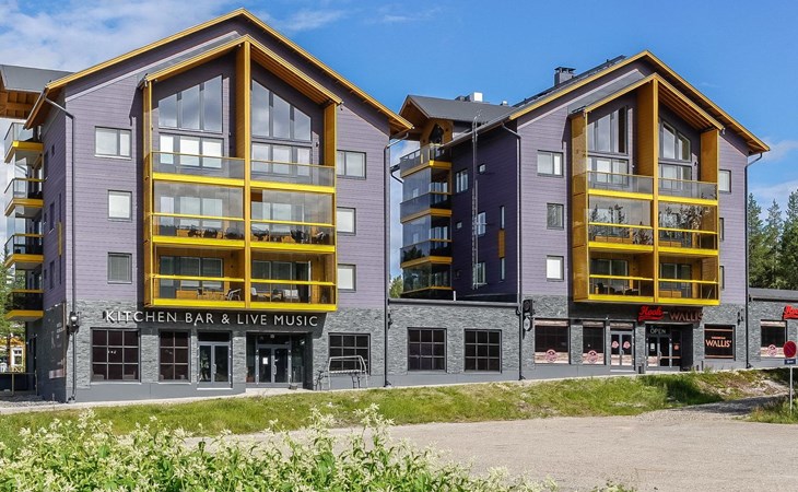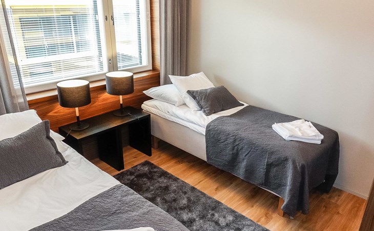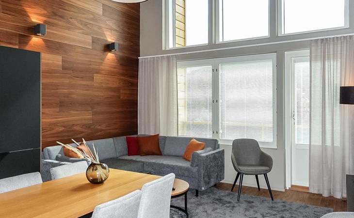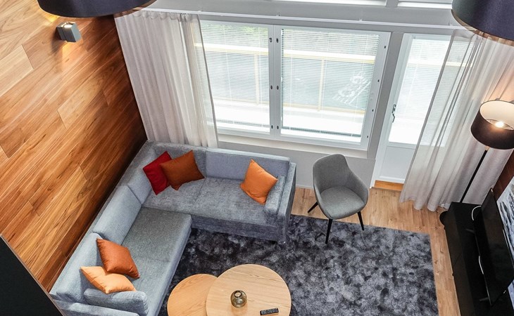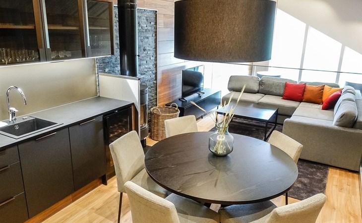 Livingroom / kitchen with aorner sofa, which can be converted into beds for 1-2 people if needed (mainly for children), three bedrooms, one with double bed and others with two single beds. One of the bedrooms is on the upper floor, access to balcony from this room. Sauna and living areas are also located on the upper floor. Upstairs living area is equipped with sofa bed, for 1-2 persons, light fireplace, kitchen with sink, fridge and cupboard. There are two WCs in the apartment, shower also in downstairs within the WC. Another is upstairs in the sauna area.