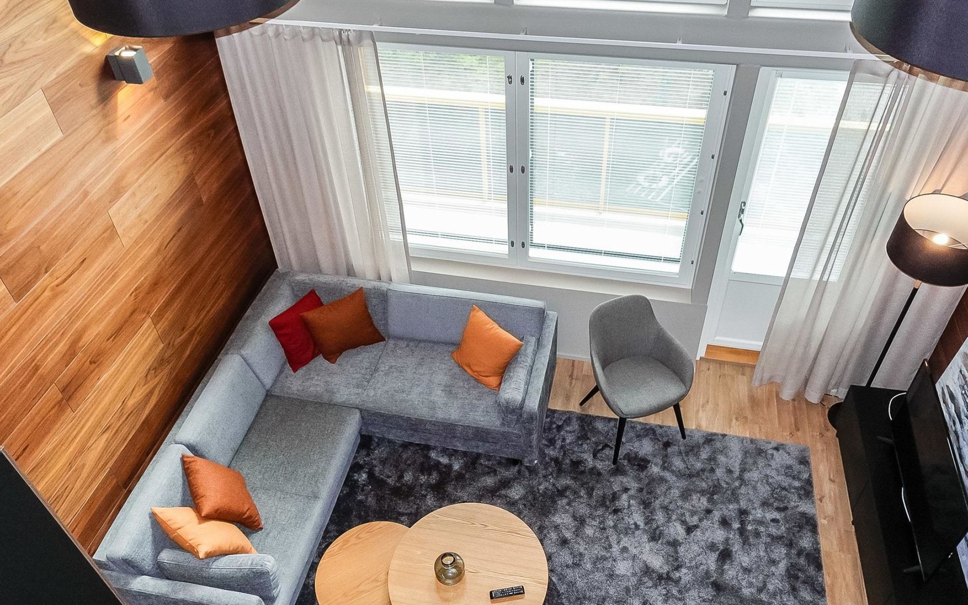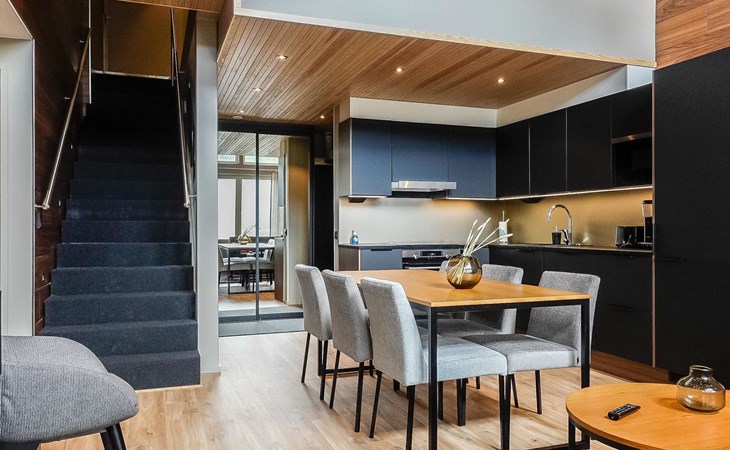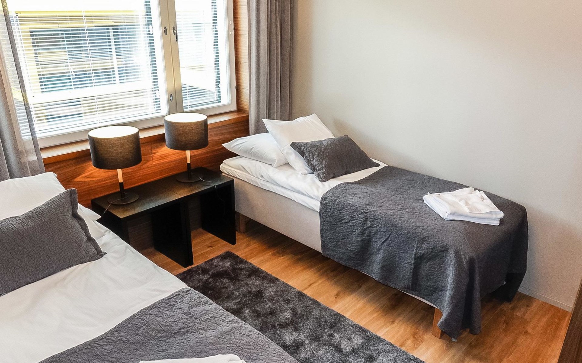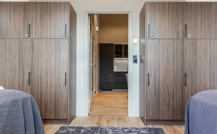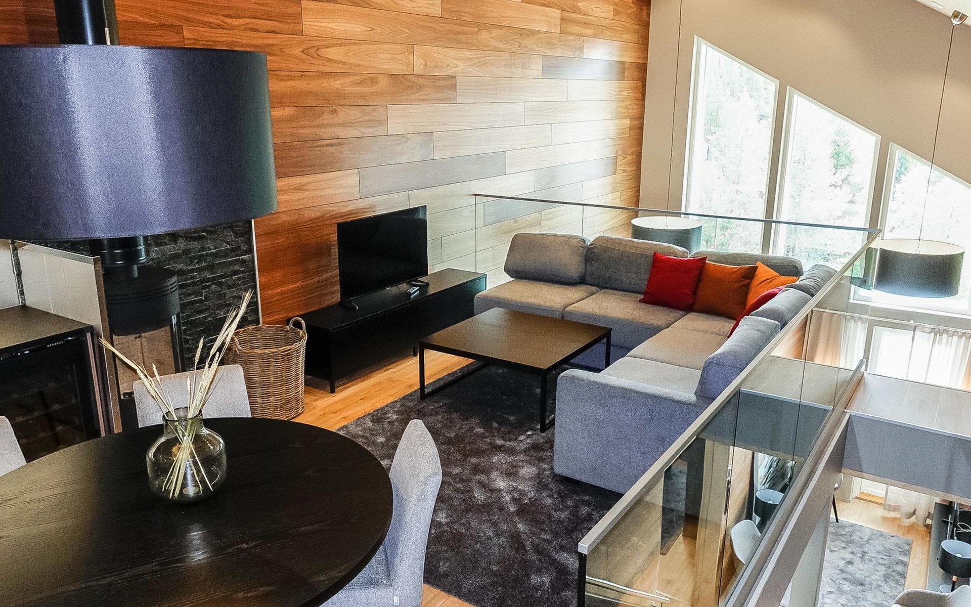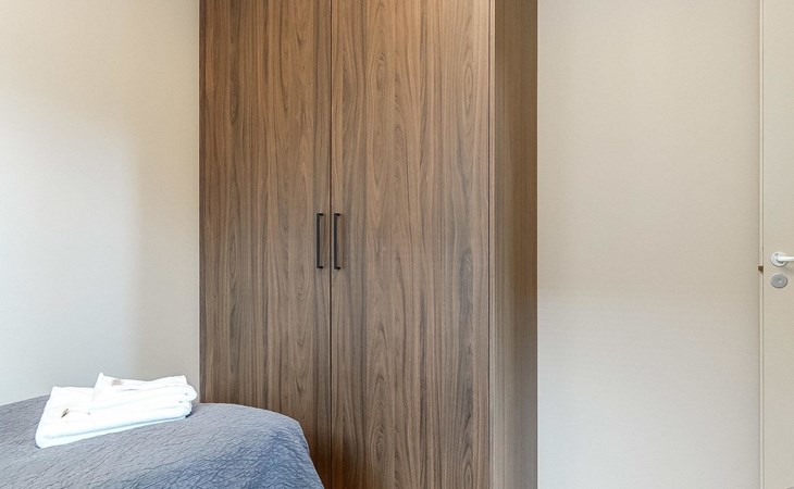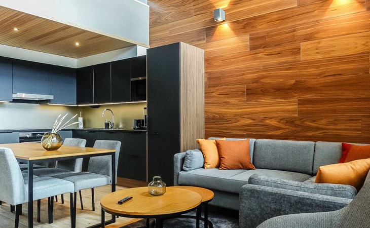 Livingroom / kitchen with aorner sofa, which can be converted into beds for 1-2 people if needed (mainly for children), three bedrooms, one with double bed and others with two single beds. One of the bedrooms is on the upper floor, access to balcony from this room. Sauna and living areas are also located on the upper floor. Upstairs living area is equipped with sofa bed, for 1-2 persons, light fireplace, kitchen with sink, fridge and cupboard. There are two WCs in the apartment, shower also in downstairs within the WC. Another is upstairs in the sauna area.